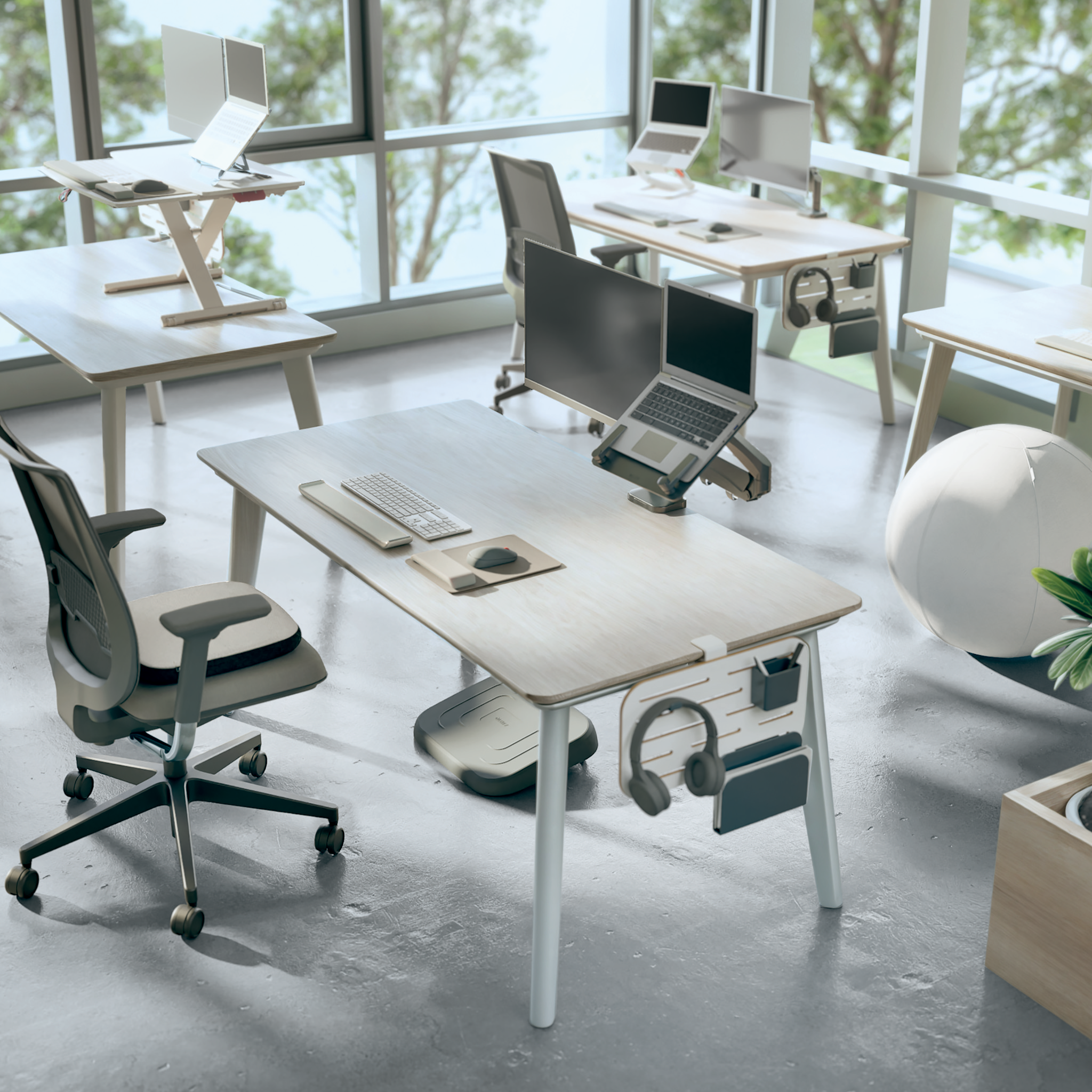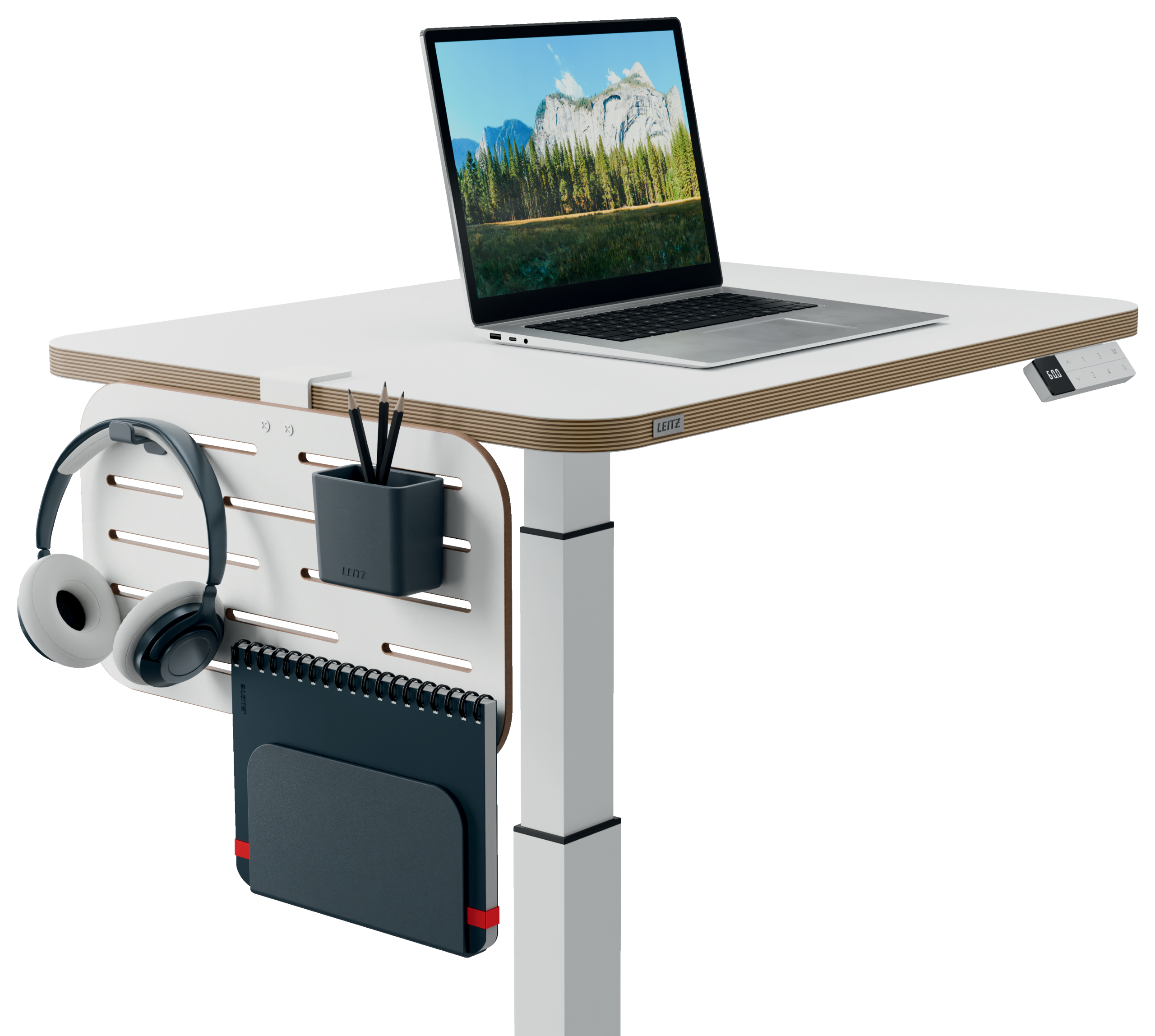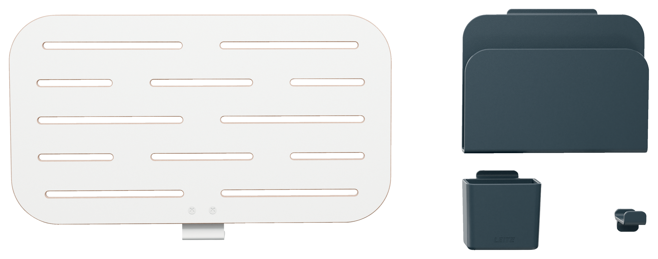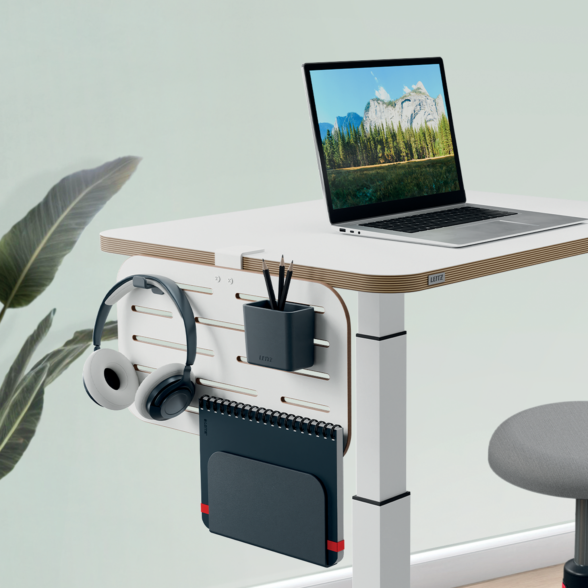 Hold dit skrivebord ryddeligt og få mest muligt ud af den tilgængelige plads med Leitz Ergo pegboard organiseringstavle. Disse unikke organiseringstavler til skrivebordet er nemme at montere ovenpå eller under et skrivebord eller bord og skaber øjeblikkelig opbevaring til alt fra headset til notesblokke og kuglepenne. Hold alle dine væsentlige ting organiseret, nemme at finde og frigør værdifuld plads på skrivebordet. Du skal blot placere det stærke opbevaringstilbehør i 85% recirkulerede plast (1 x notesblokholder, 1 x penneholder og 1 hængekrog til et headset) på organiseringstavlen for at skabe dit eget personlige arbejdsområde. Udviklet i Tyskland og kompatibel med de fleste skriveborde med en maksimal bordpladetykkelse på 35 mm, er pegboard-organiseringstavlen nem at installere og en værdifuld tilføjelse til Leitz Ergo hæve-sænke skriveborde (65340001 eller 65360001). Tavlen er lavet af slidstærkt 8 mm MDF for at sikre styrke og stabilitet, og bløde gummipuder beskytter skrivebordets overflade mod ridser. Denne moderne og minimalistiske pegboard-organiseringstavle er ideel til dit hjem eller kontor for at forbedre komforten og maksimere produktiviteten. Det er vores mission at levere løsninger, der kan give mennesker mulighed for at trives på arbejdet og derudover fremme positiv mental sundhed og fysisk velbefindende. Kombiner med mange andre Leitz Ergo-produkter for at skræddersy din fleksible og individuelle sid, stå & bevæg-arbejdsstation. Hold dig aktiv og HAV DET GODT med Leitz.