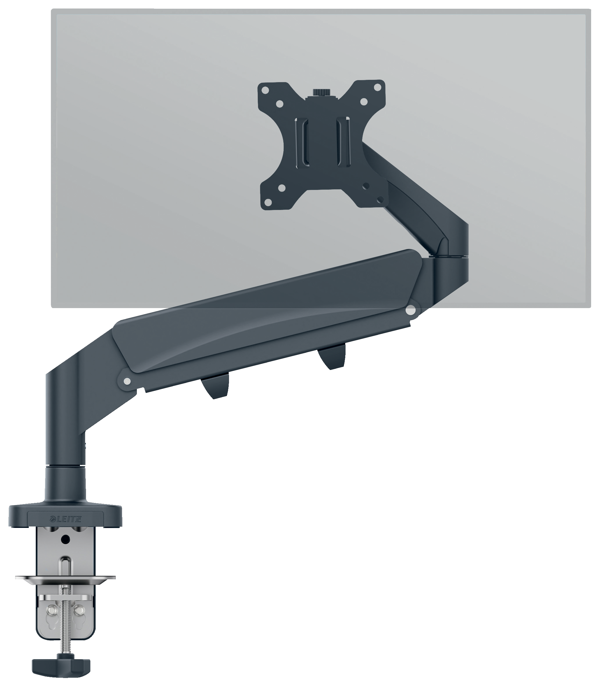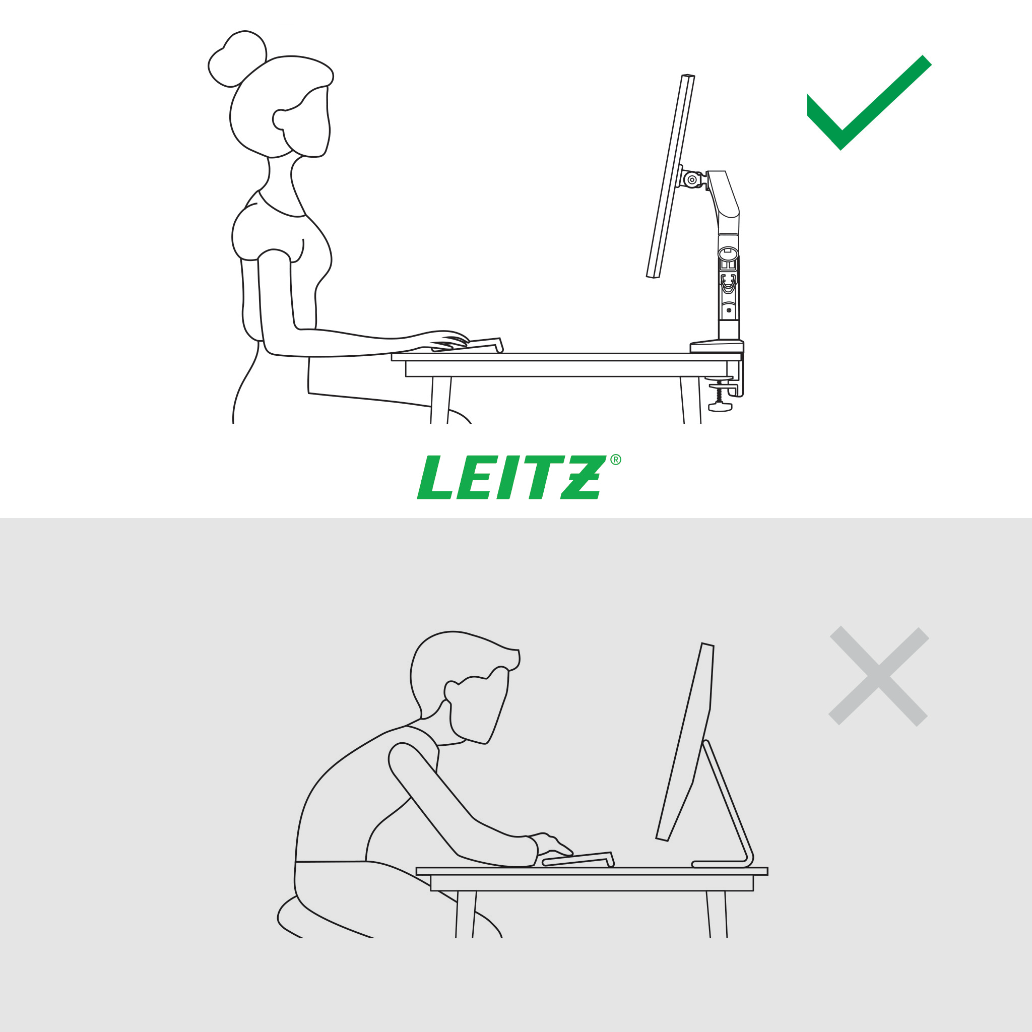Leitz pladsbesparende single monitor arm med TÜV og IGR certificering har en positiv indvirkning på kropsholdningen, fremmer korrekt øjenjustering og understøtter nakke- og skulderkomfort, når skærmens højde justeres korrekt, og som anbefalet, til den ideelle ergonomiske position. Skærmholderen forbliver stabilt i alle højder og vinkler og kan nemt skiftes mellem liggende og stående tilstand. Designet er ideelt til steder, hvor pladsen er trang, og det frigør værdifuld plads på skrivebordet takket være de ultra fleksible arme, som nemt kan foldes flat, vippe, og bevæges i enhver retning ved brug af én hånd. Ergonomisk designet til at fremme velvære og øge produktiviteten.