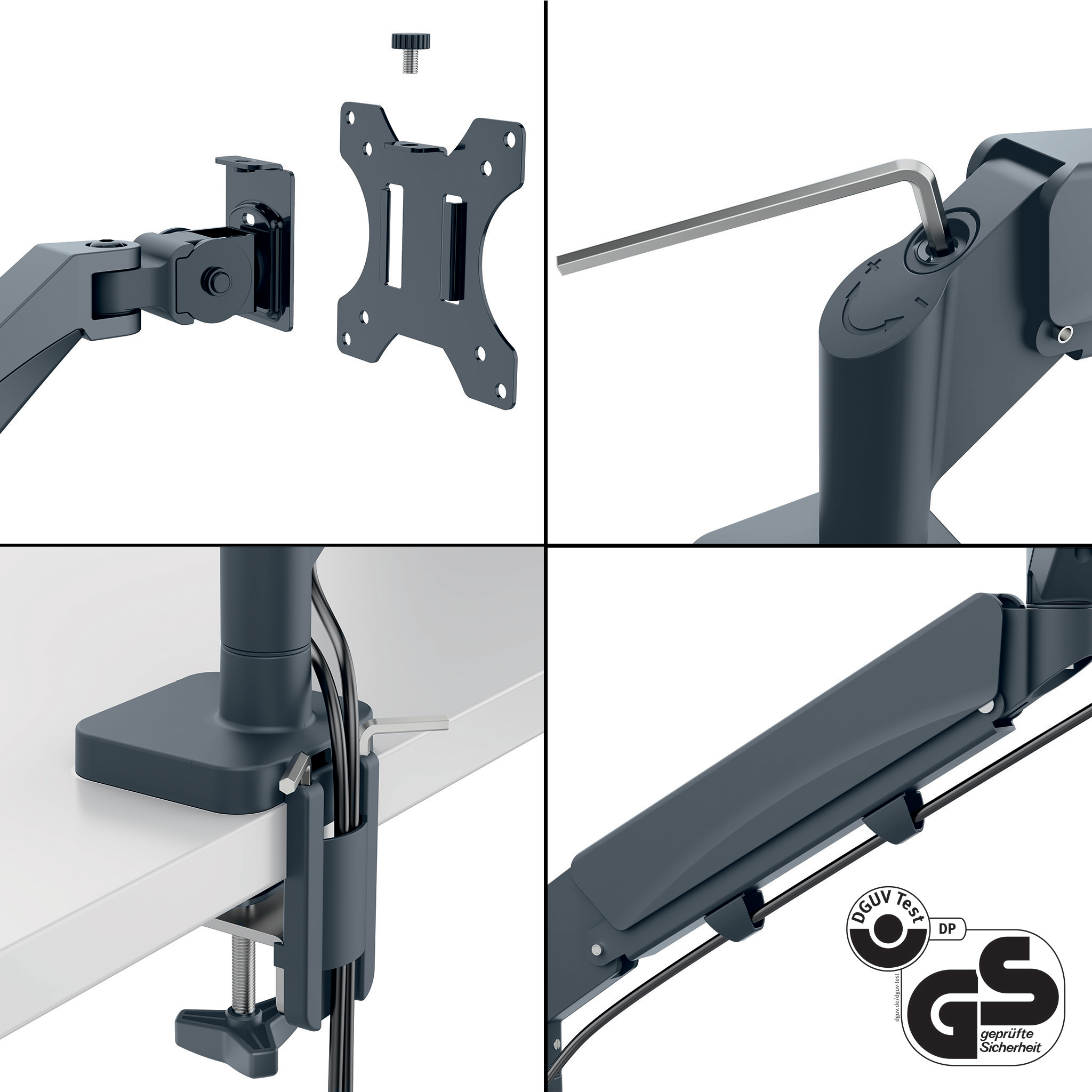 Til montering af én skærm. Justerer nemt din skærm til den ideelle højde. Har en positiv indvirkning på kropsholdningen, understøtter nakke- og skulderkomforten og øger produktiviteten, når den placeres korrekt som anbefalet. Det pladsbesparende design er ideelt til små arbejdsområder. Frigør værdifuld plads på skrivebordet.