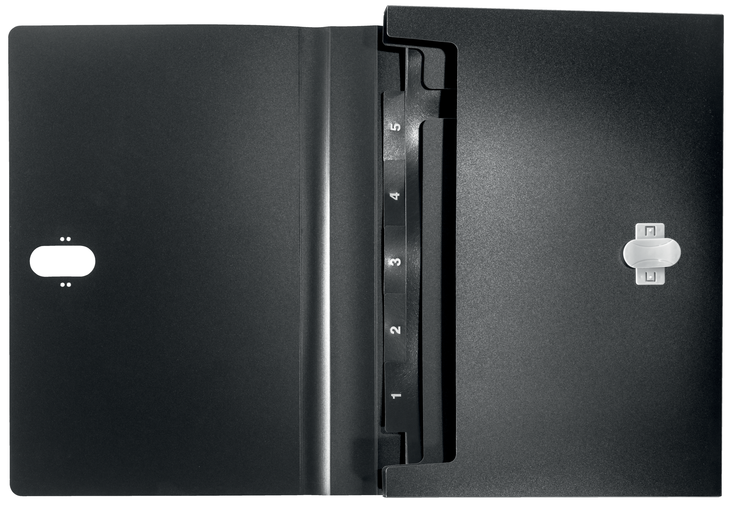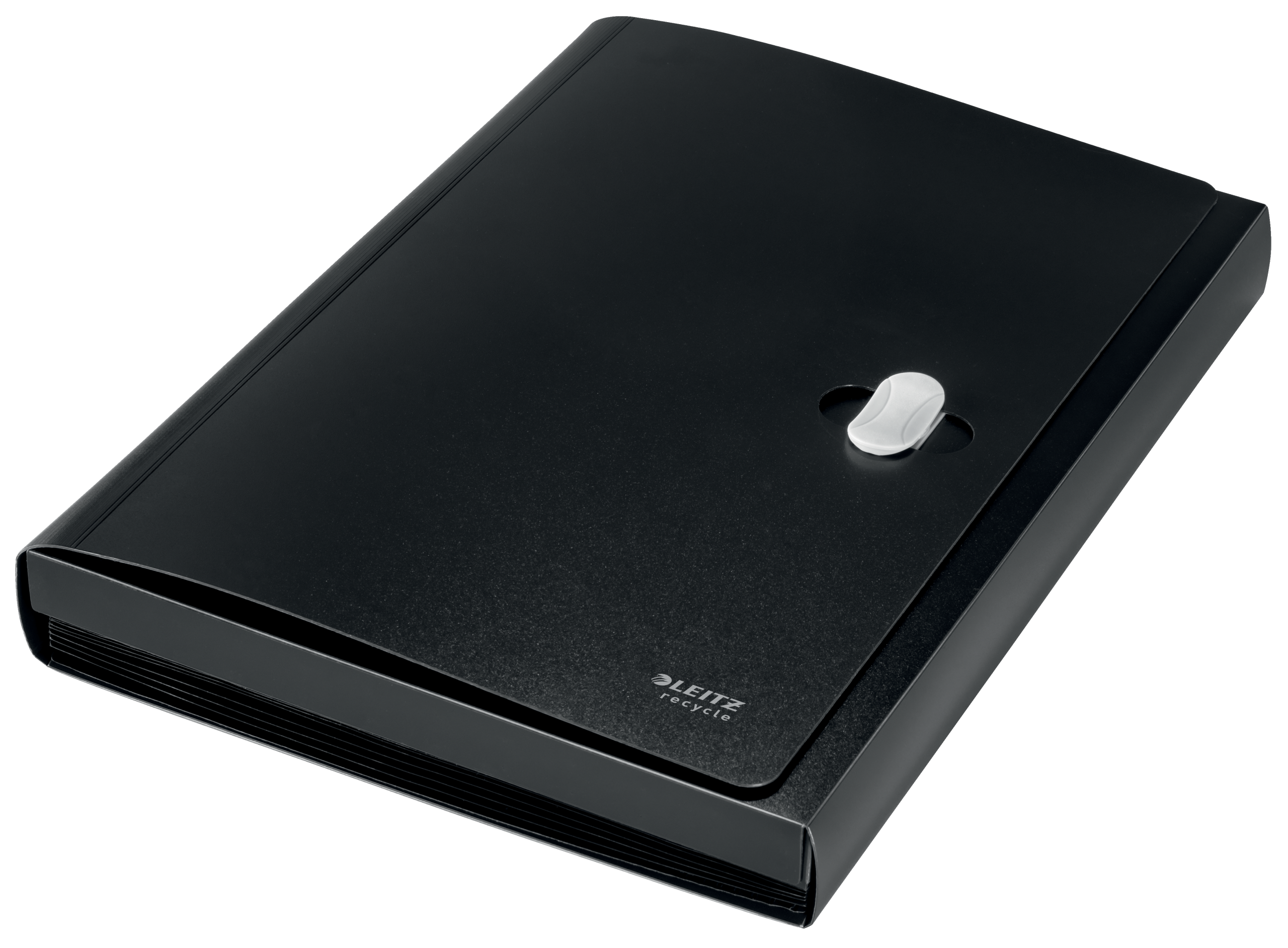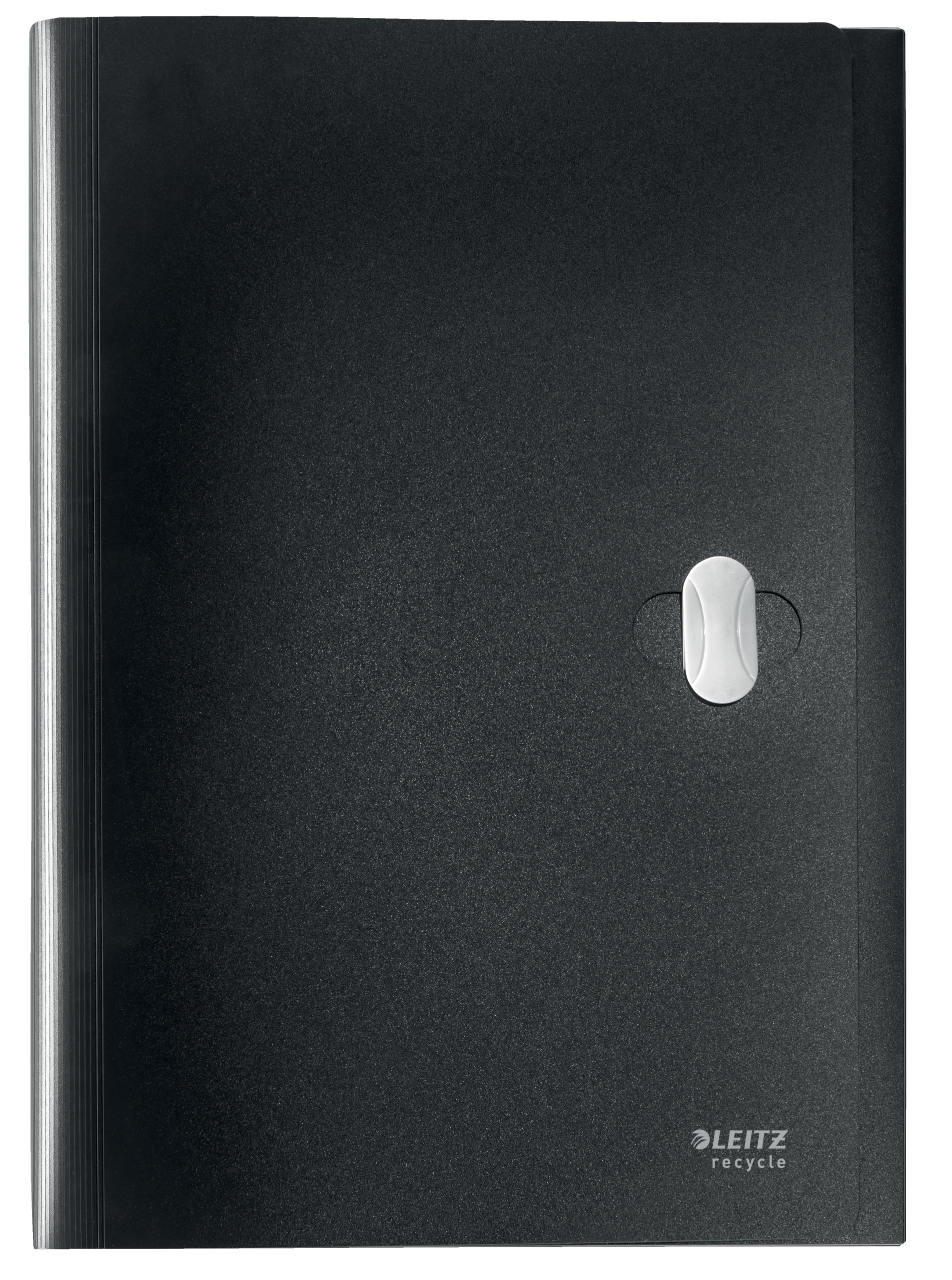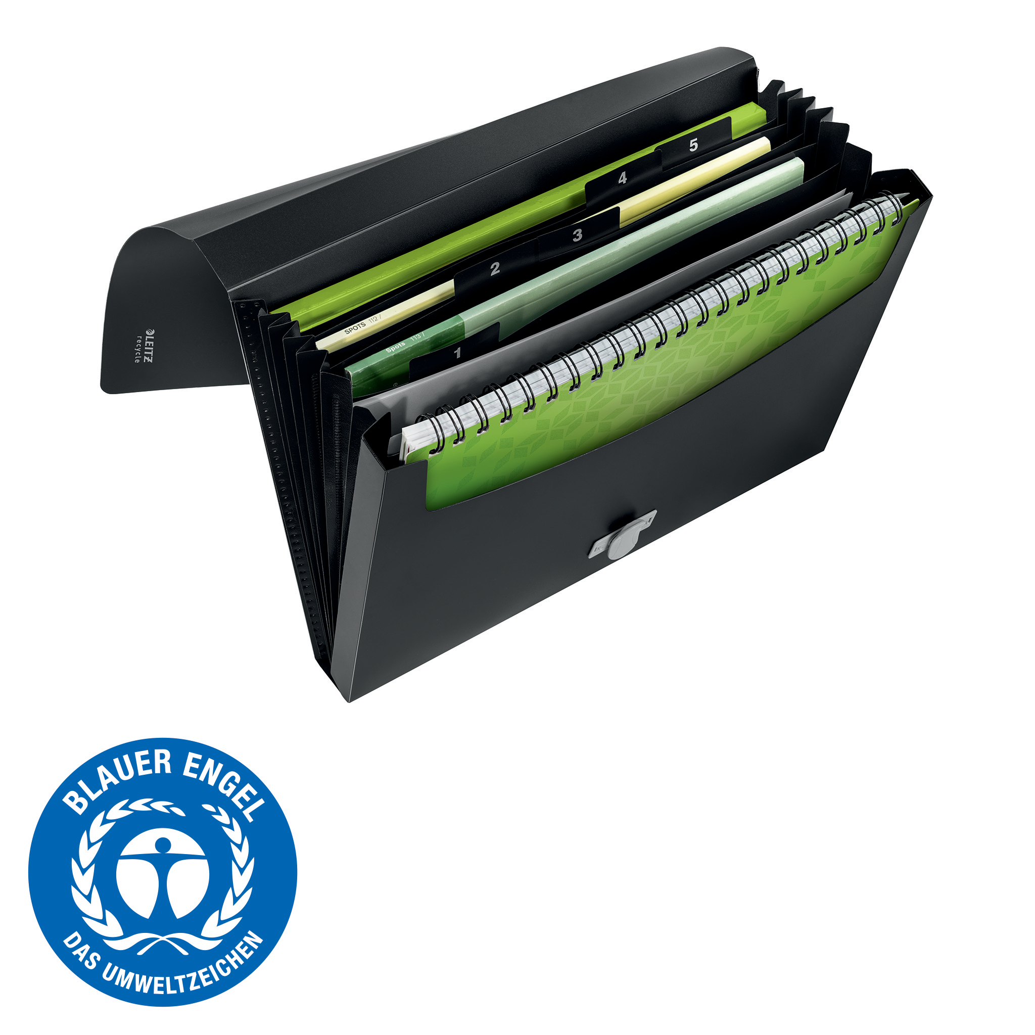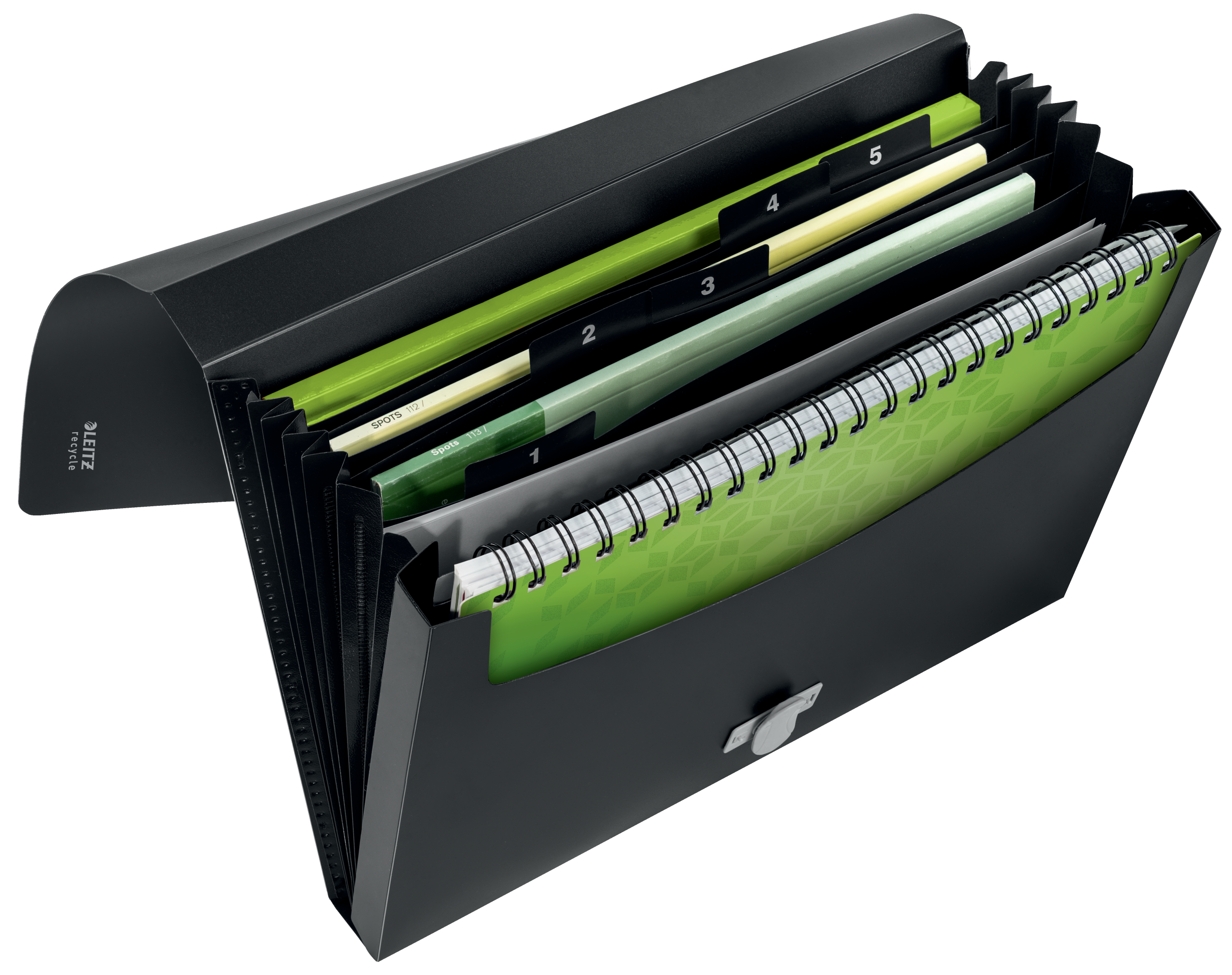 Ekspanderende mappe i førsteklasses kvalitet med 5 rum og lukning til A4-dokumenter. Recirkuleret plast, 100% recirkulerbar og Blå Engel-certificeret.