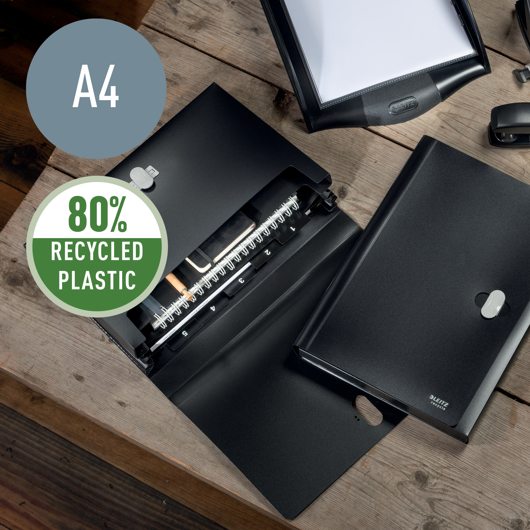 Iøjnefaldende, premium kvalitet PP projektmappe til daglig brug i skole, kontor og hjem med 5 rum. Lavet af 80% recirkuleret plast, 100% recirkulerbar og med Blå Engel miljøcertificering. Denne robuste og praktiske projektmappe komplementerer perfekt andre produkter fra Leitz Recycle-serien og er lavet til at holde. Moderne og stilfulde kontorartikler, som vil passe ind på kontoret og i hjemmet.
