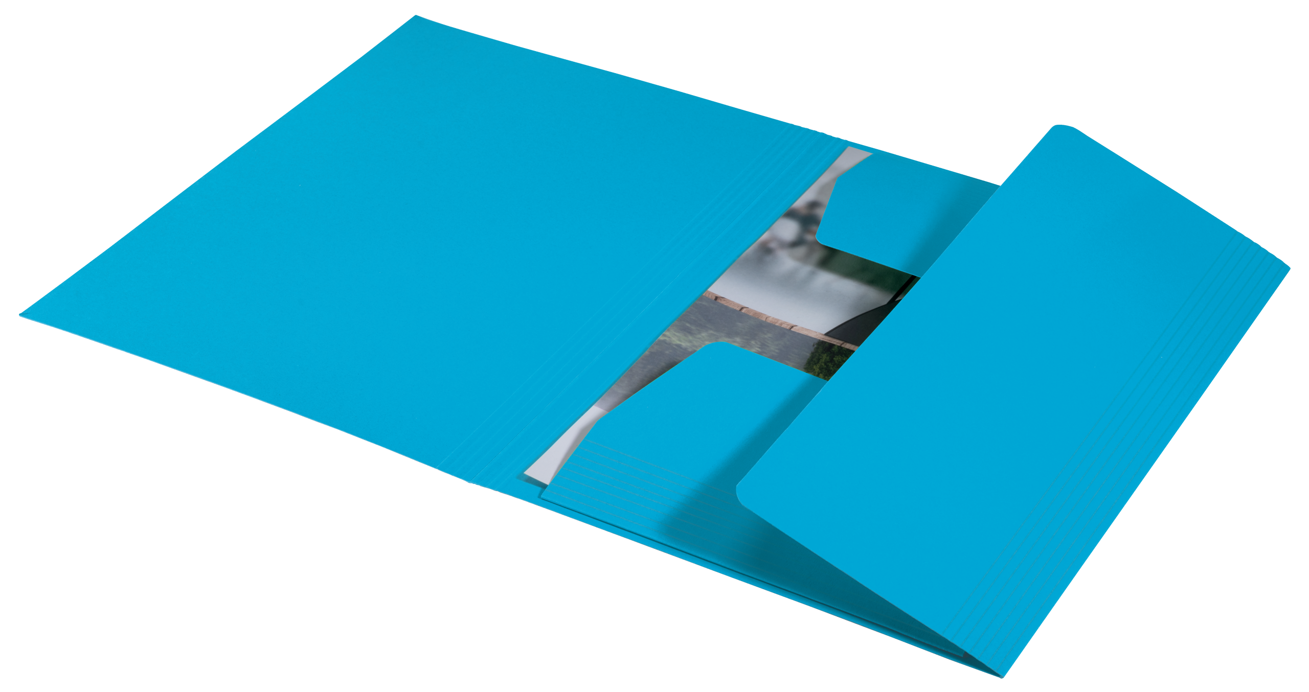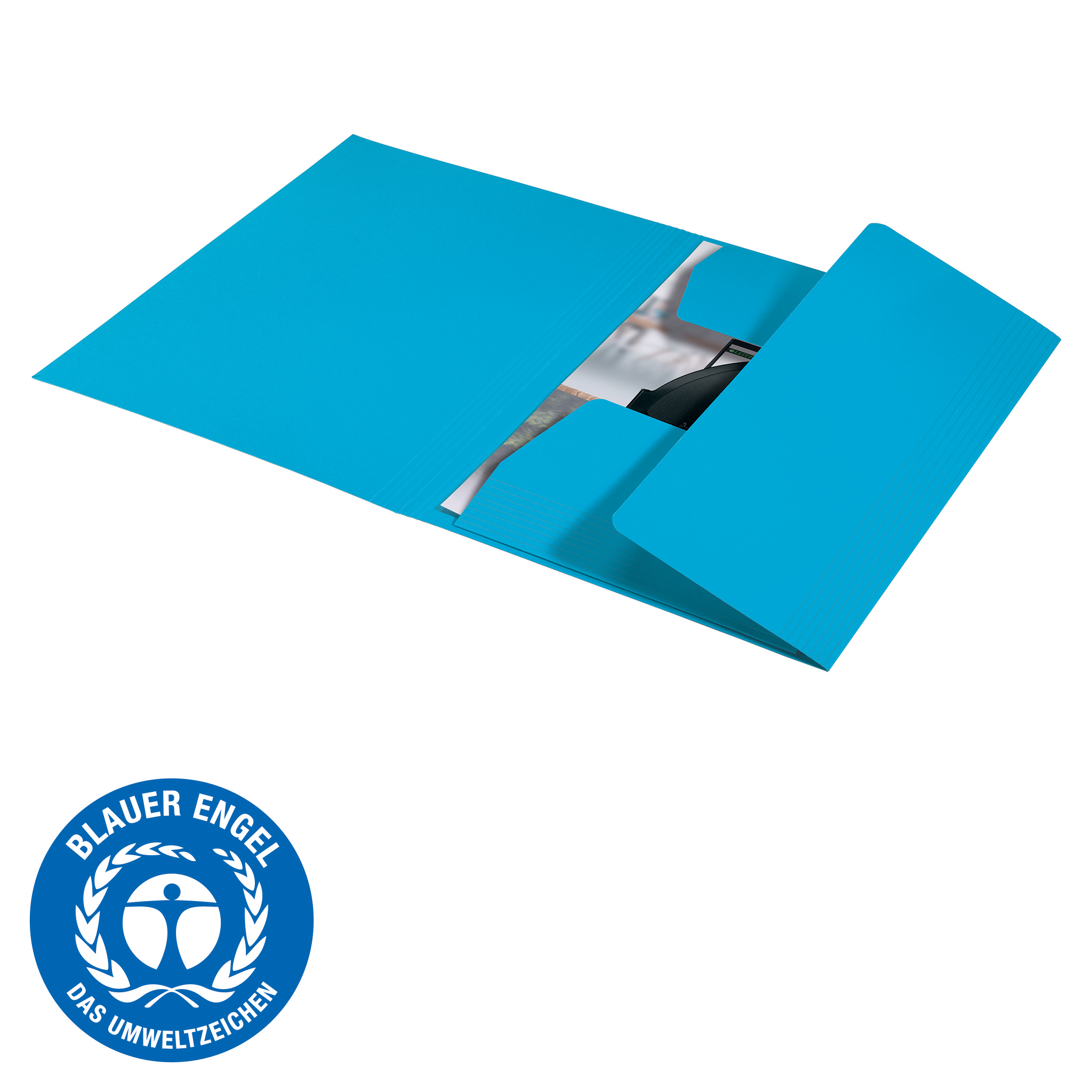 3-klap mappe af høj kvalitet til A4-dokumenter. 100% recirkuleret og recirkulerbar karton, certificeret med den Blå Engel.