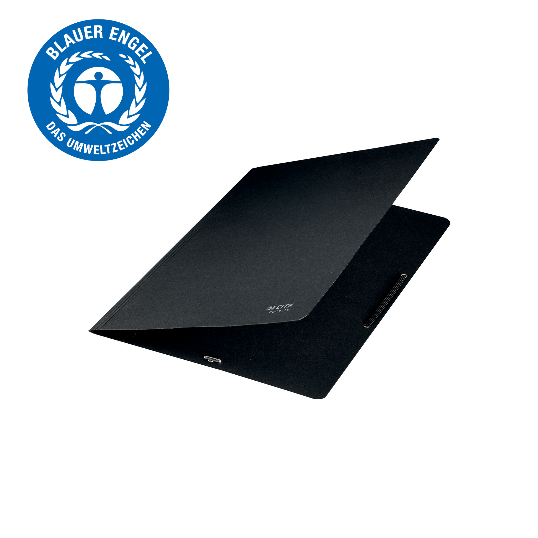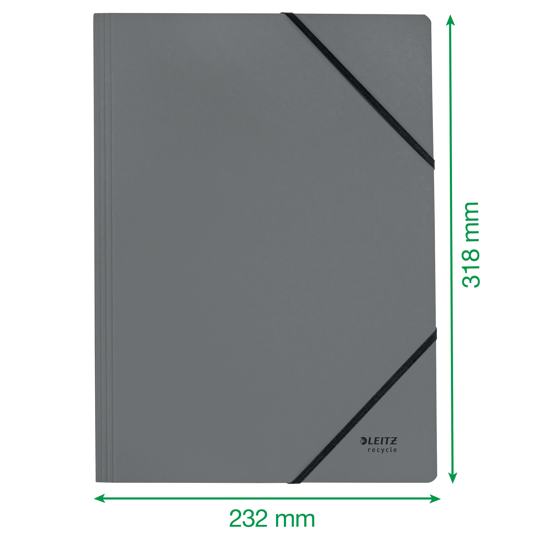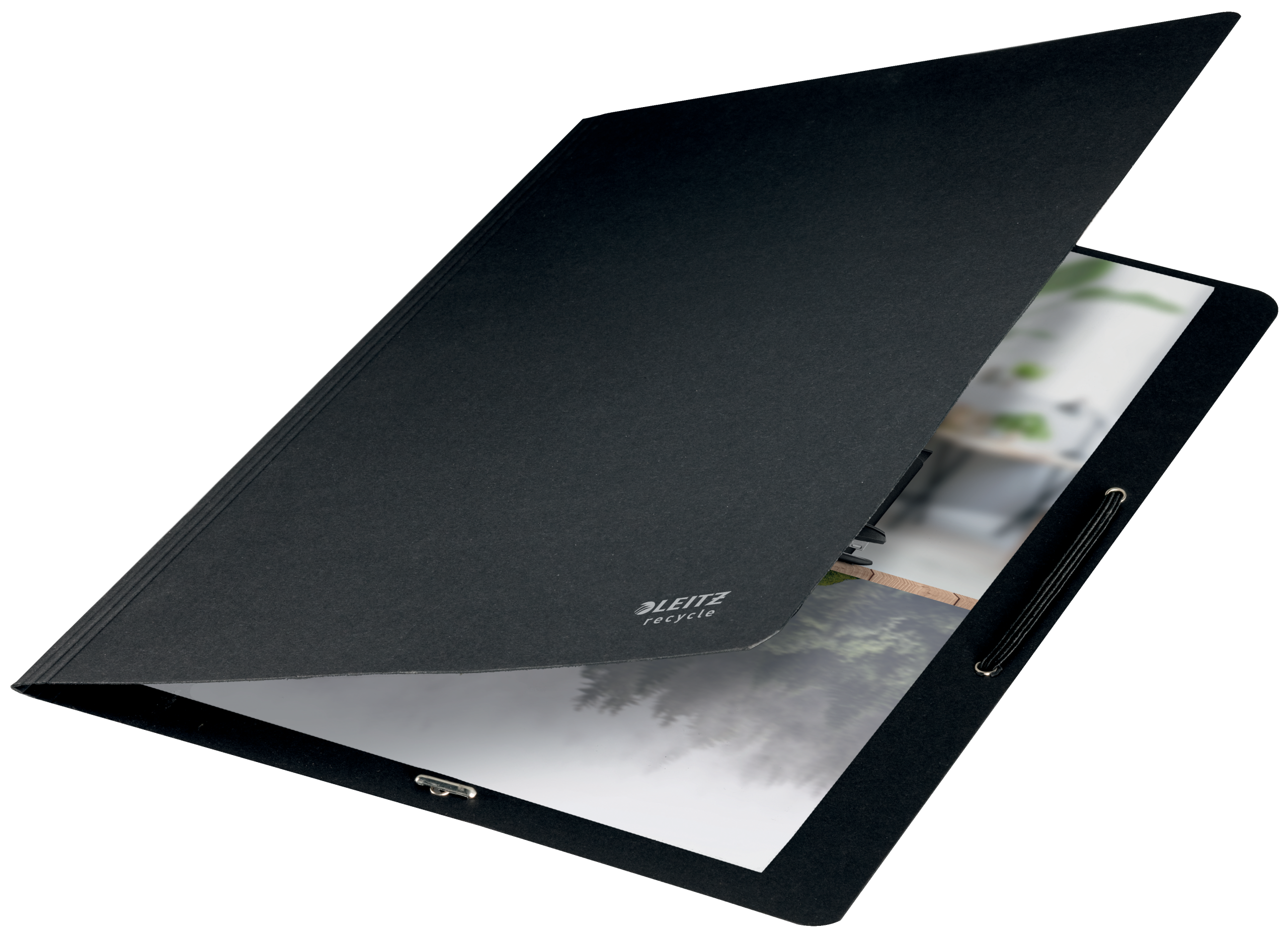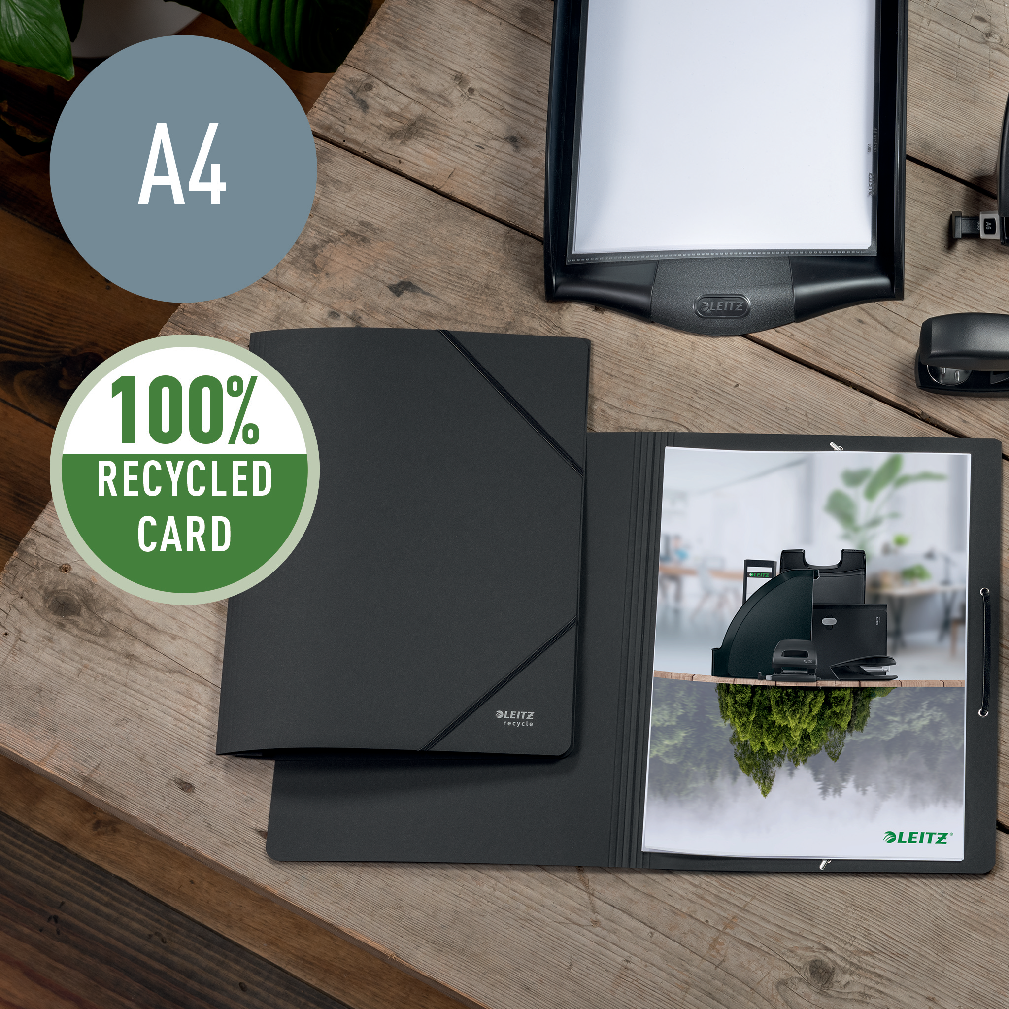 Iøjnefaldende mappe i karton i premium kvalitet. En af de mest anvendte mappetyper til dokumentbeskyttelse og transport. Med elastisklukning for at forhindre, at dokumenter glider ud. Lavet af 100% recirkuleret karton, 100% recirkulerbar og med Blå Engel miljøcertificering. Denne robuste og praktiske mappe med elastiklukning komplementerer perfekt andre produkter fra Leitz Recycle-serien og er lavet til at holde. Moderne og stilfulde kontorartikler, som vil passe ind på kontoret og i hjemmet.