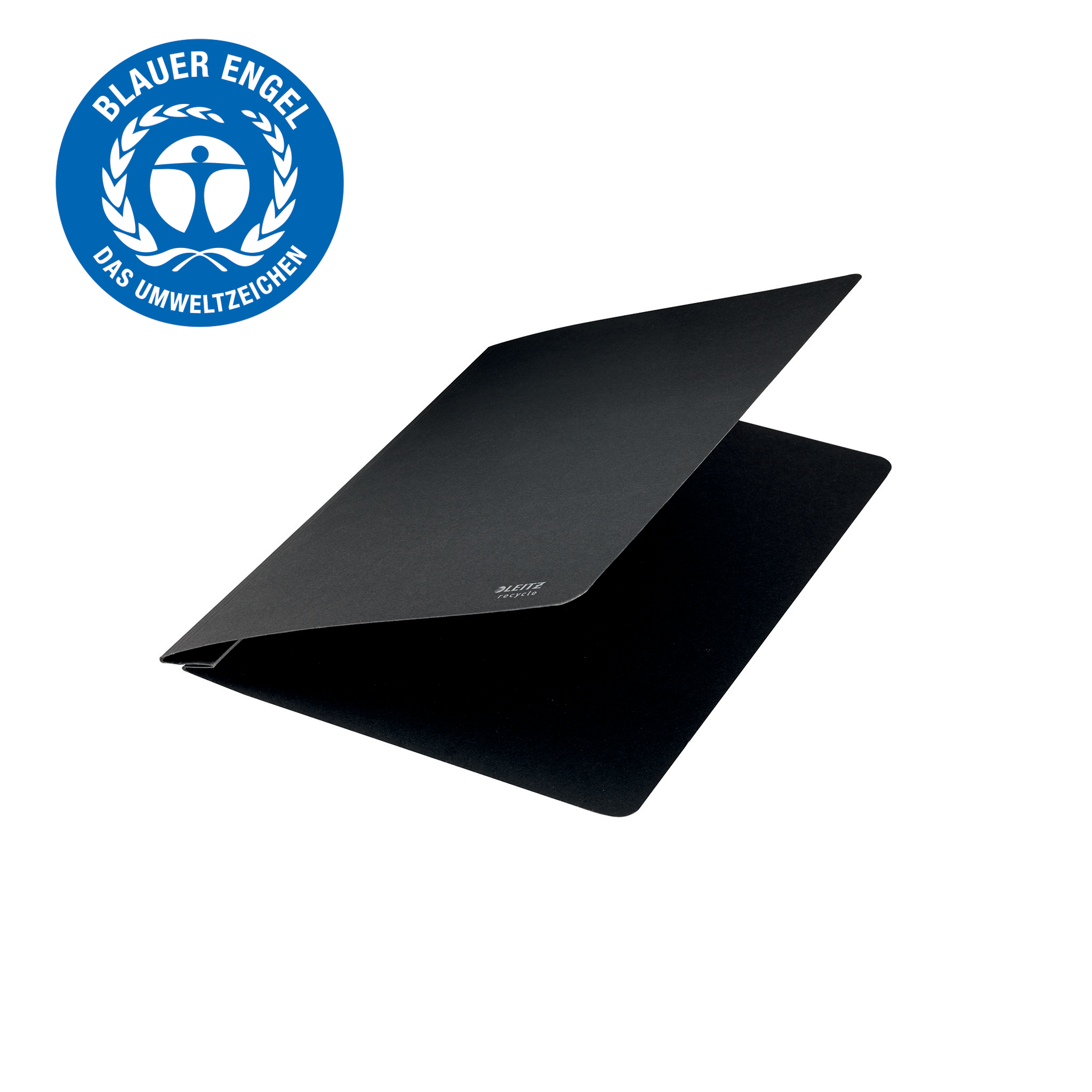 Tilbudsmappe i høj kvalitet med flad metalmekanisme til A4-dokumenter. 100 % recirkuleret og recirkulerbar karton, certificeret med Blå Engel.