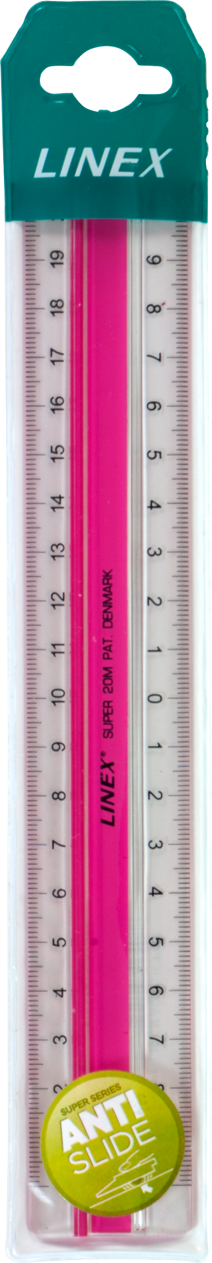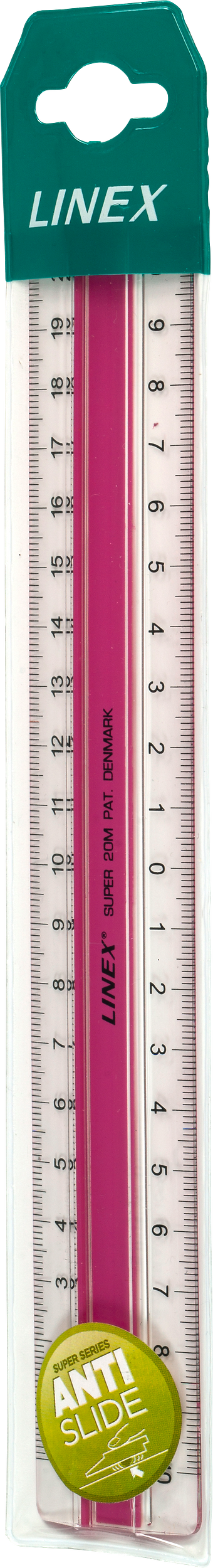 Inddelt i mm med en 0-20 cm skala på den ene side og en 10-0-10 cm skala på den anden side. Med 2 facetter og 1 gummiribbe. Stærkt glasklar akryl med grønt midterparti.
