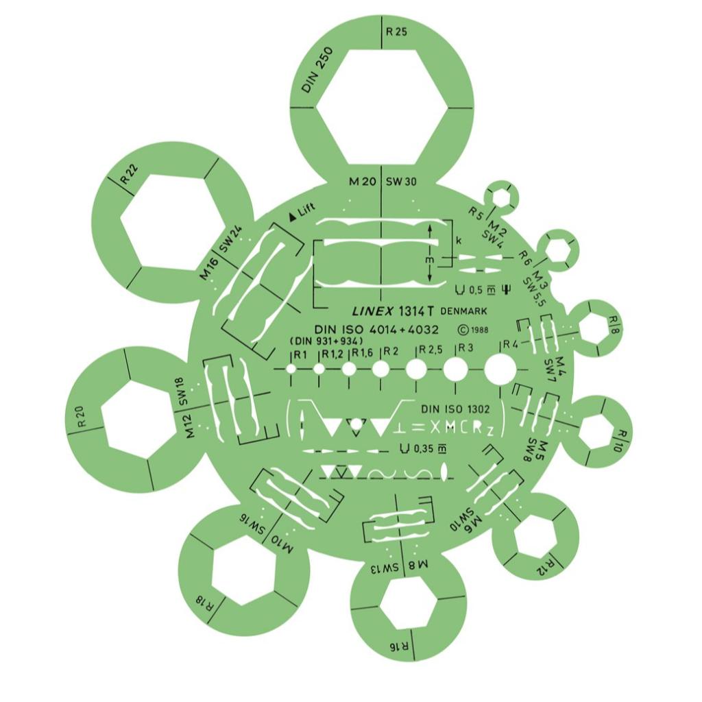 Med tuschkant og fingerlift. Til pen 0,35/0,5 mm. Til tegning af metriske ISO møtrikker og bolte set fra kant og flade. Størrelser fra M2-M20. Radier fra 1 til 25 mm samt bearbejdningstegn og målpile. ISO 4014, ISO 1302. 1,6 mm grøntransparent SBS.