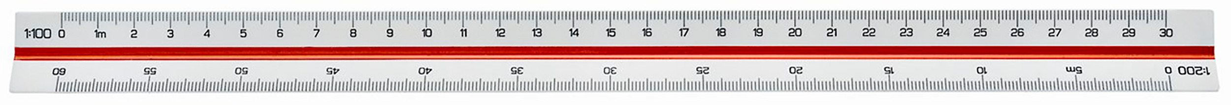 Med seks forskellige skalaer. Metrisk inddeling. Noter i 2 farver. Inddeling: 1:100:200:250:300:400:500.