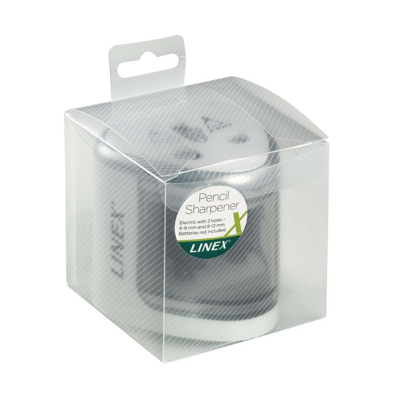 Batteridrevet blyantspidser til standard (dia. 6-8 mm) og jumbo (dia. 9-12 mm) blyanter. Gennemsigtig container, så det nemt kan ses hvornår den skal tømmes. Anvender 4 stk. AA 1,5V batterier, medfølger ikke.