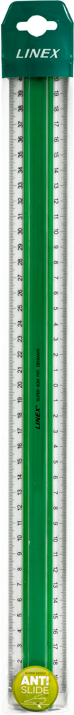 Inddelt i mm med en 0-40 cm skala på den ene side og en 20-0-20 cm skala på den anden side. Med 2 facetter og 1 gummiribbe. Stærkt glasklar akryl med grønt midterparti.