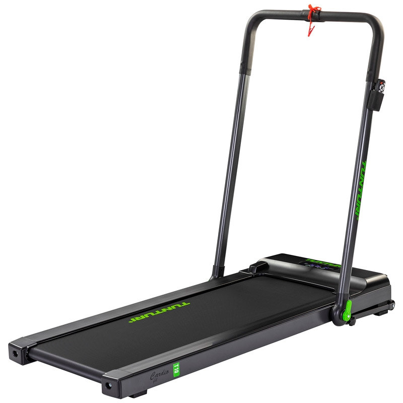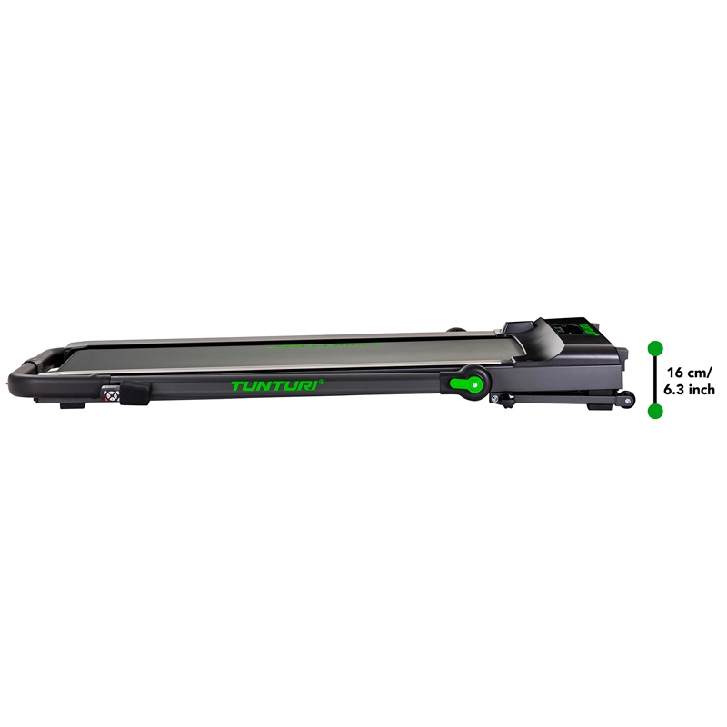Med Tunturi Cardio Fit T10 løbebånd kan du nemt opretholde dit niveau af kondition eller løbe i dit eget tempo hjemmefra. Løbebåndet er ideel til begyndere og armlænet kan bruges som let støtte, mens man går. Vil du spare plads, når du er færdig med at løbe? Fold let styret med foldemekanismen, og transporter løbebåndet til den ønskede lagerplads ved hjælp af transporthjulene. Super enkelt og nemt! Selv i små lejligheder tager dette løbebånd ikke meget plads, når du ikke bruger det. Løbebåndet er kun 16 cm højt, når du folder det. Dette gør det nemt at opbevare det under en seng eller bag et skab.