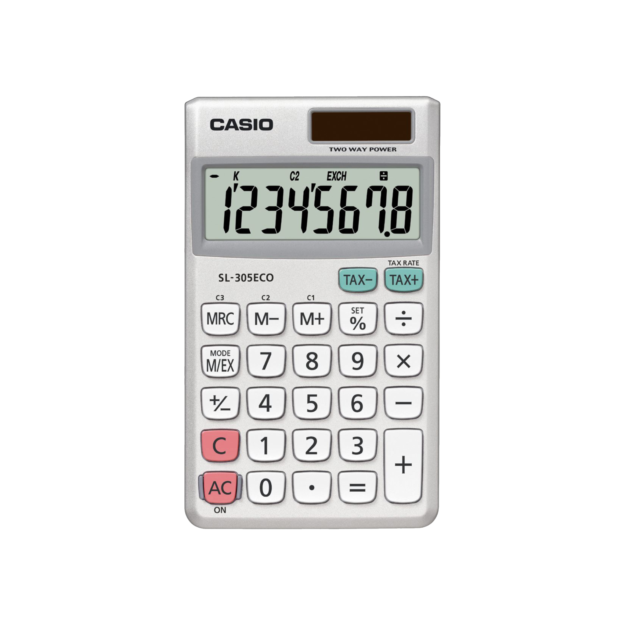 Casio SL-305ECO er en lommeregner, der er fremstillet af 100% genbrugsplastik, med indbygget solcelle så den ikke udelukkende bruger batteri. SL-305ECO har desuden indbygget skat/momsfunktion, så du kan klare den slags beregninger med ét tryk.