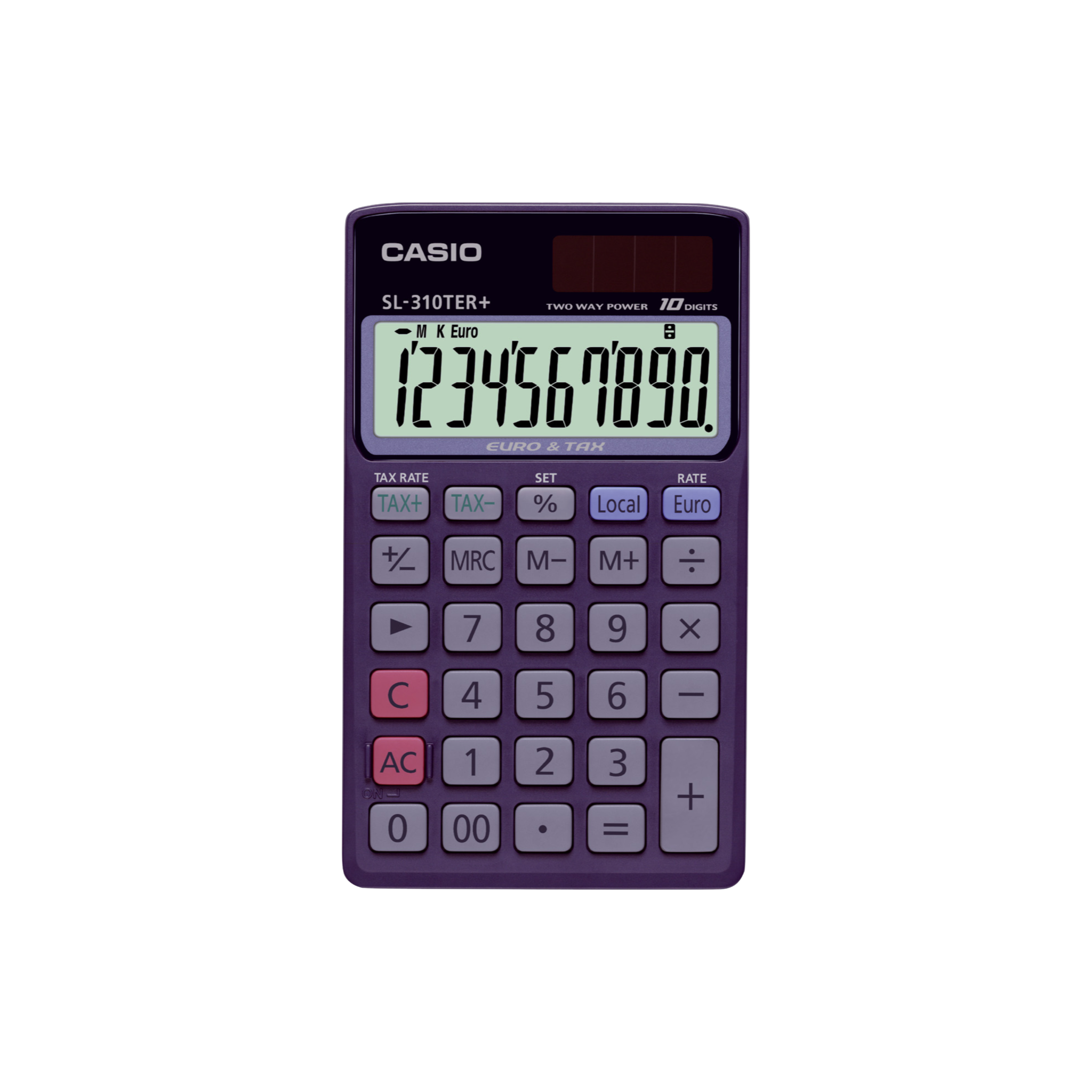 Casio SL 310TER er en lille og praktisk lommeregner med foldeetui, så den er nem at have med på farten. Med eurokursomregner og skatteberegner, samt indbyggede solceller. SL 310TER har store taster, og et stort 10-cifret display.