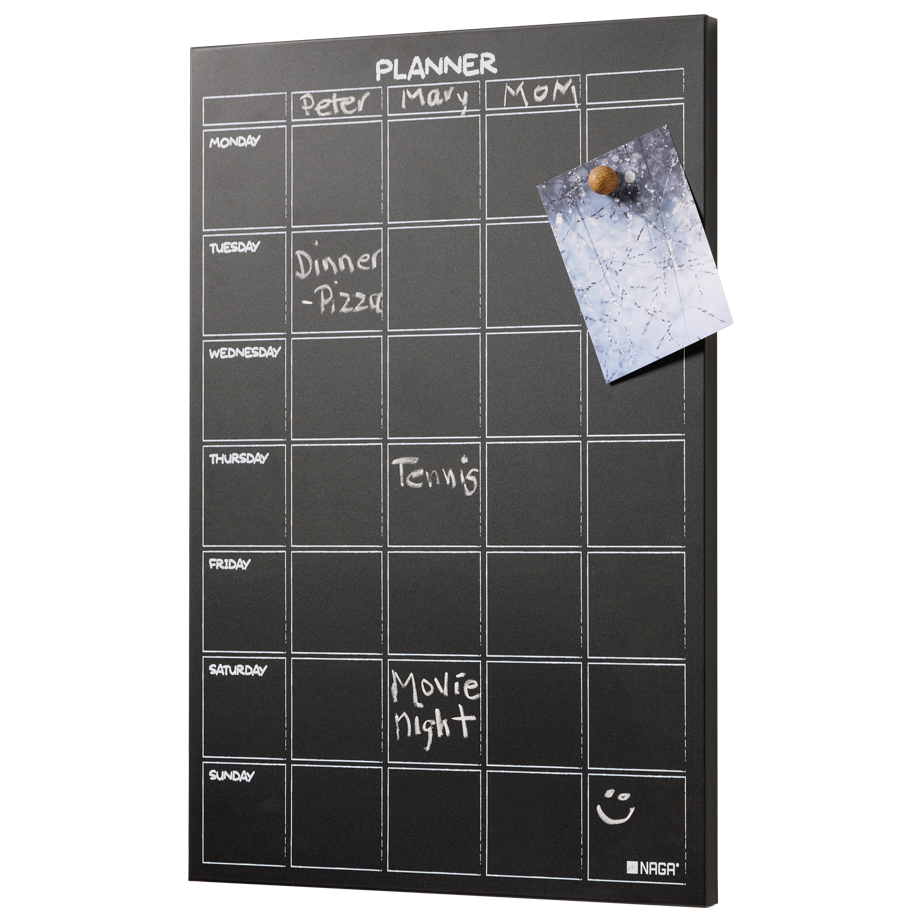 Magnetisk kridttavle ugeplan 40 x 60 cm Hold styr på hele familiens ugentlige planer med denne stilrene og funktionelle ugeplan tavle. Tavlen er designet i en klassisk sort finish og er opdelt i felter med hvide streger, der giver dig et klart overblik over ugens syv dage og plads til navne i toppen – perfekt til at organisere hverdagens aftaler og aktiviteter. Tavlen er fremstillet af stål og beklædt med en kridtfolie. Den magnetiske overflade gør det nemt at fastgøre noter, billeder eller invitationer med almindelig køleskabsmagneter, mens du med tavlekridt nemt kan tilføje og ændre i ugeplanen igen og igen. Vi anbefaler ikke, at du skriver med en kridtmarker på en kridttavle, da teksten kan være vanskelig at fjerne igen. Brug i stedet almindeligt tavlekridt. Kridt medfølger ikke men kan købes separat. Til rengøring af tavlen kan du bruge en fugtig, blød klud. Tavlen har huller til ophæng på bagsiden, og hænges op på væggen med 2 skruer. Skruer medfølger ikke.