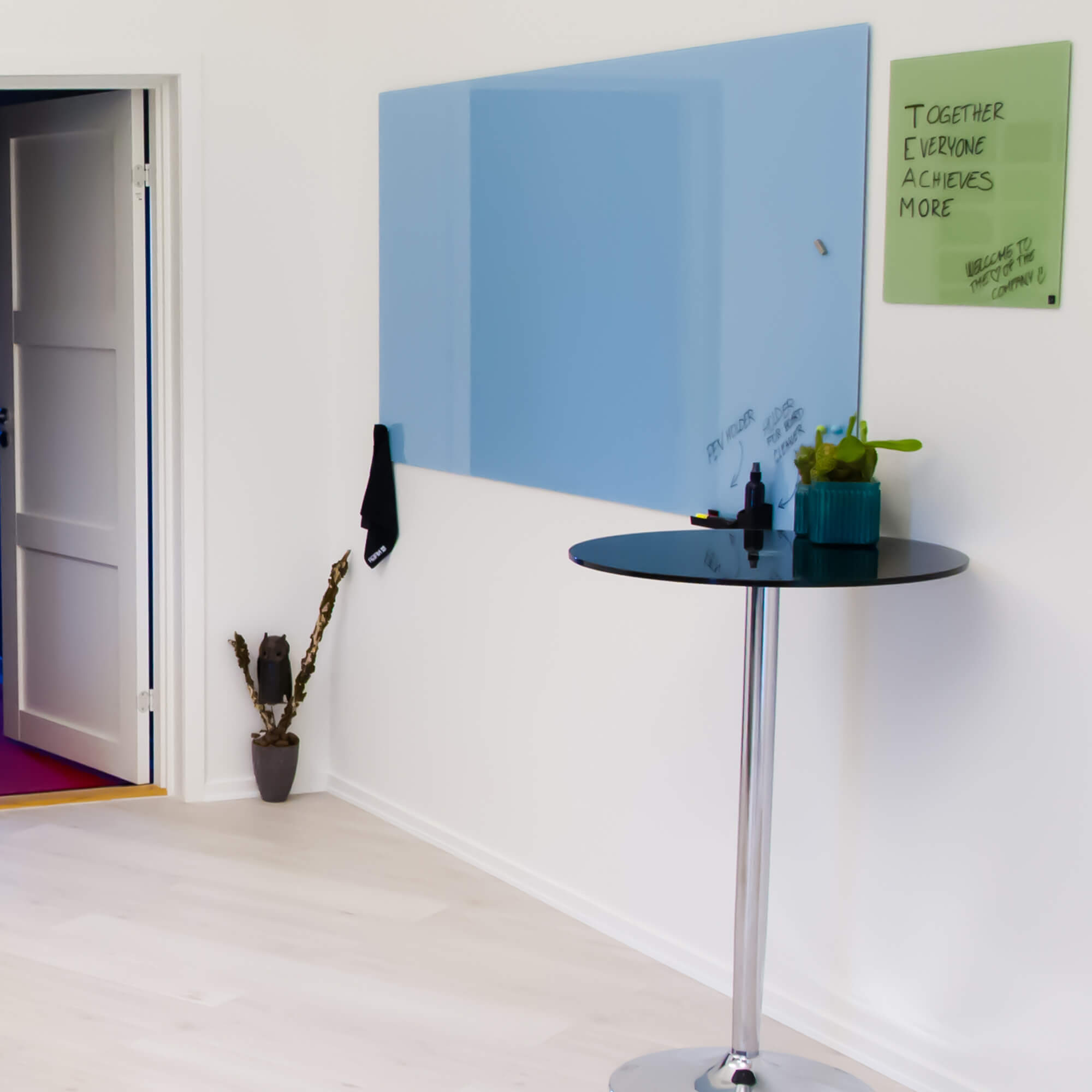 200 x 100 cm. Lyseblå Magnetisk GlastavleMagnetisk lyseblå glastavle 200 x 100 cm. med 4 mm. hærdet glas. En magnetisk glastavle kan bruges som opslagstavle ved brug af stærke magneter. Glasset giver et elegant udtryk og er samtidig en praktisk vægdekoration.Bemærk! Kun super stærke magneter kan bruges på glastavlen. Magneter medfølger ikke. Alle NAGA glastavler kræver kraftige neodym magneter, da magneten skal nå igennem glasset til metallaget på bagsiden af tavlen.Skriv på glasset med en kridt marker, eller med en almindelig whiteboard marker. Når teksten er tør, kan den nemt viskes ud igen med en tavlesvamp eller en tør klud. Overfladen er nem at rengøre og bevarer sin flotte finish år efter år. Til grundig rengøring skal du bruge tavlerens eller almindeligt glaspudsemiddel og en blød klud. Det er vigtigt, at du bruger en blød klud for at undgå at ridse glasset.Ophæng: Tavlen kan hænges vandret eller lodret. Der medfølger skruer og rawlplugs samt en skinne til at hænge tavlen på. Til store tavler som denne leverer vi også 2 magneter, der kan skrues i væggen, og som sikrer, at tavlen holdes stabilt og tæt mod væggen. Se monteringsvejledning under vejledninger. Afstand fra væg til front af tavle 10 mm.Levering: Tavler fra 1 x 1 meter og op kan ikke leveres til en pakkeshop. De sendes med fragtmand direkte til din adresse.
