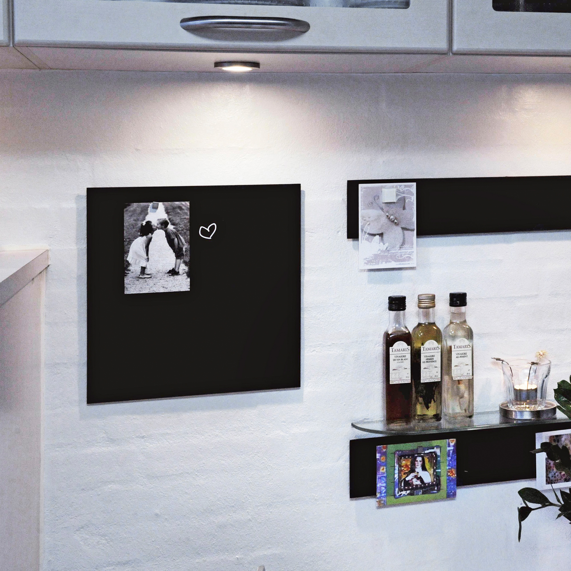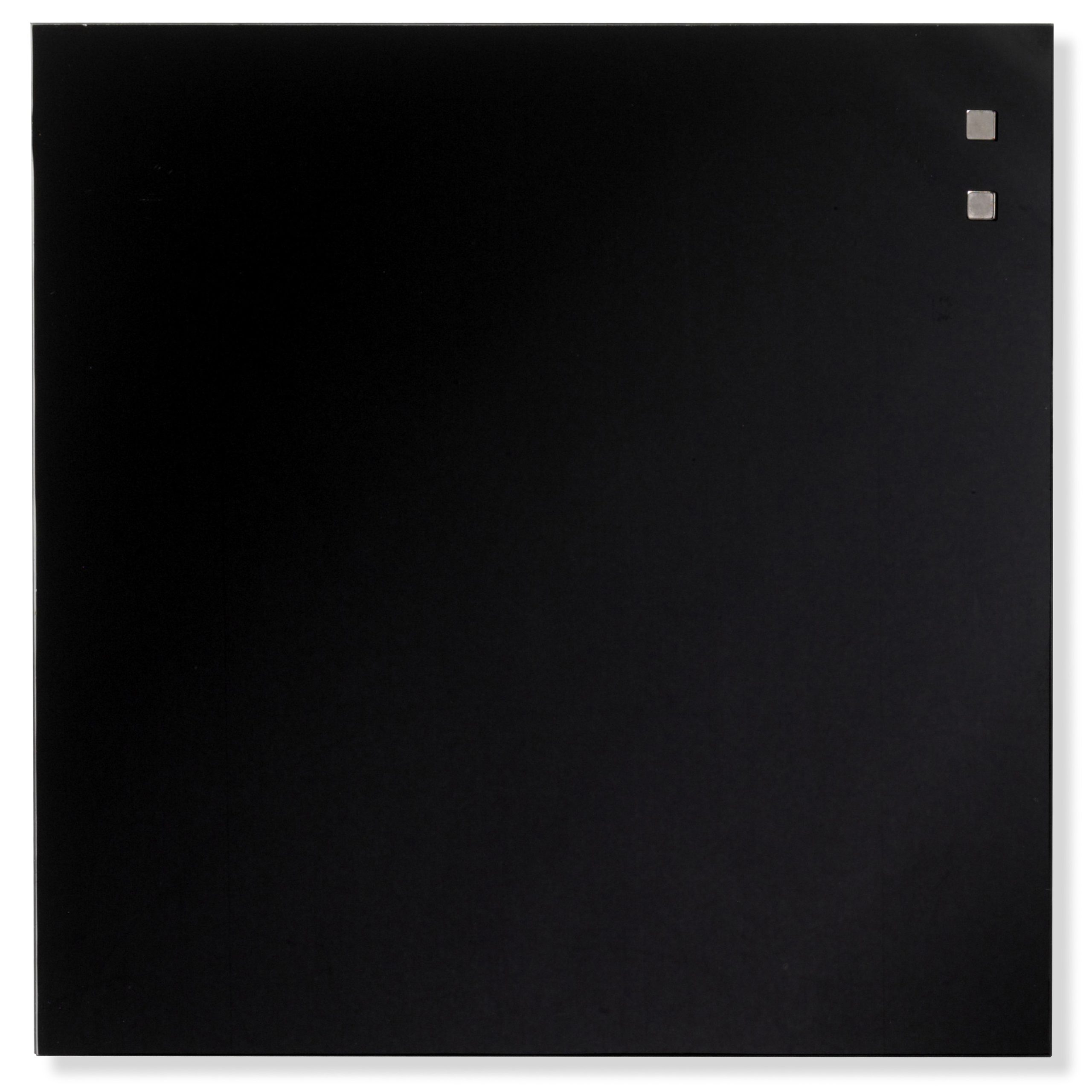 35 x 35 cm. Sort Magnetisk GlastavleEn magnetisk glastavle kan bruges som opslagstavle ved brug af stærke magneter. Glasset giver et elegant udtryk og er samtidig en praktisk vægdekoration. Denne sorte glastavle måler 35 x 35 cm.Bemærk! Kun super stærke magneter kan bruges på glastavlen. Magneter medfølger ikke. Alle NAGA glastavler kræver kraftige neodym magneter, da magneten skal nå igennem glasset til metallaget på bagsiden af tavlen.Skriv på glasset med en kridt marker, eller med en almindelig whiteboard marker. Når teksten er tør, kan den nemt viskes ud igen; brug en tavlesvamp eller en tør klud. Til grundig rengøring skal du bruge tavlerens eller almindeligt glaspudsemiddel og en blød klud. Det er vigtigt, at du bruger en blød klud for at undgå at ridse glasset. Tavletilbehør kan tilkøbes separat.Ophæng: Der medfølger skruer og rawlplugs samt en boreskabelon. Tavlen har huller i hvert hjørne på bagsiden, så den nemt kan monteres på væggen. Se monteringsvejledning under vejledninger.