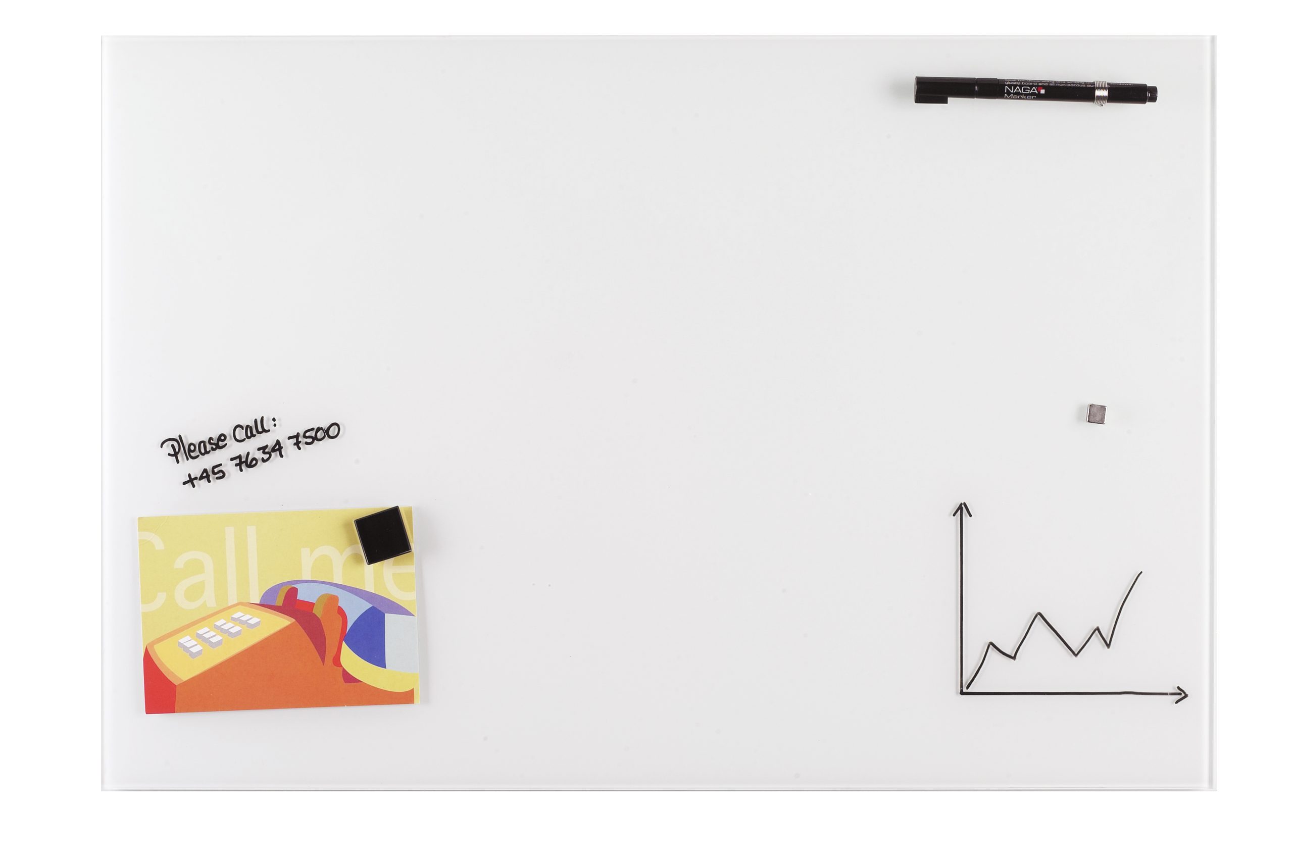 40 x 60 cm. Hvid Magnetisk GlastavleEn magnetisk glastavle kan bruges som opslagstavle ved brug af stærke magneter. Glasset giver et elegant udtryk og er samtidig en praktisk vægdekoration.Bemærk! Kun super stærke magneter kan bruges på glastavlen. Magneter medfølger ikke. Der skal anvendes stærke magneter af materialet neodymium, da magneten skal nå igennem til metallaget bagerst på tavlen. Magneter der skal anvendes på NAGA glastavler skal være kraftige neodym magneter.Skriv på glasset med en kridt marker, eller med en almindelig whiteboard marker. Når teksten er tør, kan den nemt viskes ud igen, brug en tavlesvamp eller en tør klud. Til grundig rengøring skal du bruge tavlerens eller almindeligt glaspudsemiddel og en blød klud. Det er vigtigt, at du bruger en blød klud for at undgå at ridse glasset.Ophæng: Der medfølger skruer og rawlplugs samt en boreskabelon. Stålbagsiden på tavlen har huller i hvert hjørne, så tavlen er nem at hænge op. Se monteringsvejledning under vejledninger. Tavlen kan hænges vandret eller lodret.Tavletilbehør kan tilkøbes.