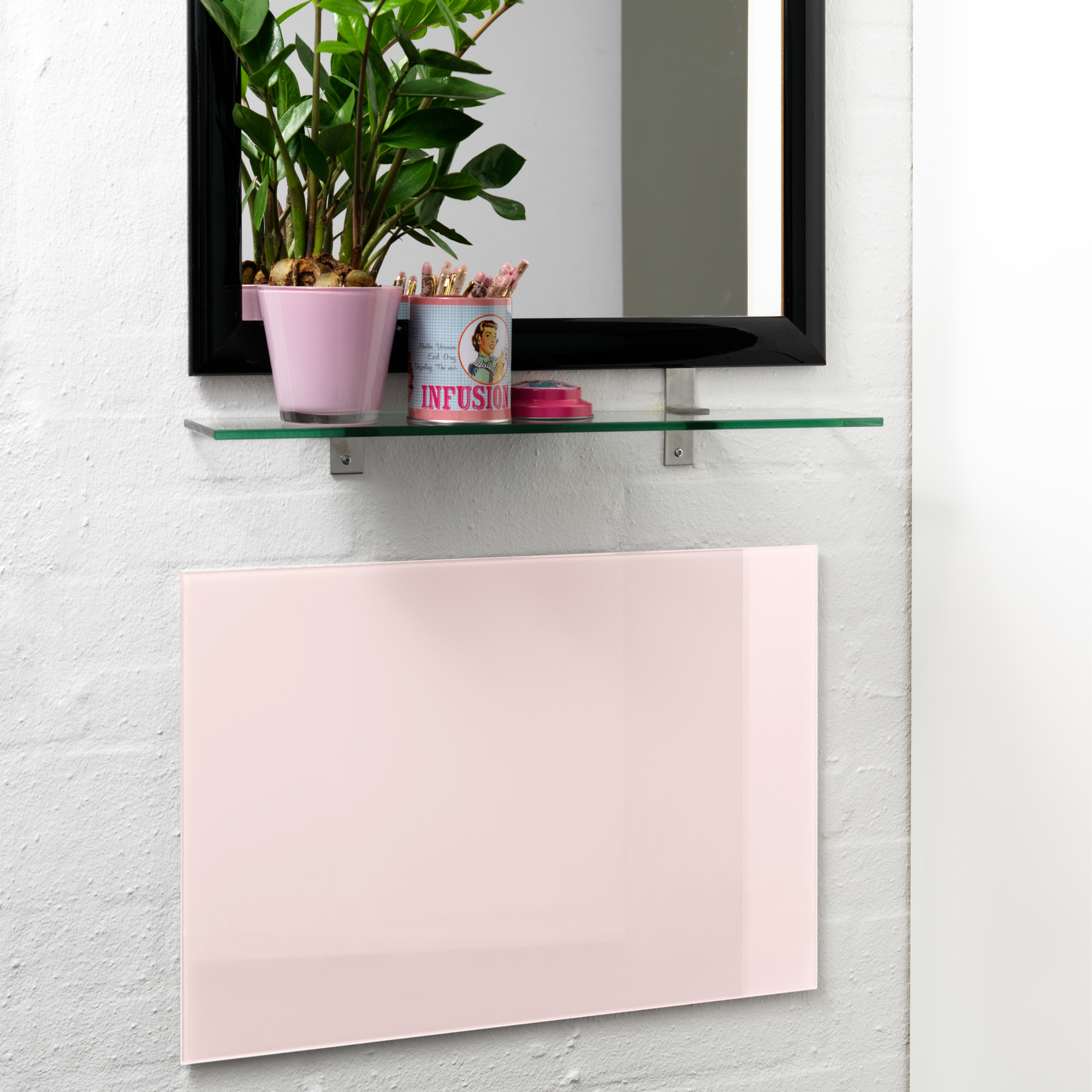 40 x 60 cm. Pudder Magnetisk GlastavleEn magnetisk glastavle kan bruges som opslagstavle ved brug af stærke magneter. Glasset giver et elegant udtryk og er samtidig en praktisk vægdekoration. Tavlen er sart lyserød og måler 40 x 60 cm.Bemærk! Kun super stærke magneter kan bruges på glastavlen. Magneter medfølger ikke. Alle NAGA glastavler kræver kraftige neodym magneter, da magneten skal nå igennem glasset til metallaget på bagsiden af tavlen.Skriv på glasset med en kridt marker, eller med en almindelig whiteboard marker. Når teksten er tør, kan den nemt viskes ud igen med en tavlesvamp eller en tør klud. Til grundig rengøring skal du bruge tavlerens eller almindeligt glaspudsemiddel og en blød klud. Det er vigtigt, at du bruger en blød klud for at undgå at ridse glasset. Tavletilbehør kan tilkøbes separat.Ophæng: Tavlen kan hænges vandret eller lodret. Der medfølger skruer og rawlplugs samt en boreskabelon. Tavlen har huller i hvert hjørne på bagsiden, så den nemt kan monteres på væggen. Se monteringsvejledning under vejledninger.