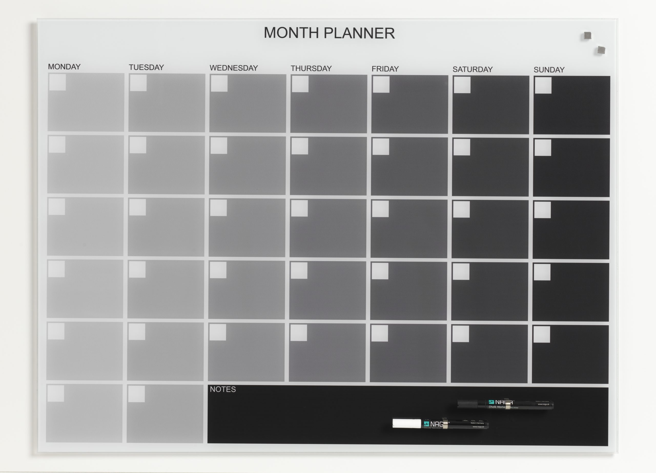 Magnetisk glas måneds tavle 80 x 60 cm. Grå nuancer. Engelsk tekst. Skriv på tavlen med en marker, og sæt ting op på den med super stærke magneter. Gør det nemt at planlægge månedens aktiviteter.Tavlen leveres med skinnesystem til ophæng. Afstand fra væg til front af tavle 10 mm.Incl. 2 markere, sort og hvid.
