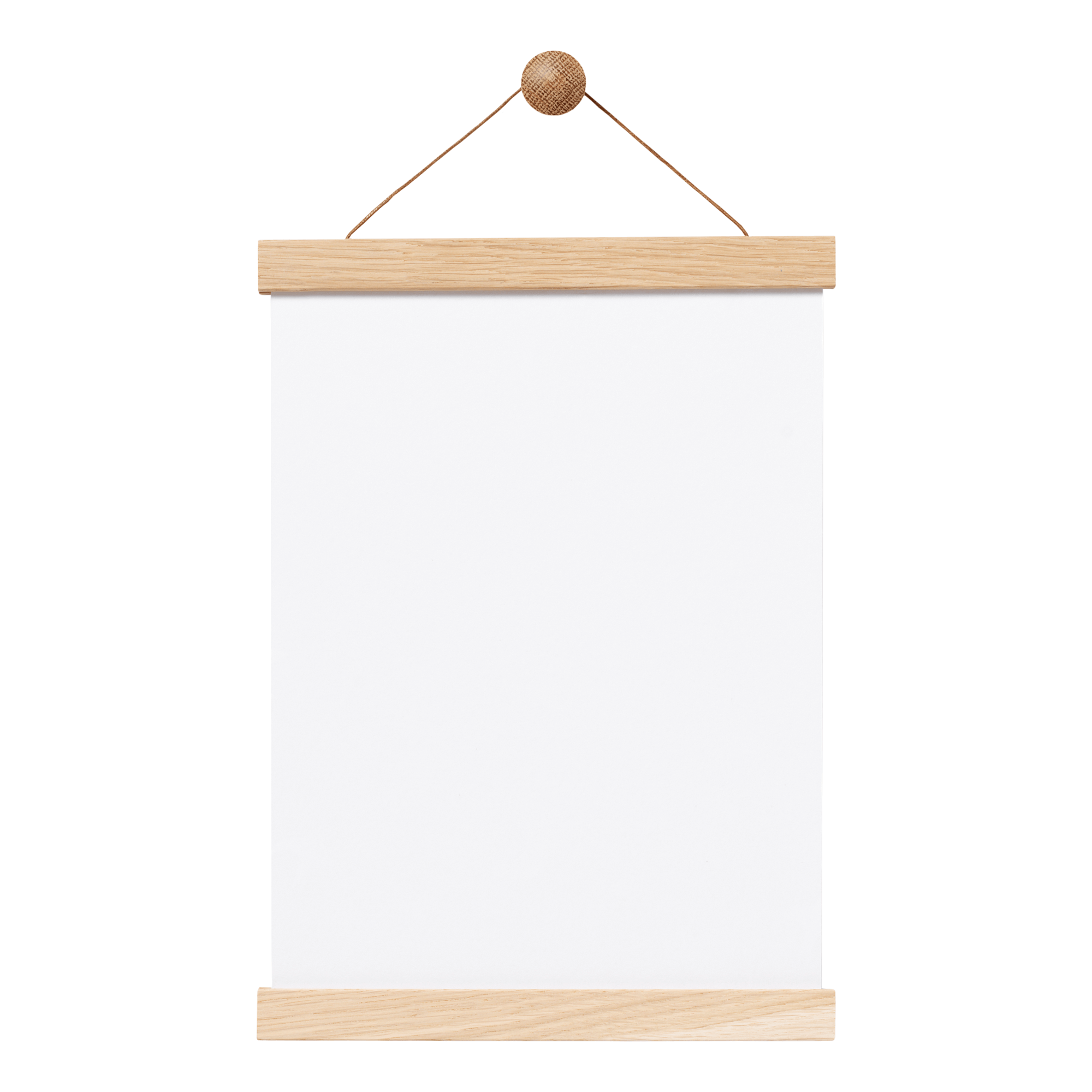 Magnet rammeskinne sæt i natur egetræ, længde 22 cm.Sættet består af 2 skinner, med indbyggede magneter, så man nemt kan hænge plakater, tegninger, billeder m.v. op. Sæt plakaten ind mellem de 2 skinner, og luk skinnerne sammen, enkelt og let. Magneterne sikrer, at plakaten sidder godt fast, men er nem at udskifte.Voksbehandlet ophængssnor.Kan med fordel anvendes sammen med en ege kugle magnet, som dækker for skruen eller sømmet i væggen. Medfølger ikke. Mål: L: 22 cm. H: 2 cm. D: 0,5 cm. x 2 skinner = 1 cm.Dette ramme sæt i 22 cm. passer f.eks. til A4 ark og plakater.