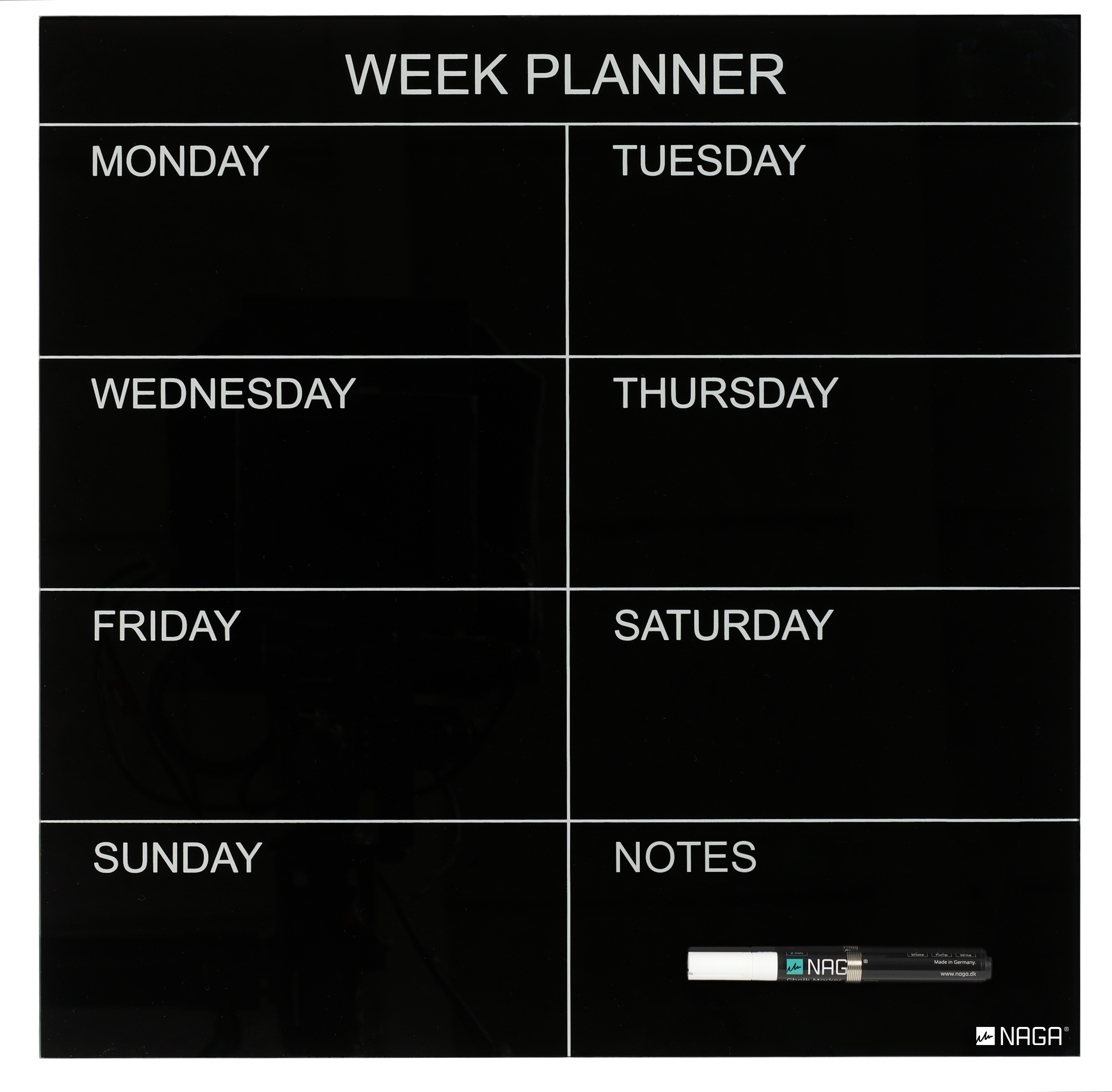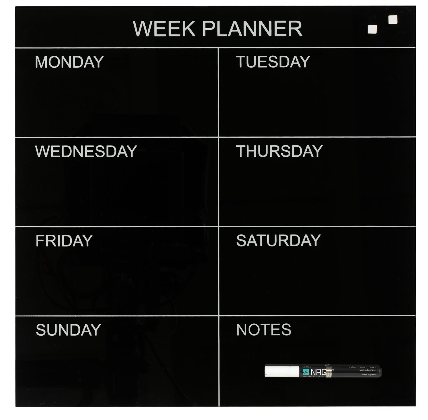 Magnetisk glas uge tavle 45 x 45 cm. Sort. Engelsk tekst. Skriv på tavlen med en marker, og sæt ting op på den med super stærke magneter. Gør det nemt at planlægge ugens aktiviteter.Tavlen leveres med skruer, rawlplugs, ophængs skabelon og 1 marker. Se monteringsvejledning under fanen vejledninger