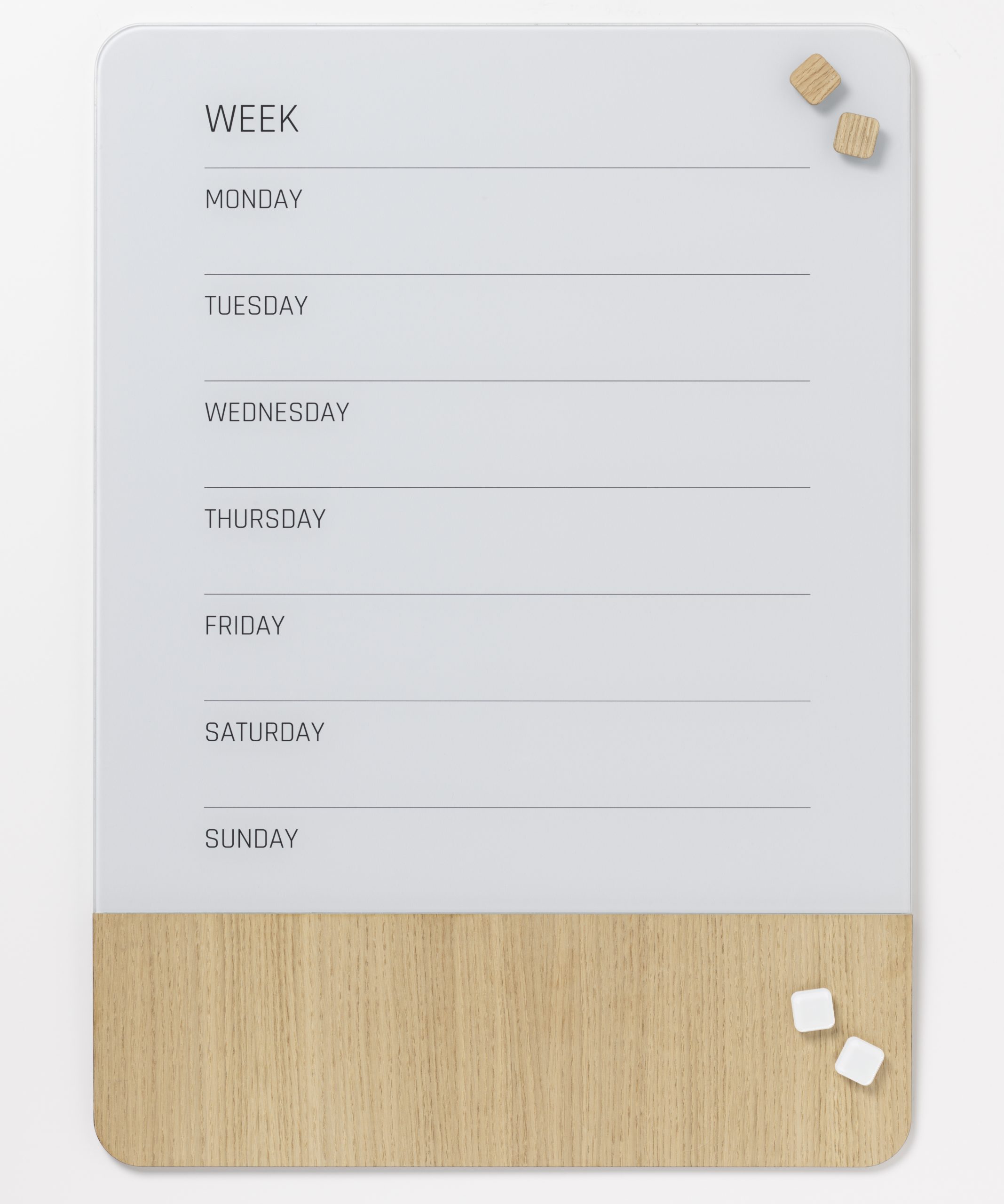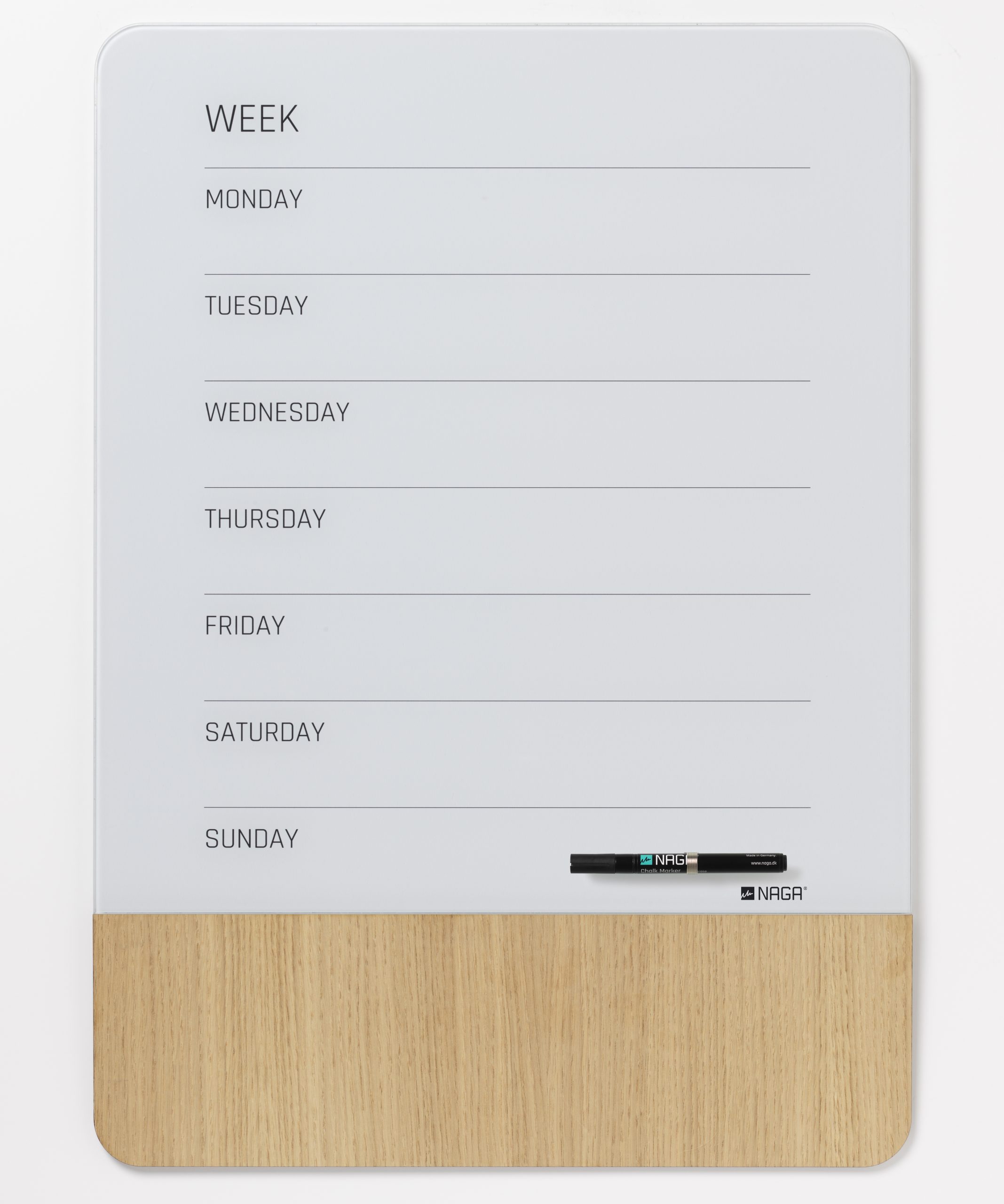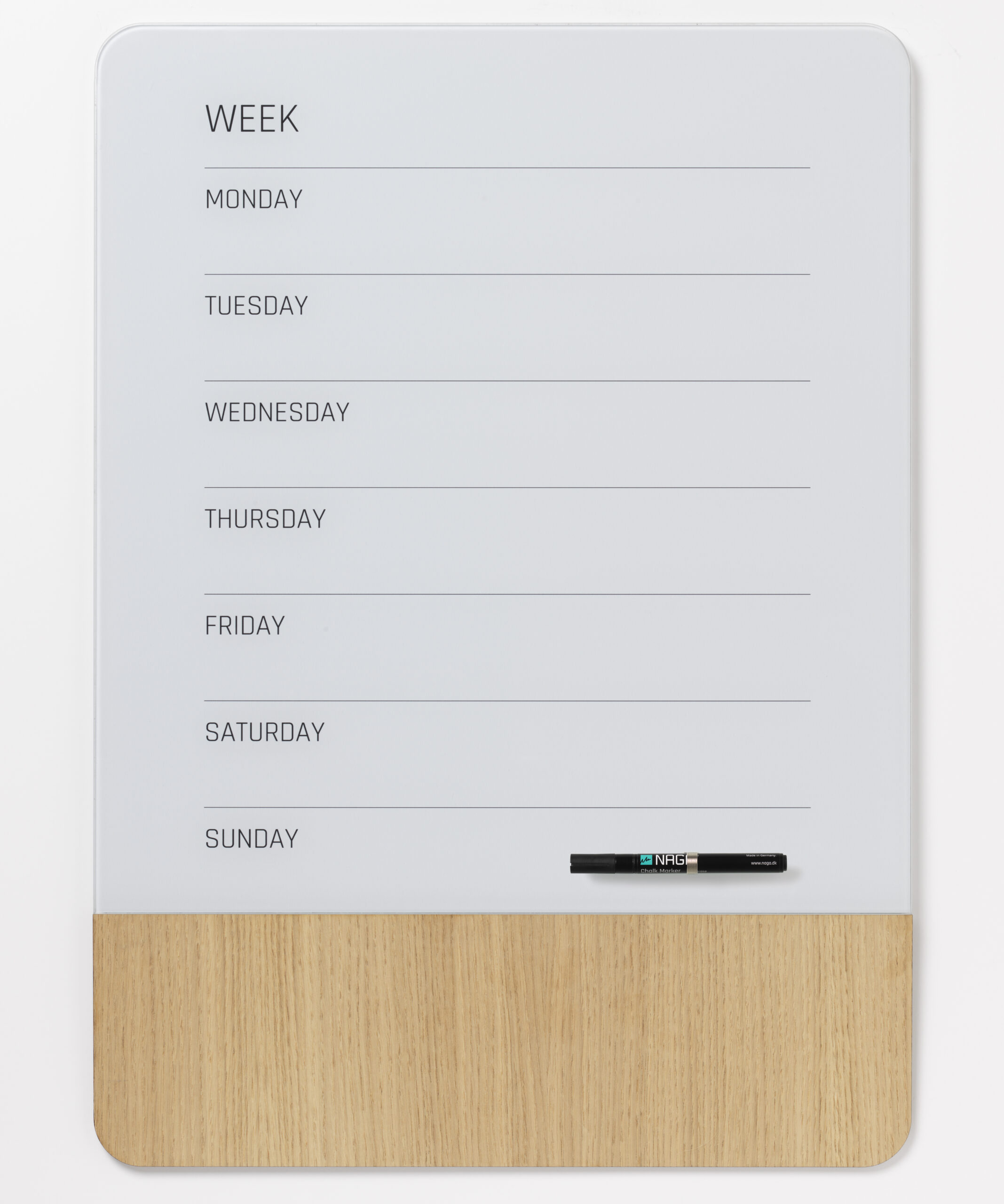 Magnetisk uge tavle 50 x 70 cm. Engelsk tekst.Tavlen er i en kombination af glas og finer, begge dele er magnetiske.Sæt ting på tavlen med Super Stærke magneter.Man kan skrive på glasset med en kridt marker, eller med en almindelig whiteboard marker. Når teksten er tør, kan den nemt viskes ud igen, brug en tavlesvamp eller en tør klud.Finer delen er 15 cm. bred og i natur materiale, og der vil derfor være naturlige variationer i overfladetekstur og farve. Overfladen påvirkes af lys, og vil, over tid, ændre tekstur og farve. Træet er ikke egnet til at skrive på.Ophæng: Tavlen leveres med skruer, rawlplugs, ophængs skabelon og 1 marker. Se monteringsvejledning under fanen vejledninger