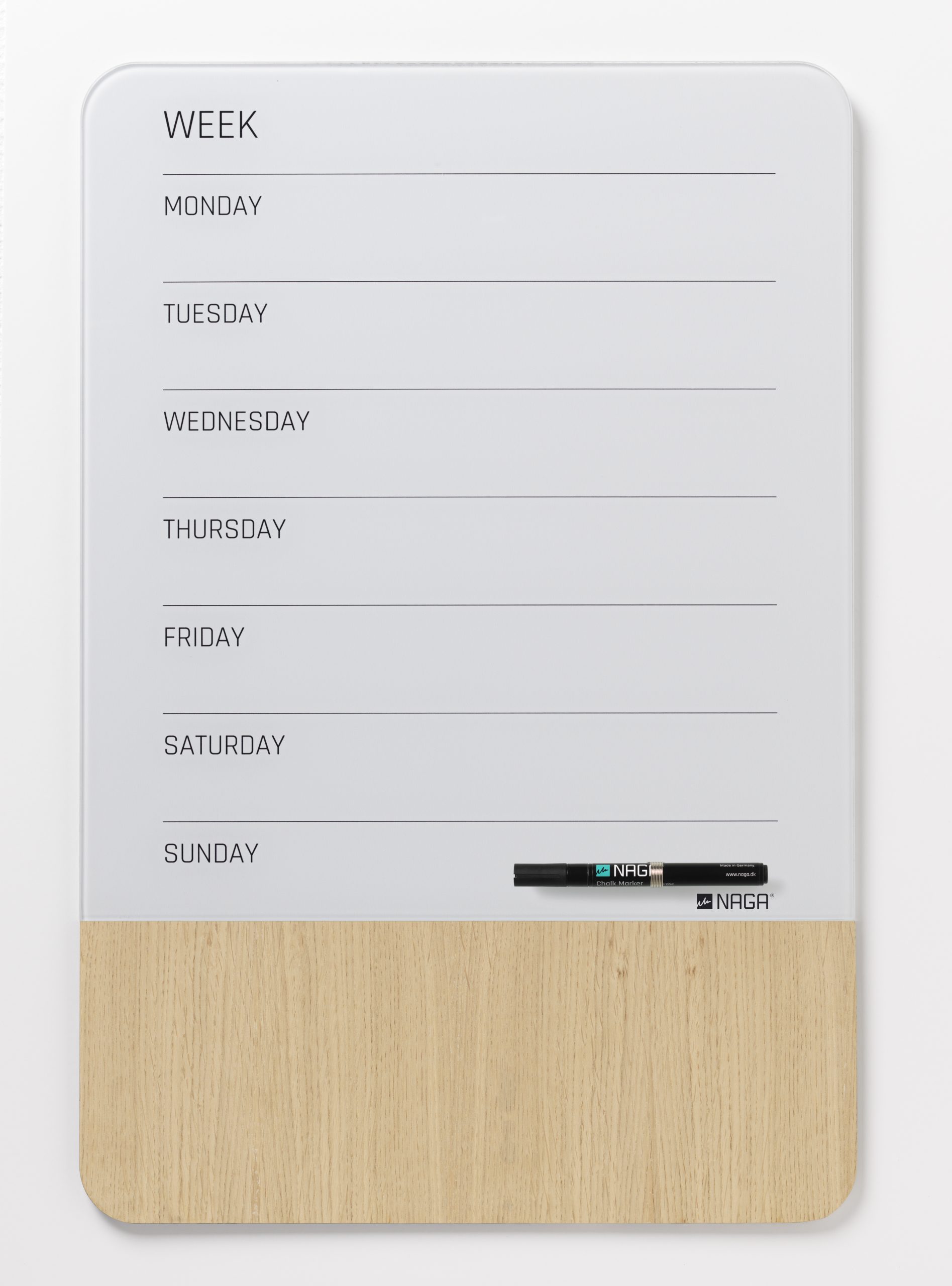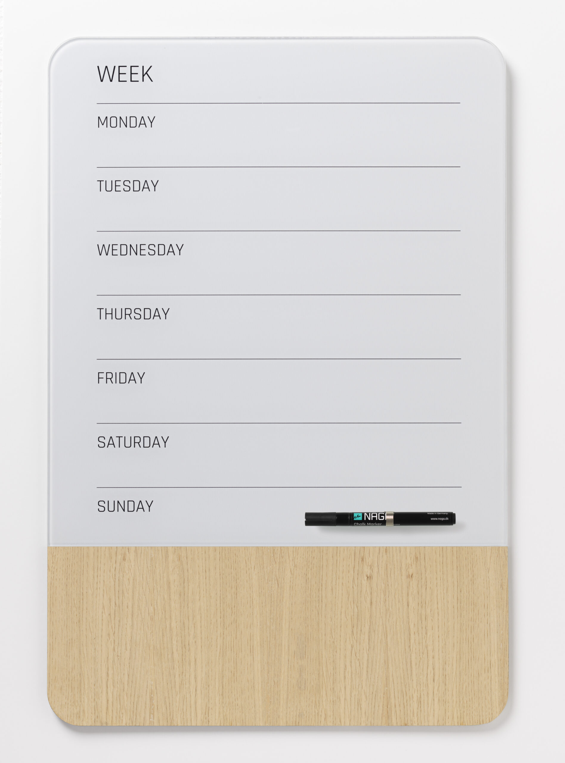 Magnetisk uge tavle 40 x 60 cm. Engelsk tekst.Tavlen er i en kombination af glas og finer, begge dele er magnetiske.Sæt ting på tavlen med Super Stærke magneter.Man kan skrive på glasset med en kridt marker, eller med en almindelig whiteboard marker. Når teksten er tør, kan den nemt viskes ud igen, brug en tavlesvamp eller en tør klud.Finer delen er 15 cm. bred og i natur materiale, og der vil derfor være naturlige variationer i overfladetekstur og farve. Overfladen påvirkes af lys, og vil, over tid, ændre tekstur og farve. Træet er ikke egnet til at skrive på.Ophæng: Tavlen leveres med skruer, rawlplugs, ophængs skabelon og 1 marker. Se monteringsvejledning under fanen vejledninger