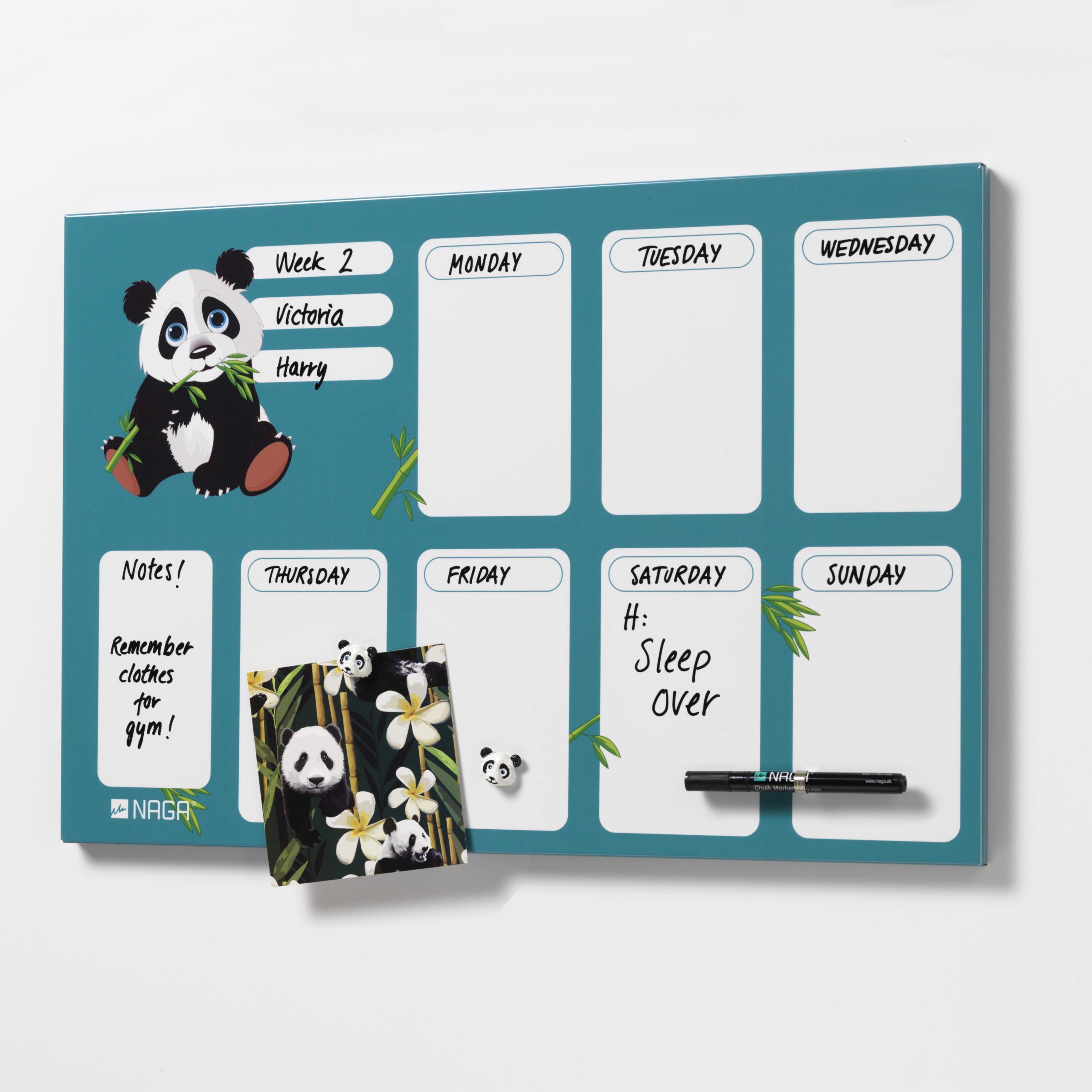 Ugetavle til børn med panda motivMagnetisk ugetavle i stål med fint panda motiv. Tavlen er perfekt til børn og passer ind på de fleste børneværelser eller i køkkenet. Gør det nemt for barnet selv at planlægge ugens aktiviteter, kan også anvendes som skoleskema.Du eller dit barn kan nemt skrive på tavlen med en kridt marker, eller med en almindelig whiteboard marker. Tavlen leveres inkl. 1 sort marker. Når teksten er tør, kan den nemt viskes ud igen, brug en tavlesvamp eller en tør klud. Sæt også ting fast på tavlen med magneter. Bemærk! Der kan anvendes almindelige magneter på denne tavle.Tavlen har huller til ophæng på bagsiden, og hænges op på væggen med 2 skruer, skruer medfølger ikke.Børnetavlen måler 60×40 cm og er beklædt med et beskyttende, lamineret folie.