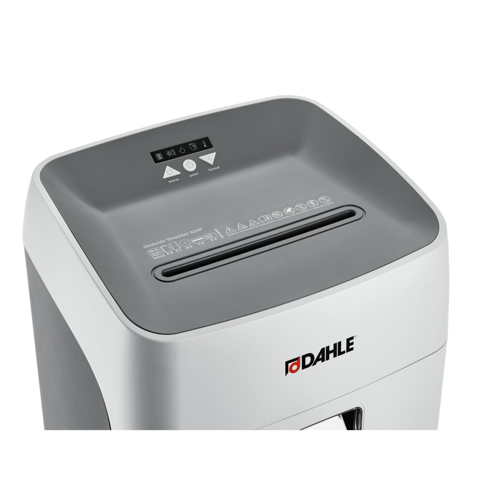 Dokumentmakulator DAHLE Deskside 404P, højkvalitets sammensatte stålruller, displayrude som optisk affaldsniveauindikator, udtrækbar affaldsbeholder, praktiske drejelige hjul, automatisk papirreverseringsfunktion. Olie- og vedligeholdelsesfri. Slukker automatisk, hvis den ikke bruges i 10 minutter. Makulerbare materialer: papir, kort, cd’er, dvd’er. Affaldsopsamlingsvolumen 40 liter. Sikkerhedsniveauer: Sikkerhedsniveauer: P-4/F-1/O-3/T-4/E-3. Makuleringsmekanisme aktiveret af fotoelektrisk sensor. Maks. antal ark pr. makuleringscyklus: 21-25 80 gsm ark. Partikelstørrelse: 4 x 35 mm. Tekniske data: Motorens strømforbrug: 690 W. Makuleringshastighed: 35 mm/s. Netfrekvens: 50 Hz. Netspænding: 230V. Mål (B x D x H): 425 x 351 x 696 mm. Farve: grå / tele grå. Certificering/godkendelse: GS-mærke