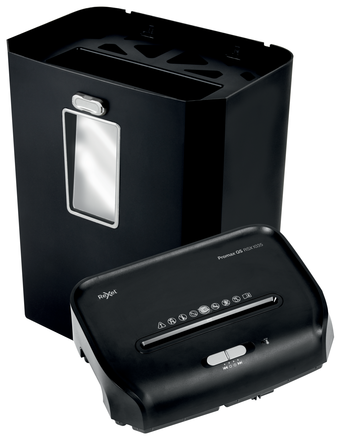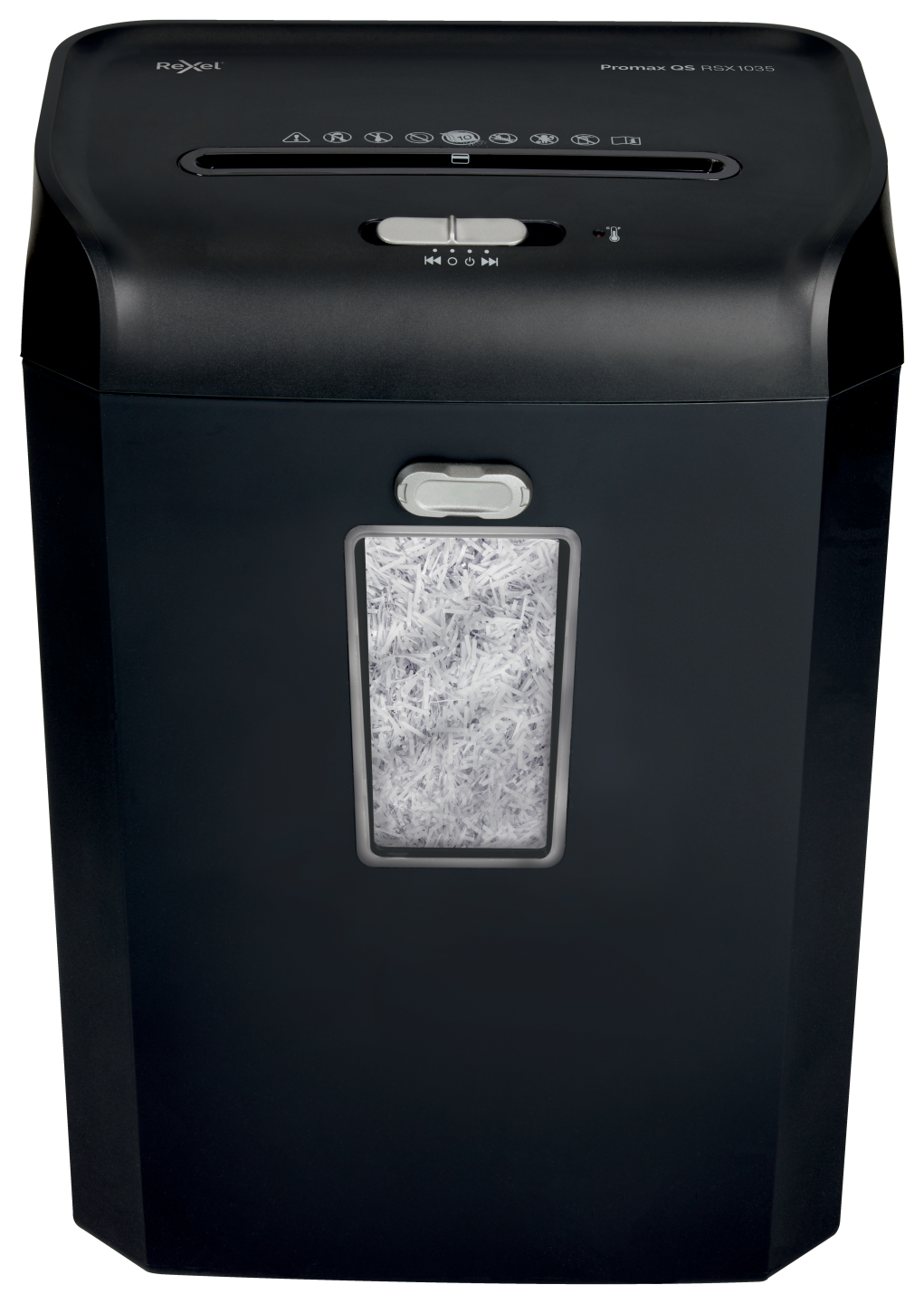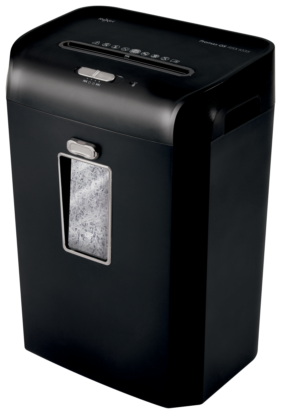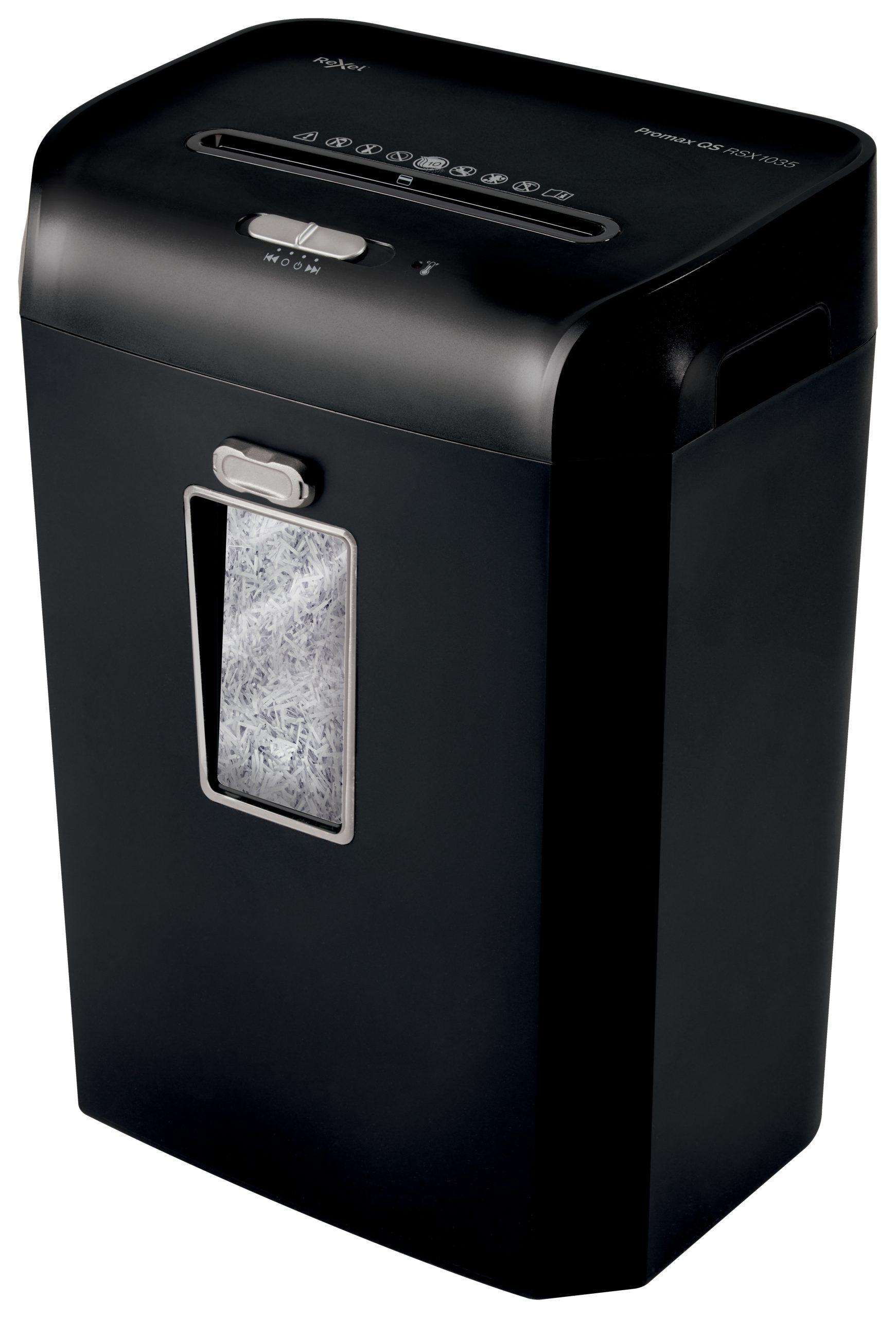 Promax QS RSX1035 makulerer op til 10 ark (80g) ad gangen til P-4 (4×40 mm) krydsmakuleringsstykker med en 35 liters affaldsbeholder, der kan indeholde 460 A4 ark.