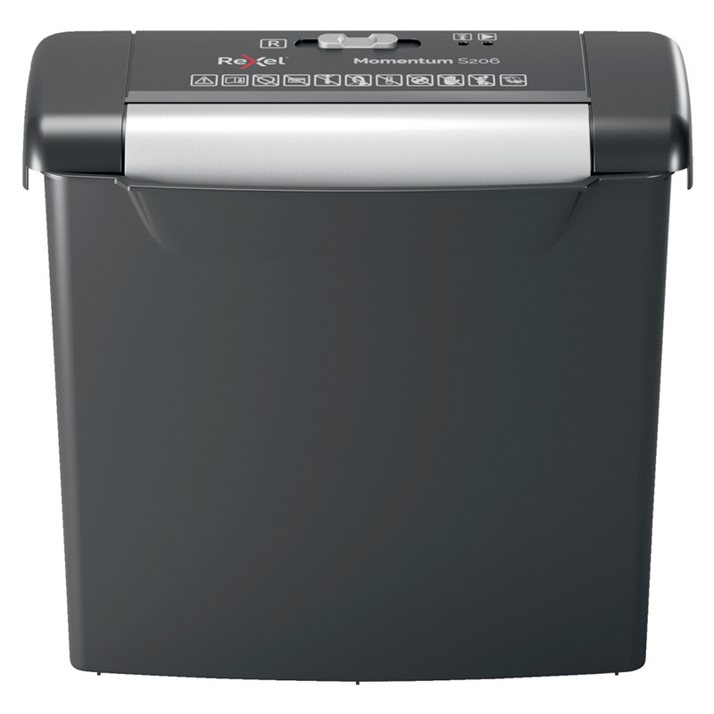 Rexel Momentum S206 makuleringsmaskine makulerer op til 6 ark på en gang med 2 minutters konstant makuleringstid. Ideel til på hjemmekontoret eller på små kontorer. P2, strimmelmakulering i 6 mm stykker. 9 liter beholder med 75 A4 ark kapacitet.