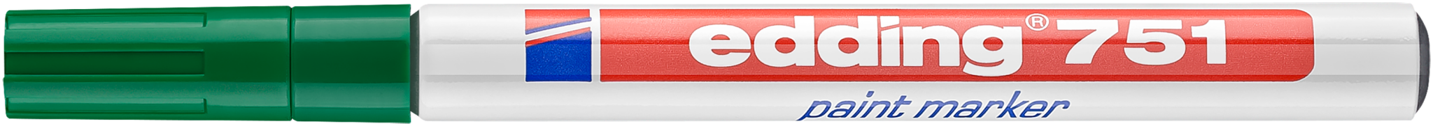 Edding 751 er en paintmarker med rund spids, der har en stregbredde på 1-2 mm. Paintmarkere fra Edding er designet til at skrive på næsten alle ikke-porøse overflader, er vandfast og kan holde til temperaturer på op til 1000 grader. Fås i gul, sølv, hvid, rød, blå, grøn og sort.