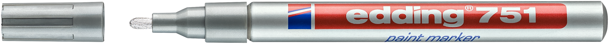 Edding 751 er en paintmarker med rund spids, der har en stregbredde på 1-2 mm. Paintmarkere fra Edding er designet til at skrive på næsten alle ikke-porøse overflader, er vandfast og kan holde til temperaturer på op til 400 grader. Fås i gul, sølv, hvid, rød, blå, grøn og sort.