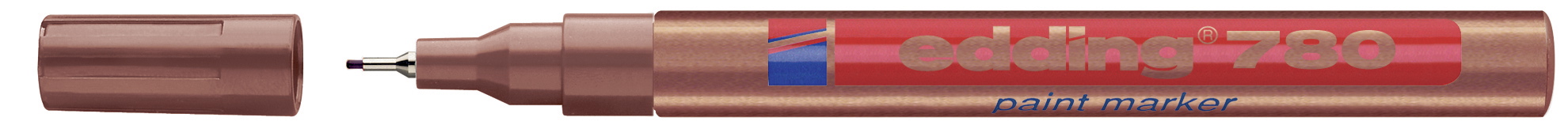 Edding 780 er en paintmarker med rund spids, der har en stregbredde på ca. 0,8 mm. Paintmarkere fra Edding er designet til at skrive på næsten alle ikke-porøse overflader, er vandfast og kan holde til temperaturer på op til 400 grader. Fås i guld, hvid, kobber, sort og sølv.