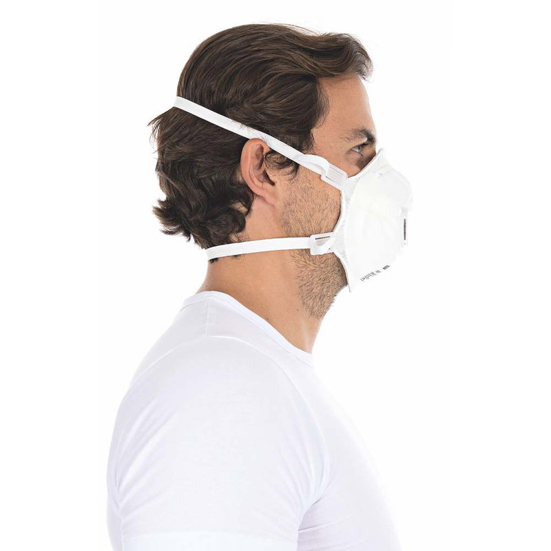 Åndedrætsværn FFP3 NR D med ventil, kopformet af PP . Dolomit-åndedrætsværnene opfylder de høje krav i kategori FFP3. Maskerne beskytter bæreren mod giftigt og skadeligt dolomitstøv, røg og aerosoler. De er lavet af højkvalitets PP-fleece og er særligt tætte. Den ergonomiske form sikrer en meget god, tæt pasform i ansigtet. Den integrerede ventil gør det meget lettere at trække vejret ind og ud og gør FFP3-masken behagelig at have på i lang tid. De elastiske overheadbånd er latexfrie og klemmer ikke bag ørerne. Disse dolomit FFP3 åndedrætsværn er ideelle til professionelle og høje beskyttelseskrav. De bruges især i industrien, men er også velegnede til fødevareindustrien og andre hygiejneområder. • Egenskaber ved åndedrætsværn FFP3 NR D med ventil, kopformet med et blik: • beskyttelse mod det fineste støv, også dolomitstøv • præformet kop, ergonomisk pasform • højkvalitets PP fleece • med ventil for lettere ind- og udånding • med pandebånd, uden tryk bag ørerne, latexfri • fleksibelt næsebånd • blød næsepude, høj bærekomfort