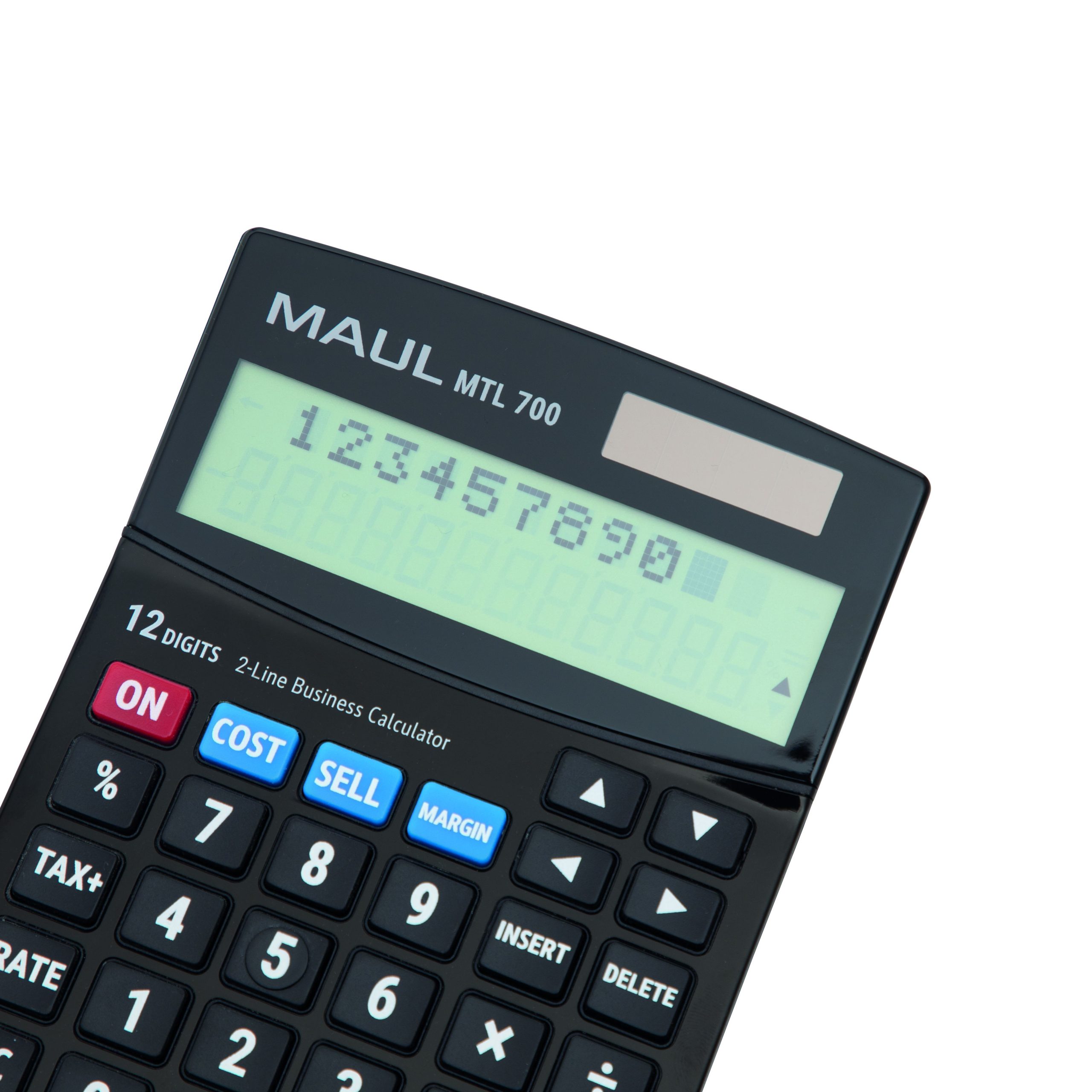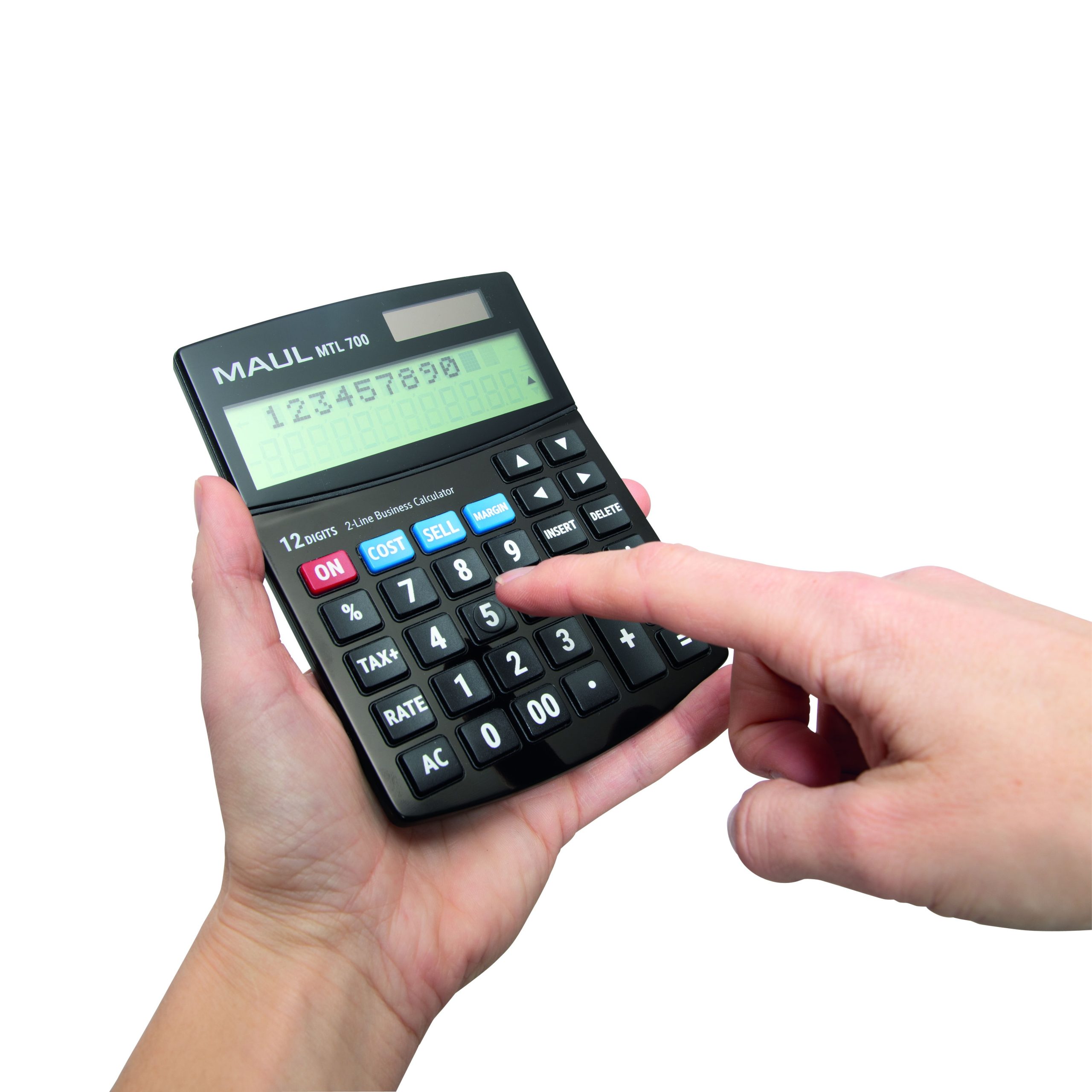 MAUL Regnemaskine MTL 700 MAUL MTL 700 er en professionel bordregnemaskine udviklet til erhverv og kontor. Med sit store 2-linjers LCD-display får du både overblik over indtastningen og det endelige resultat samtidig. Det gør det nemt at kontrollere beregninger og minimere fejl. Regnemaskinen er udstyret med 12 cifre og en række praktiske funktioner, der gør den særligt velegnet til handels- og økonomiberegninger. Med dedikerede COST-, SELL- og MARGIN-taster kan du hurtigt beregne kostpris, salgspris og dækningsgrad. Momsfunktionen gør det let at beregne priser med og uden moms, og RATE-tasten giver mulighed for at indstille og ændre momssats efter behov. Derudover har modellen procentfunktion, indsæt- og slettefunktion samt mulighed for at gennemse og rette tidligere beregninger via piletasterne. Den ergonomiske hældning sikrer en behagelig læsevinkel, og de robuste plasttaster er designet til daglig brug. ON-knappen samt margin-tasterne er fremhævet i signalfarver, så de er nemme at finde. Regnemaskinen har automatisk sluk-funktion og kombinerer solcelledrift med batteri (1 x LR1130 medfølger), hvilket sikrer energibesparende og stabil drift både på kontoret og på farten. Mål: 15,5 x 11,5 x 2,5 cm