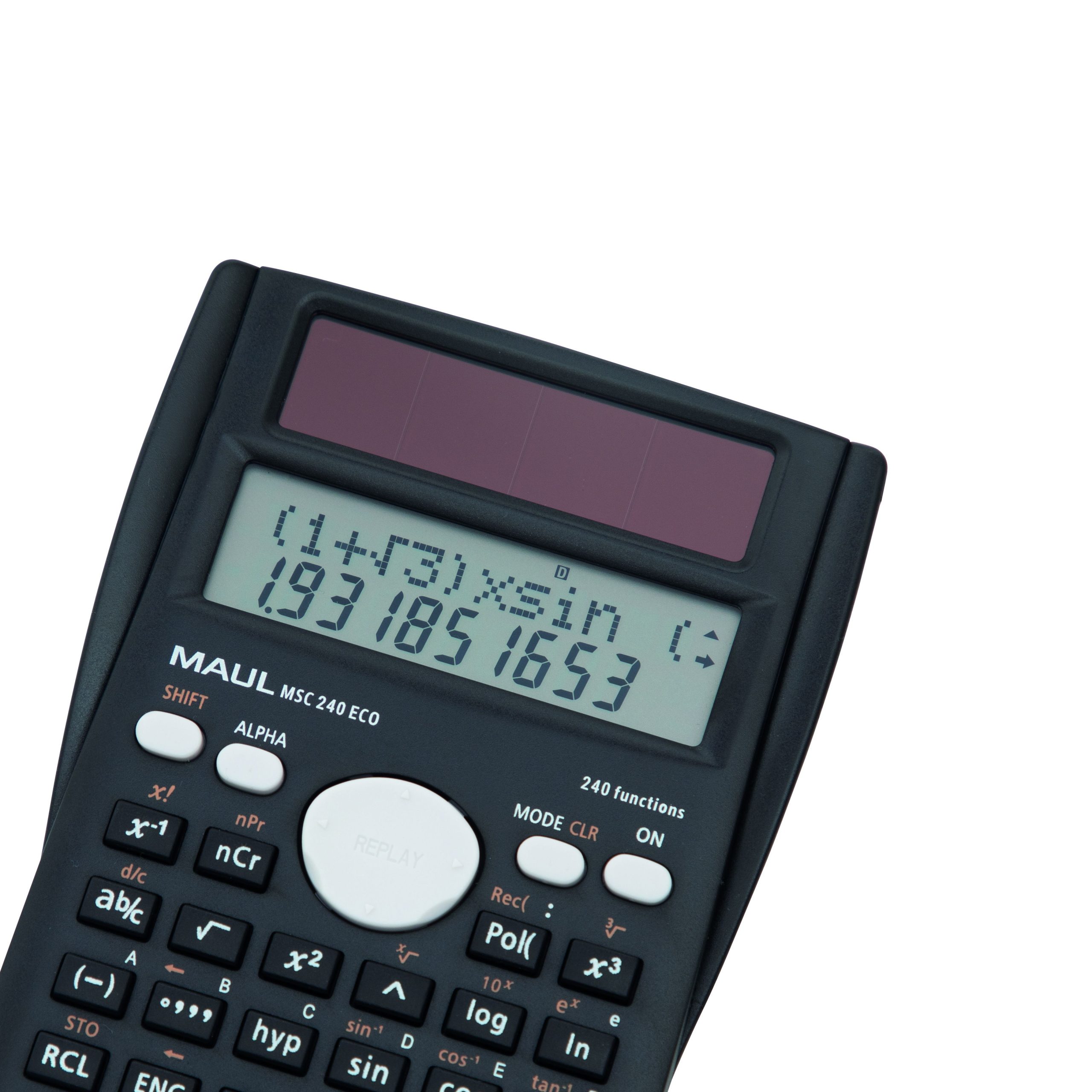 MAUL Videnskabelig lommeregner MSC 240 ECO MAUL MSC 240 ECO er en kraftfuld videnskabelig lommeregner udviklet til elever, studerende og professionelle, der har brug for præcise og avancerede beregninger i hverdagen. Med hele 240 funktioner håndterer den alt fra trigonometriske beregninger og logaritmer til statistik, potenser og brøker. Det 2-linjers LCD-display med 10+2 cifre viser både indtastning og resultat og gengiver matematiske tegn og symboler tydeligt, så du bevarer overblikket i komplekse udregninger. Den intuitive tastaturstruktur med SHIFT- og ALPHA-funktioner gør det let at navigere mellem de mange funktioner, og replay-funktionen giver mulighed for at gennemse og rette tidligere beregninger. Regnemaskinen er solcelledrevet og kræver ingen batteriudskiftning. Regnemaskinen har automatisk sluk-funktion for at spare energi. Kabinettet er fremstillet af 80% genanvendt plast. Modellen leveres desuden med et robust beskyttelsescover, der gør den velegnet til transport i taske eller rygsæk. Mål: 16,1 x 8,5 x 2,1 cm