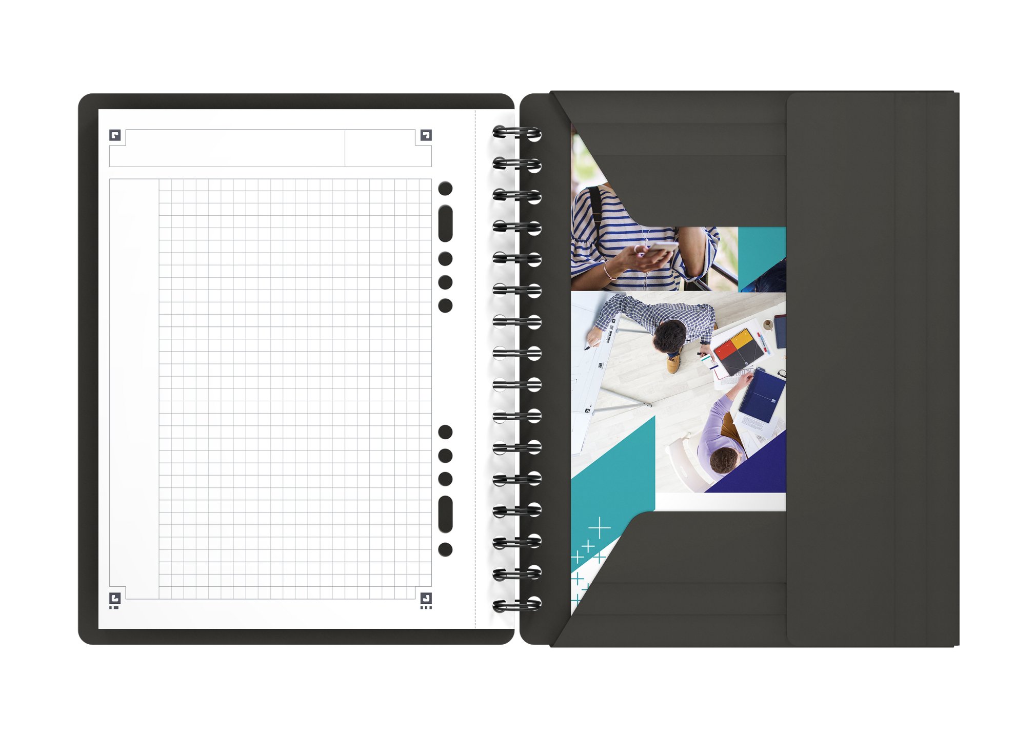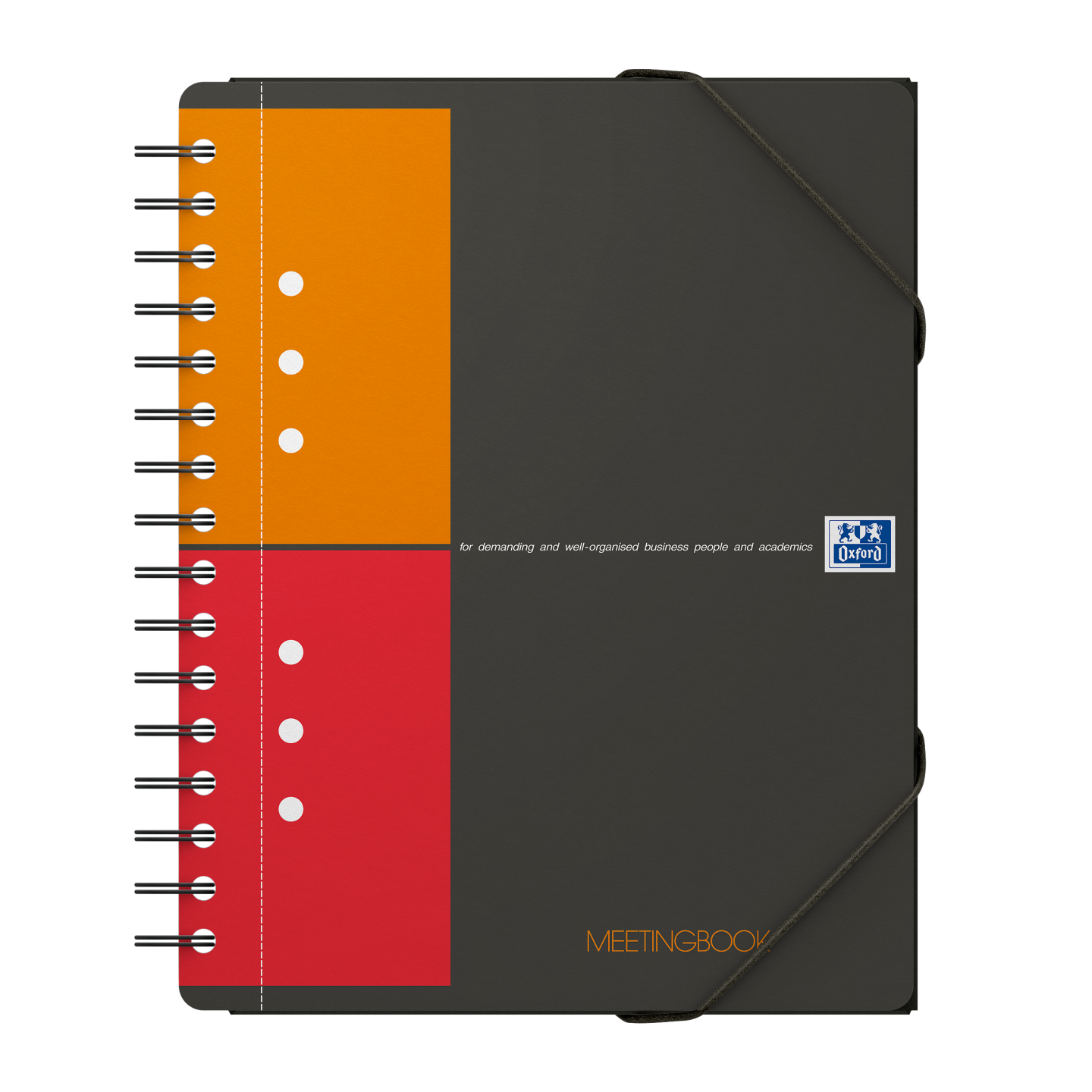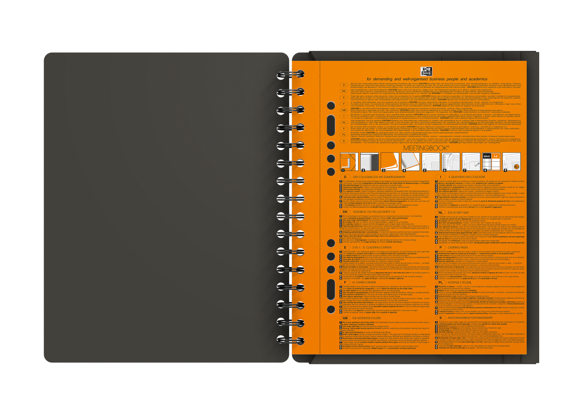 Meetingbook i A5+, kvadreret 5×5 mm med margen, perforeret og udstanset med 4 huller, 160 sider. Med det lette, glatte og hvide Optik Paper® i 80 g/m2 kan du skrive på begge sider af arket, uden at blækket bløder igennem. Siderne er udstyret med smart linjering og sidehoved, hvor du kan skrive mødets emne eller en overskrift foruden datoen, samt dobbelt margen, så du kan nummerere eller fremhæve punkter. Robust, sort dobbeltspiral i ryggen sikrer holdbarheden og gør det samtidig muligt at lægge notesbogen fladt mod underlaget eller at åbne den helt op, hvilket sikrer maksimal komfort og fleksibilitet. Det vandtætte omslag af grå polypropylen er rivfast og kan modstå masser af slid og strabadser i lang tid fremover. Arkene er kompatible med den gratis Scribzee®-smartphoneapp, så du nemt kan scanne, gemme og organisere dine noter. OXFORDs eksklusive Optik Paper® har både fået EUs miljømærke (lav miljøbelastning fra de papirfabrikker, der producerer papiret) og PEFC-certificering (bæredygtig skovforvaltning). Meetingbook er en 2-i-1-notesbog og mappe med 3 flapper, der sikrer, at du altid møder velforberedt op til dine møder. Elastiklukningen sikrer, at de ting, du opbevarer i notesbogen, bliver liggende trygt og sikkert under transport. Mappens sideflap kan også bruges som bogmærke, så du hurtigt kan finde den første ubeskrevne side. Det ekstra stive bagpap sikrer, at det er behageligt at tage noter helt frem til sidste side.