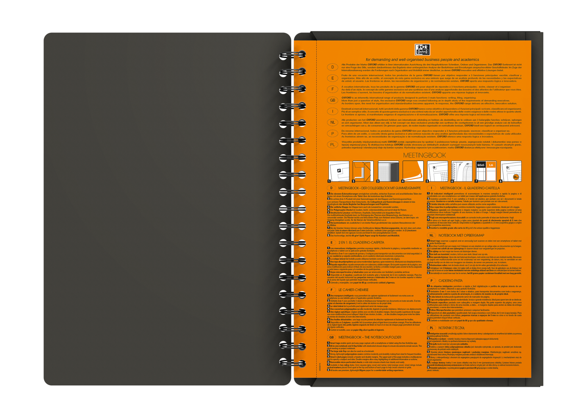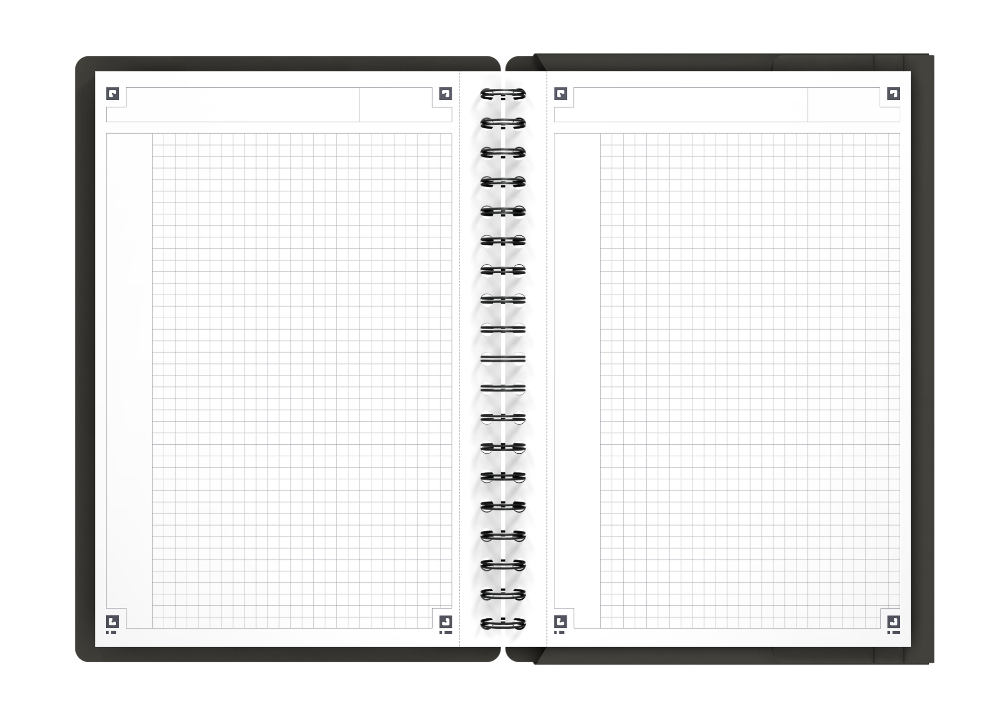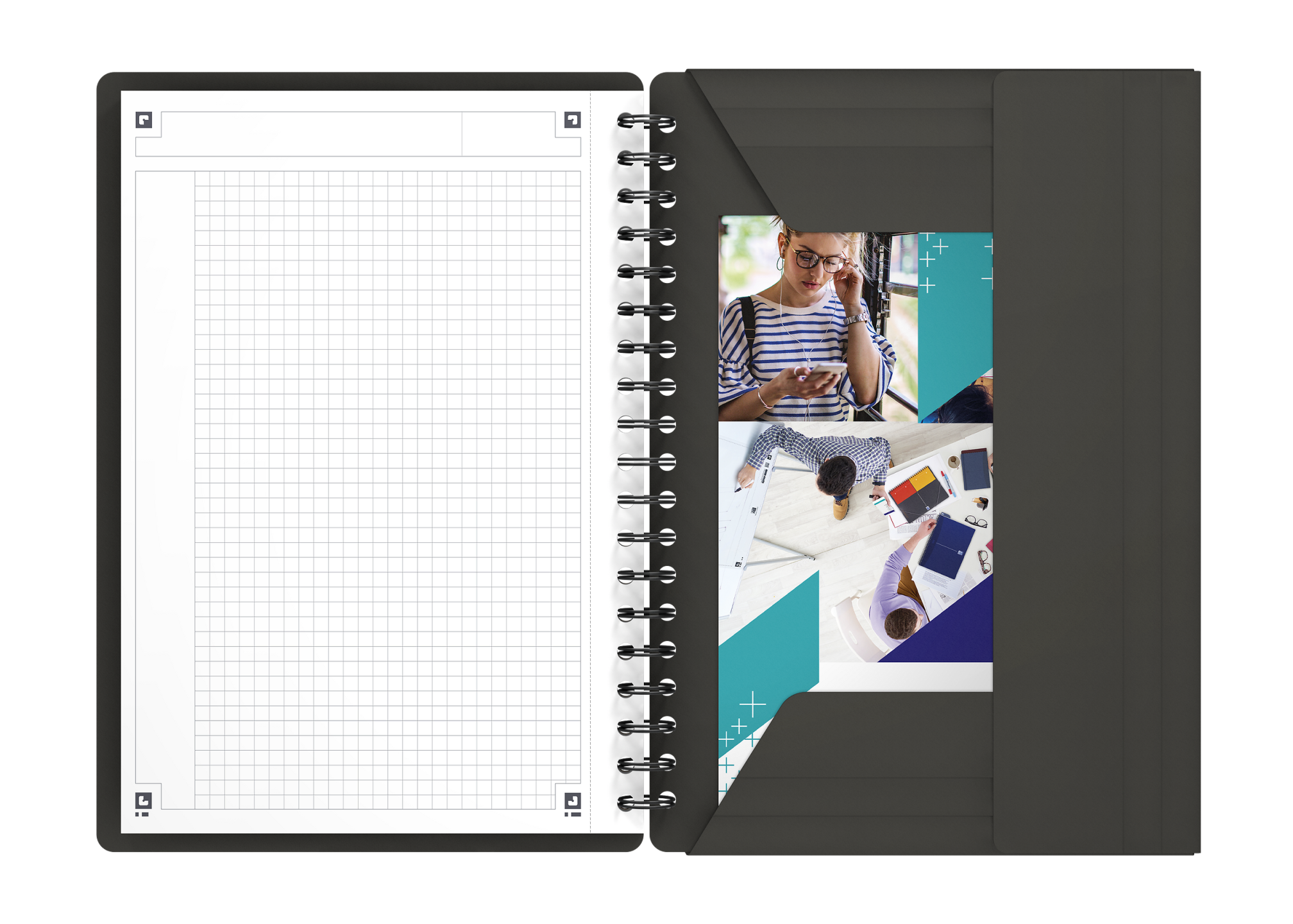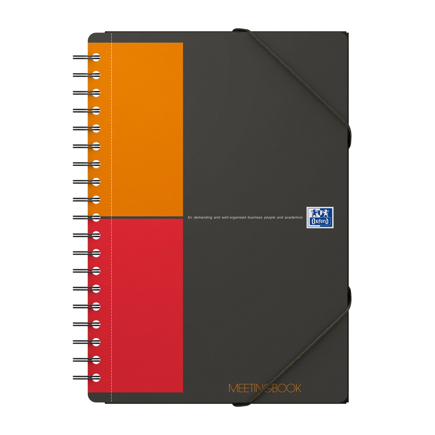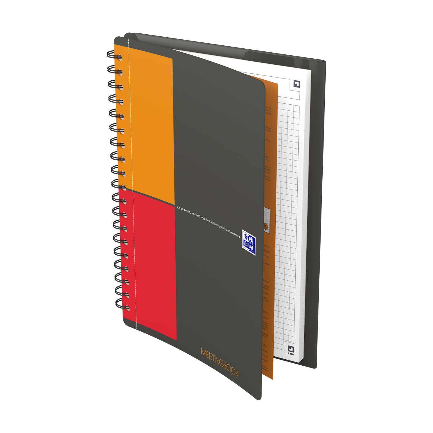 Meetingbook i B5, kvadreret 5×5 mm med margen, 160 perforerede sider. Med det lette, glatte og hvide Optik Paper® i 80 g/m2 kan du skrive på begge sider af arket, uden at blækket bløder igennem. Siderne er udstyret med smart linjering og sidehoved, hvor du kan skrive mødets emne eller en overskrift foruden datoen, samt dobbelt margen, så du kan nummerere eller fremhæve punkter. Robust, sort dobbeltspiral i ryggen sikrer holdbarheden og gør det samtidig muligt at lægge notesbogen fladt mod underlaget eller at åbne den helt op, hvilket sikrer maksimal komfort og fleksibilitet. Det vandtætte omslag af grå polypropylen er rivfast og kan modstå masser af slid og strabadser i lang tid fremover. Arkene er kompatible med den gratis Scribzee®-smartphoneapp, så du nemt kan scanne, gemme og organisere dine noter. OXFORDs eksklusive Optik Paper® har både fået EUs miljømærke (lav miljøbelastning fra de papirfabrikker, der producerer papiret) og PEFC-certificering (bæredygtig skovforvaltning). Meetingbook er en 2-i-1-notesbog og mappe med 3 flapper, der sikrer, at du altid møder velforberedt op til dine møder. Elastiklukningen sikrer, at de ting, du opbevarer i notesbogen, bliver liggende trygt og sikkert under transport. Mappens sideflap kan også bruges som bogmærke, så du hurtigt kan finde den første ubeskrevne side. Det ekstra stive bagpap sikrer, at det er behageligt at tage noter helt frem til sidste side.