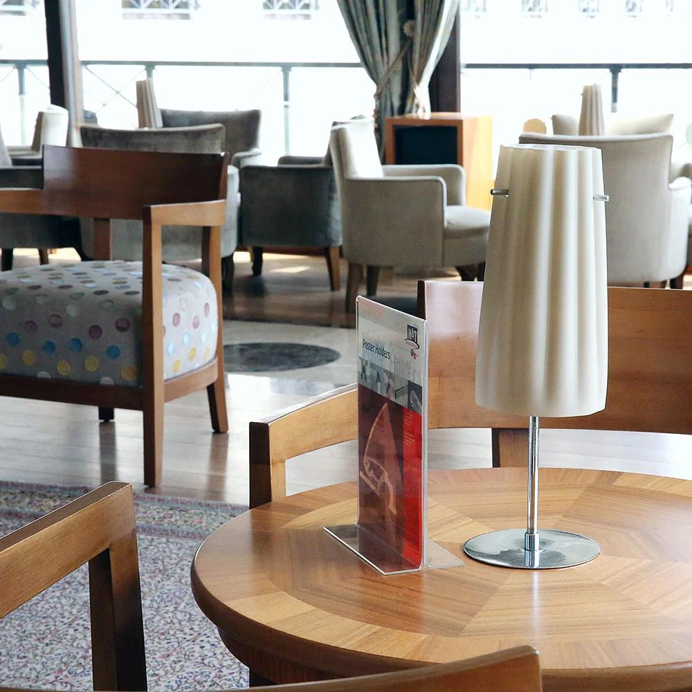 Menuholder produceret i transparent akryl. Lodret fritstående.