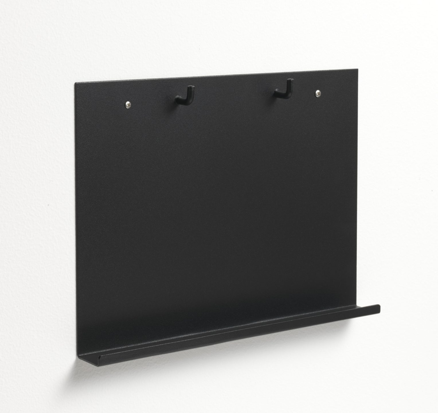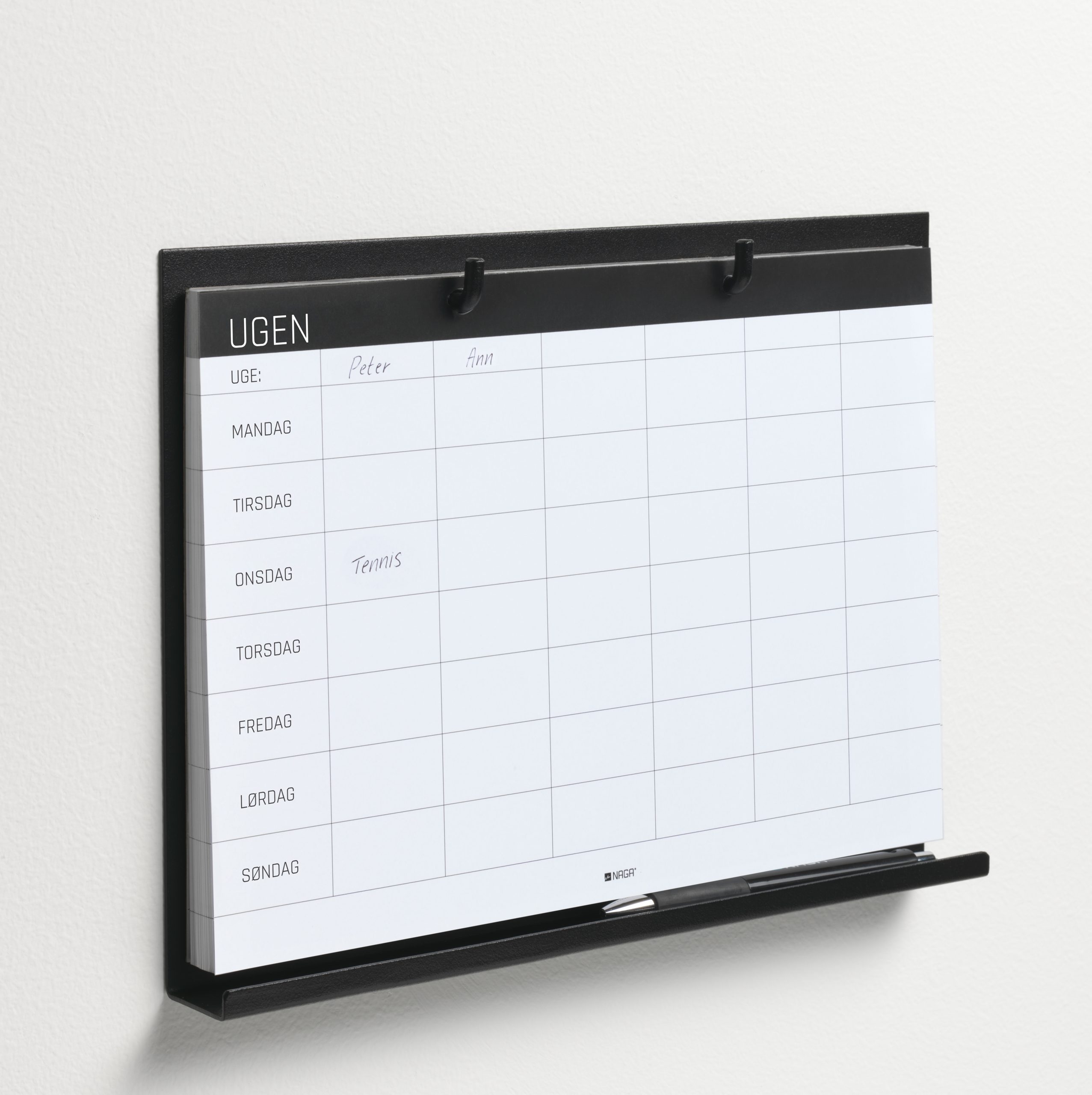 Metal tavle 31 x 23 x 3,5 cm. Sort. Med indbygget pennebakke. 2 huller til ophæng med skruer i væggen. Inkl. Dansk A4 blok med ugeplan, 52 sider, 120 gr. Ekstra planlægnings blokke kan købes separat.