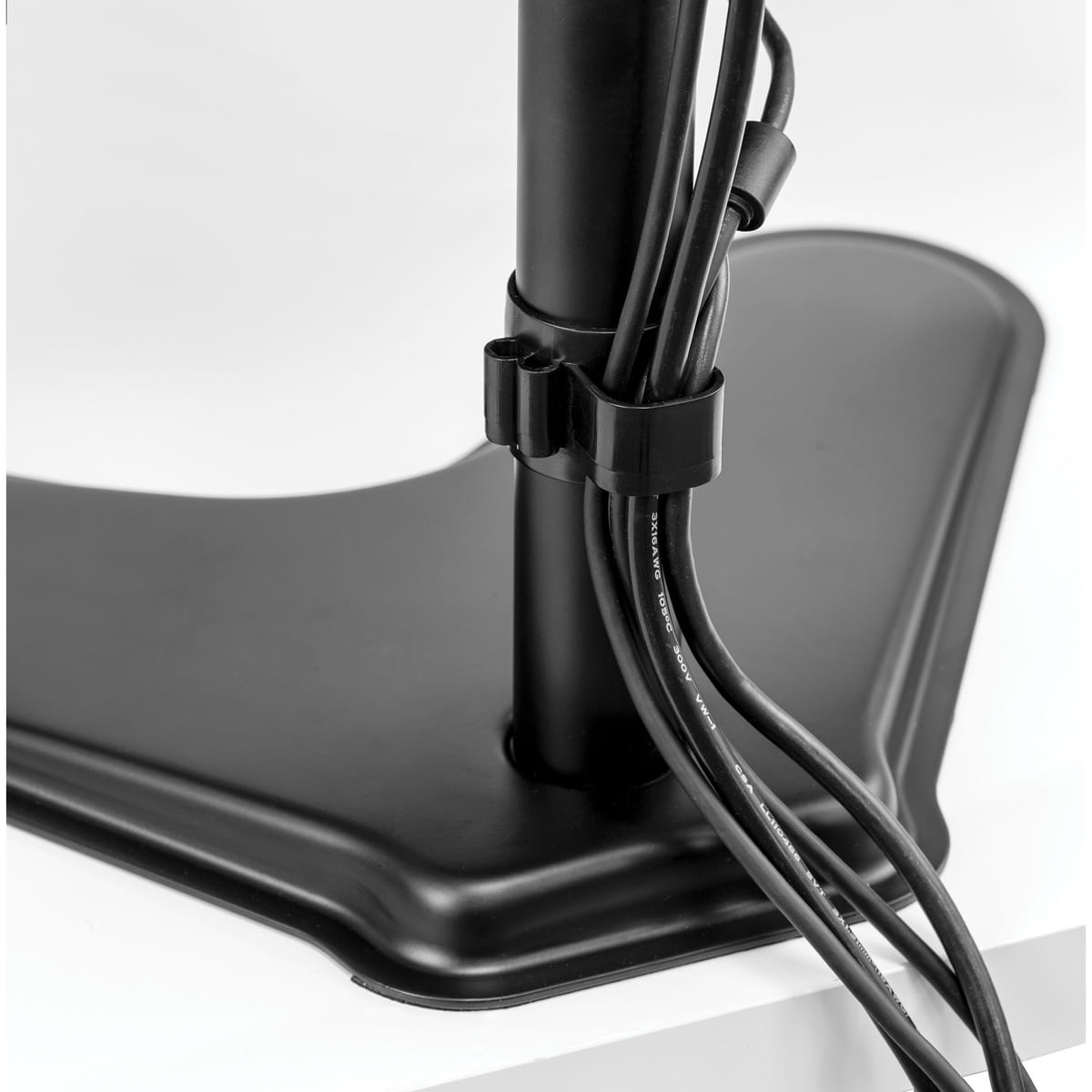 Fritstående design giver mulighed for en monitorarm til to horisontale skærme i rum, der ikke tillader montering med klemme eller gennemføring. Den vægtede base giver øget stabilitet. Kan holde skærme op til 32 tommer / 8 kg (pr. skærm). Indbygget kabelstyring minimerer rod.