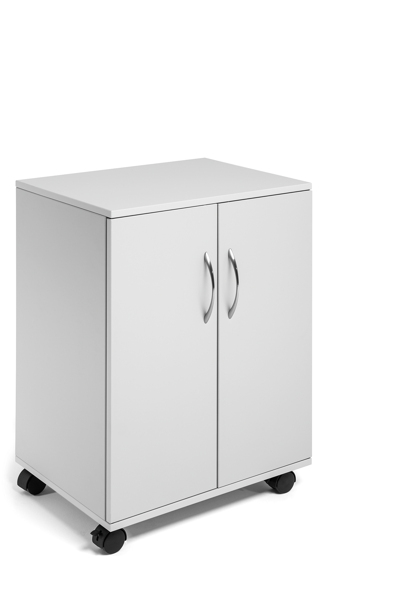 Vogn/skab med to fløj døre, velegnet som nærarkiv. Lavet af 16 mm tyk melamin træ med fire hjul, to er udstyret med bremser til stabilitet under brug. Fire hylder (inkl. øverste hylde) til ringbinder, papir og kontorudstyr, to hylder er flytbare. Maks belastning pr hylde er 30 kg. Leveres flad pakket med monteringsvejledning. Mål:BxHxD 528x748x400