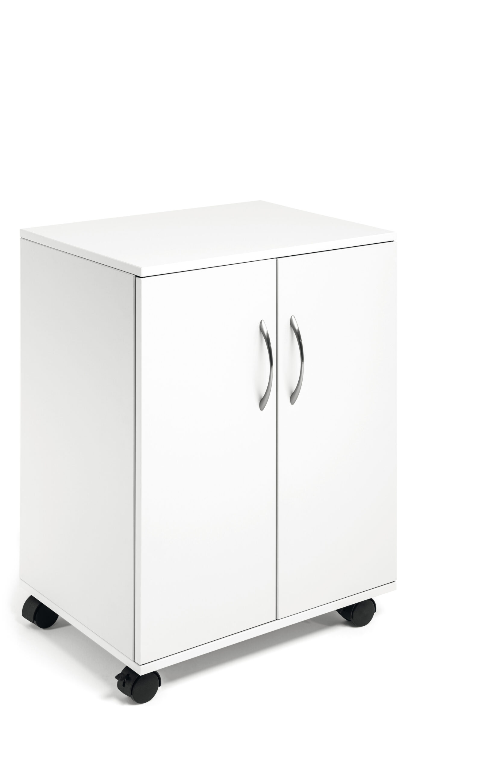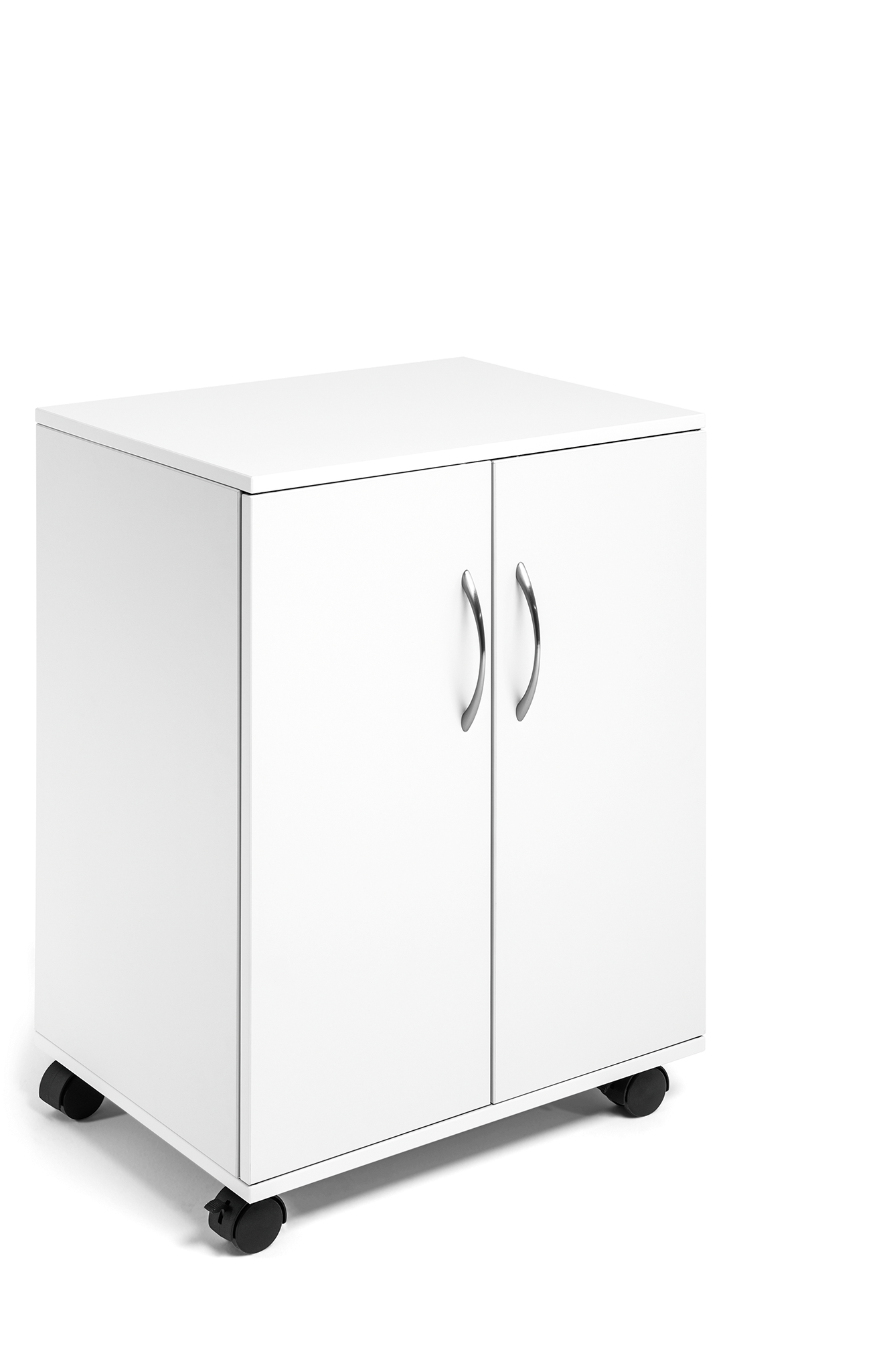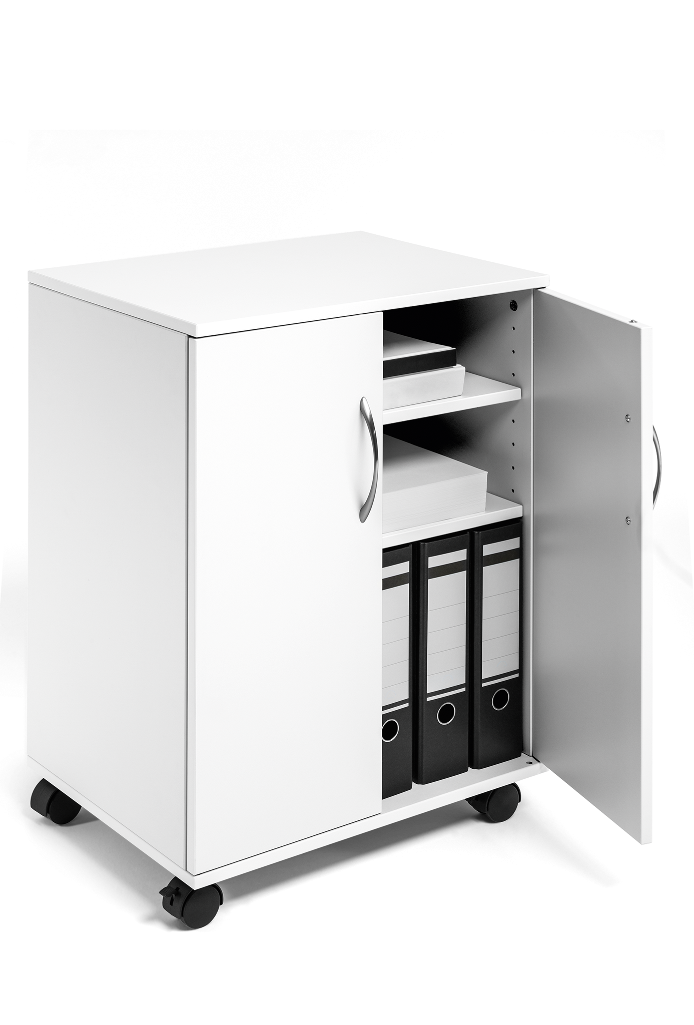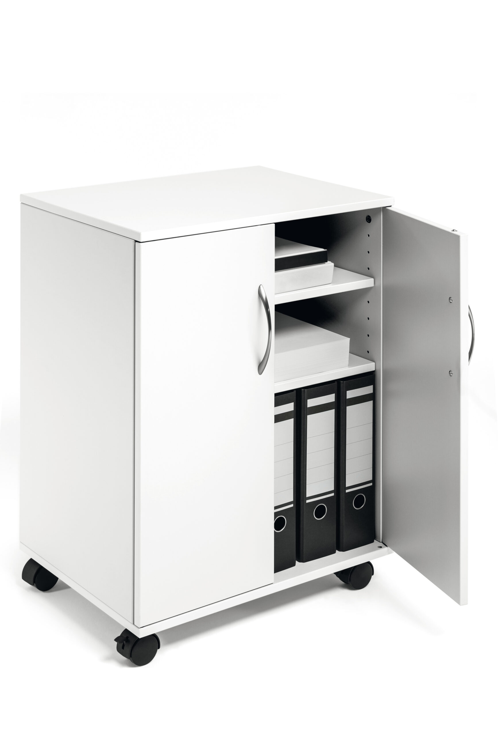 Vogn/skab med to fløj døre, velegnet som nærarkiv. Lavet af 16 mm tyk melamin træ med fire hjul, to er udstyret med bremser til stabilitet under brug. Fire hylder (inkl. øverste hylde) til ringbinder, papir og kontorudstyr, to hylder er flytbare. Maks belastning pr hylde er 30 kg. Leveres flad pakket med monteringsvejledning. Mål:BxHxD 528x748x400
