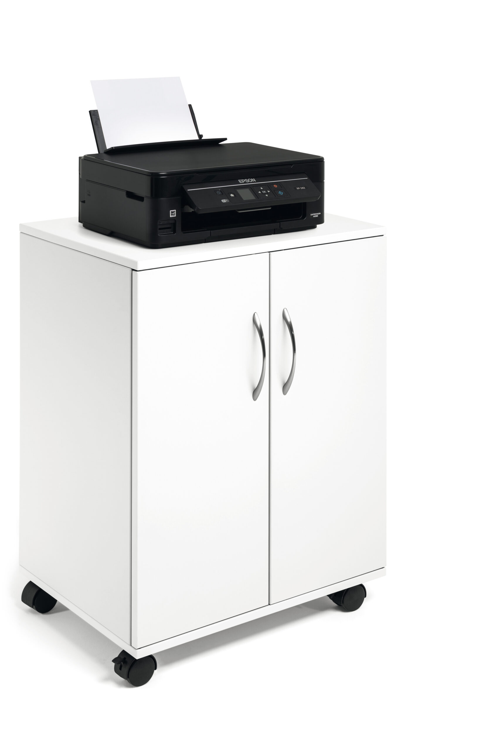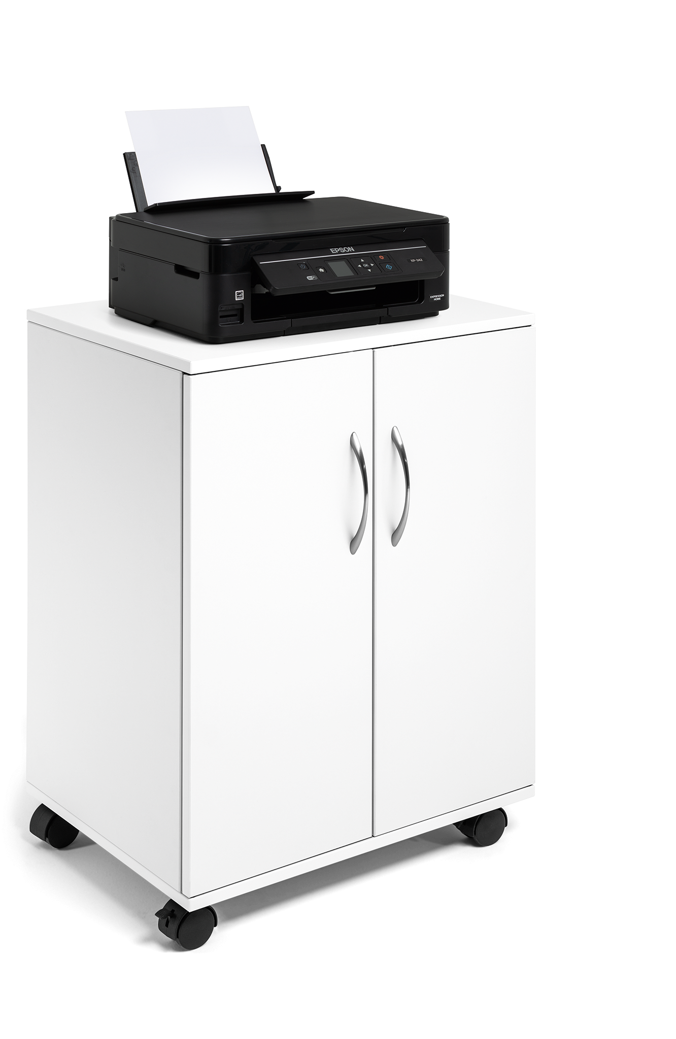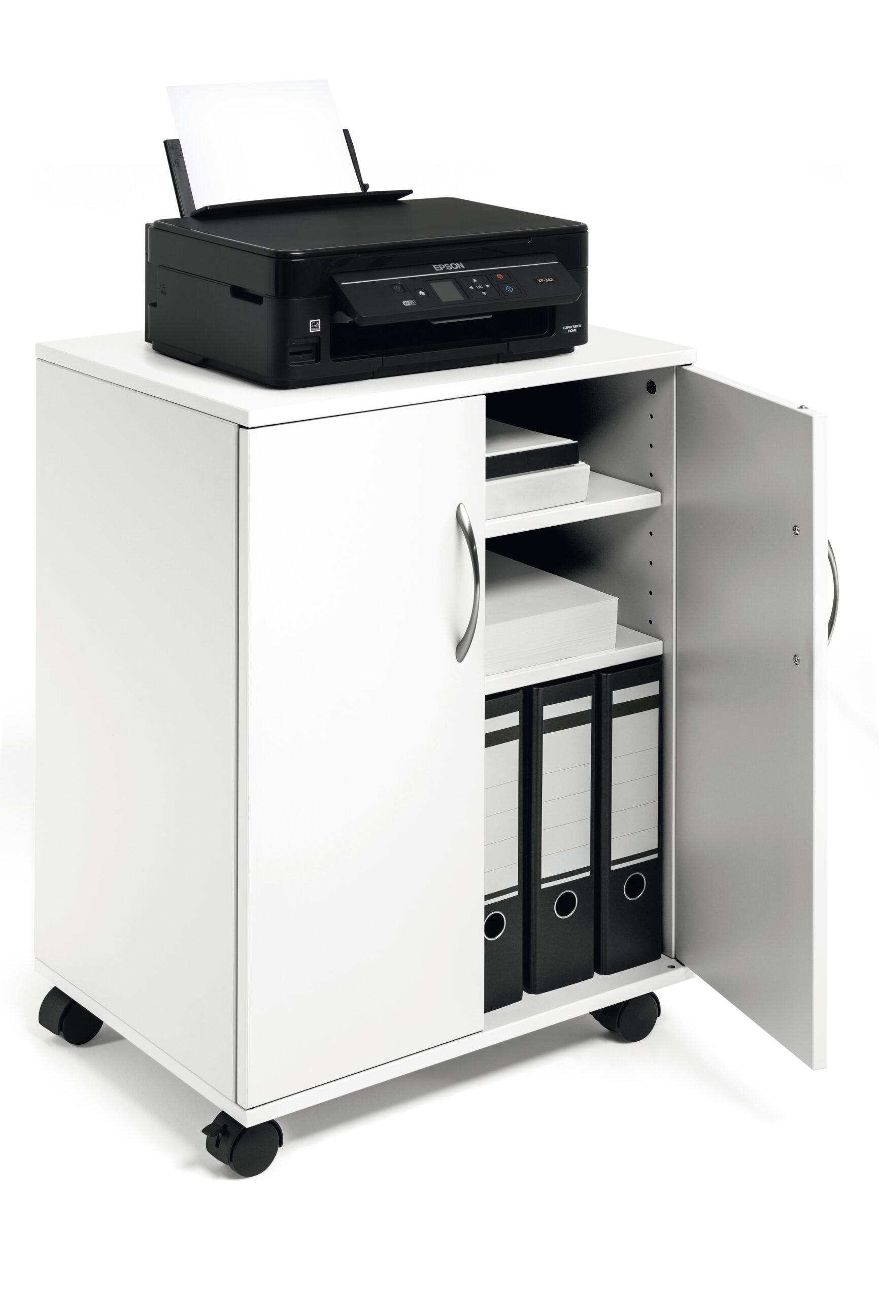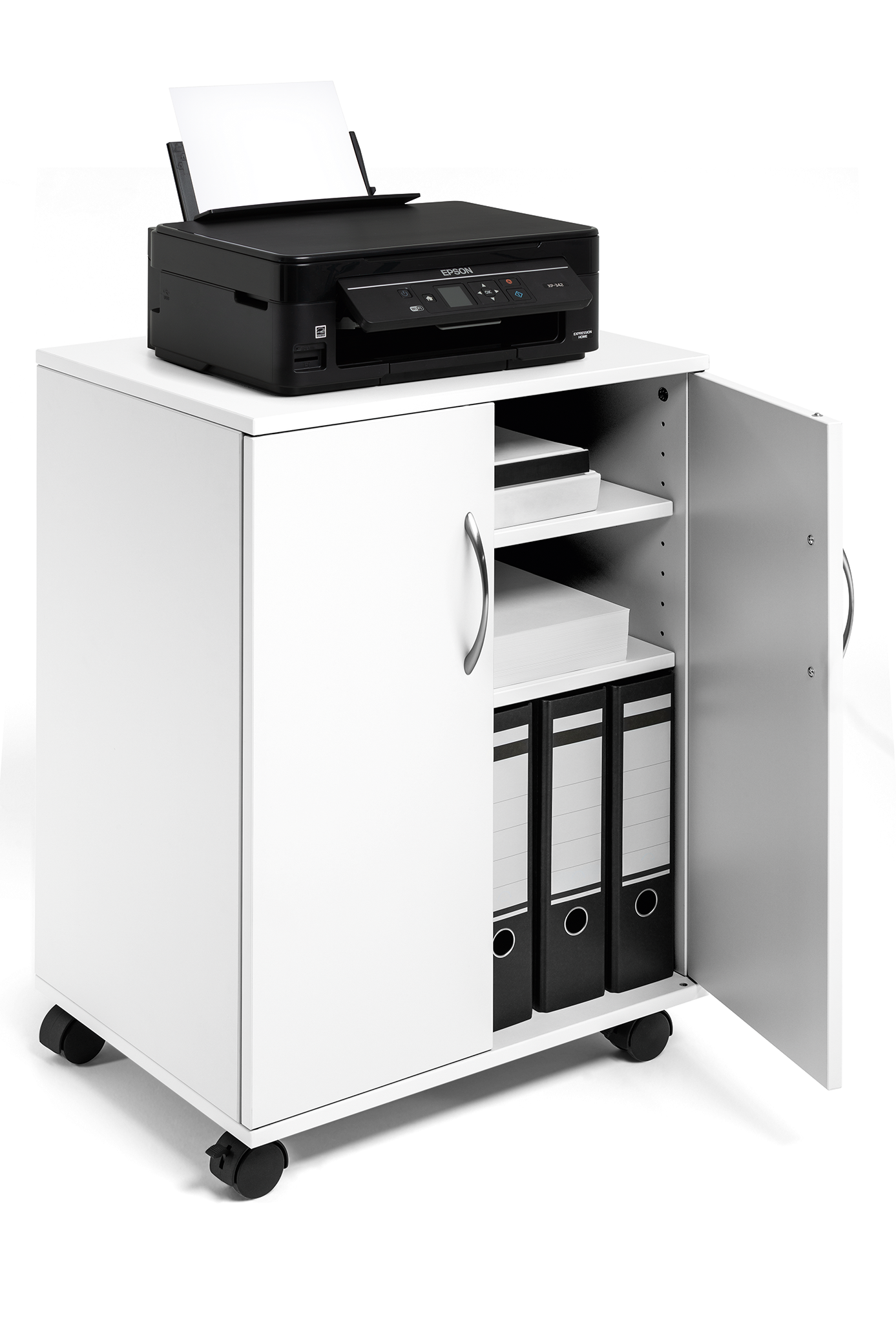Vogn/skab med to fløj døre, velegnet som nærarkiv. Lavet af 16 mm tyk melamin træ med fire hjul, to er udstyret med bremser til stabilitet under brug. Fire hylder (inkl. øverste hylde) til ringbinder, papir og kontorudstyr, to hylder er flytbare. Maks belastning pr hylde er 30 kg. Leveres flad pakket med monteringsvejledning. Mål:BxHxD 528x748x400