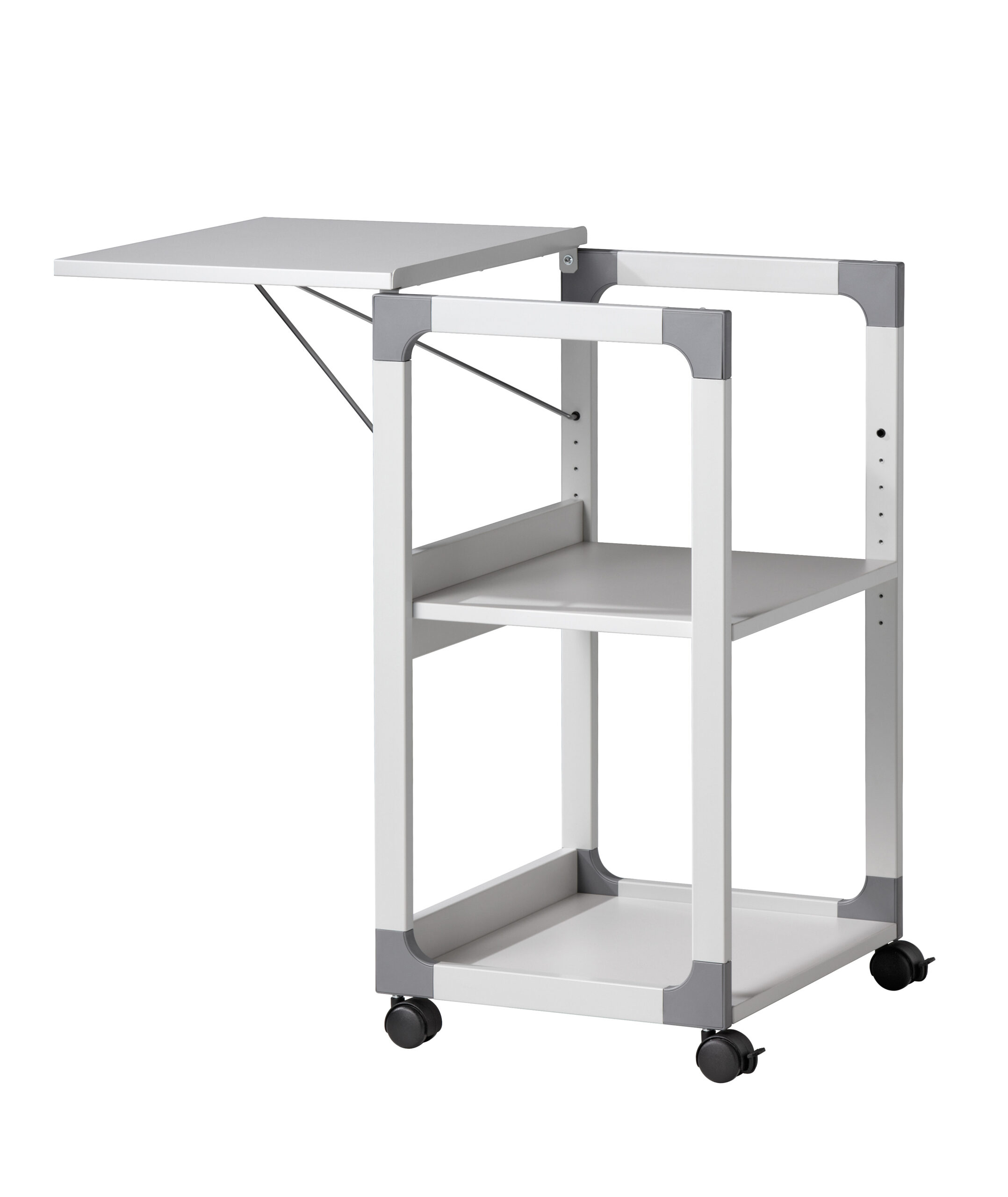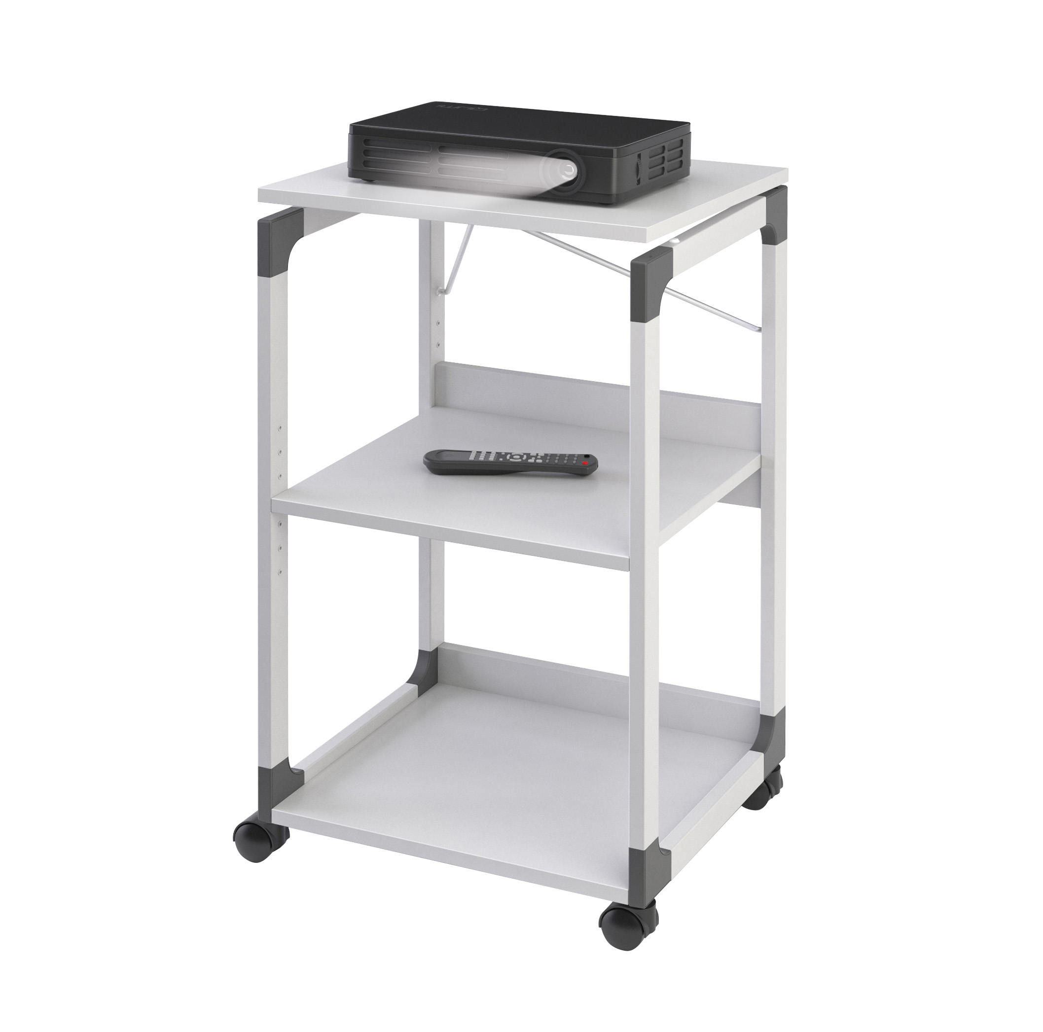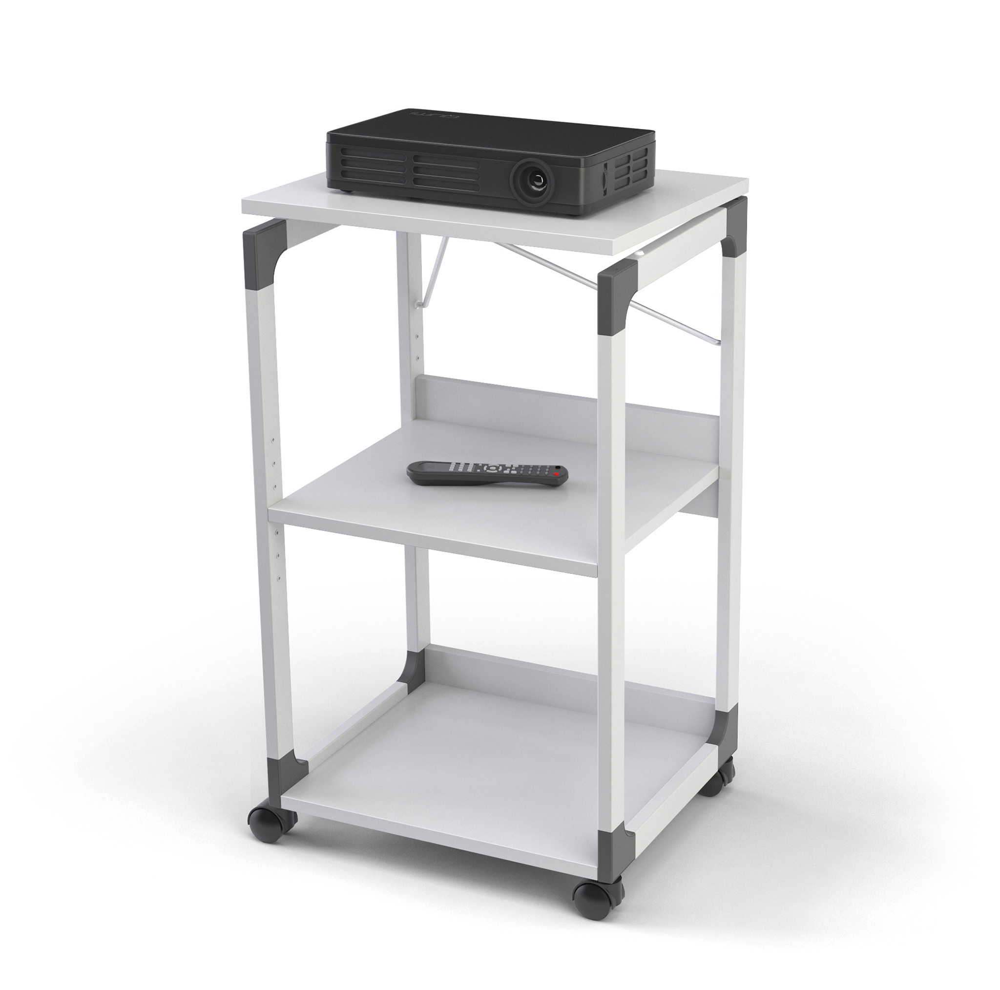 • Rullebord til projektorer • Fleksibel anvendelse, da højden af den midterste hylde kan justeres (i intervaller på 32 mm), og den øverste plade kan vippes for at tilpasse projektorens hældning eller klappes ud 180° til brug med en overheadprojektor • Fleksibel takket være 4 hjul, 2 af dem med bremse • Robust med hylder af slidstærke plader (19 mm) • Enkel montering vha. den medfølgende vejledning • Stabil ramme af ridsefast stål med glasfiberforstærkede plasthjørner
