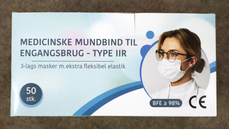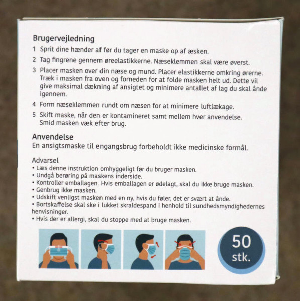 Pakke med 50 stk. CE godkendte IIR mundbind med næseklemme og øreelastik.
