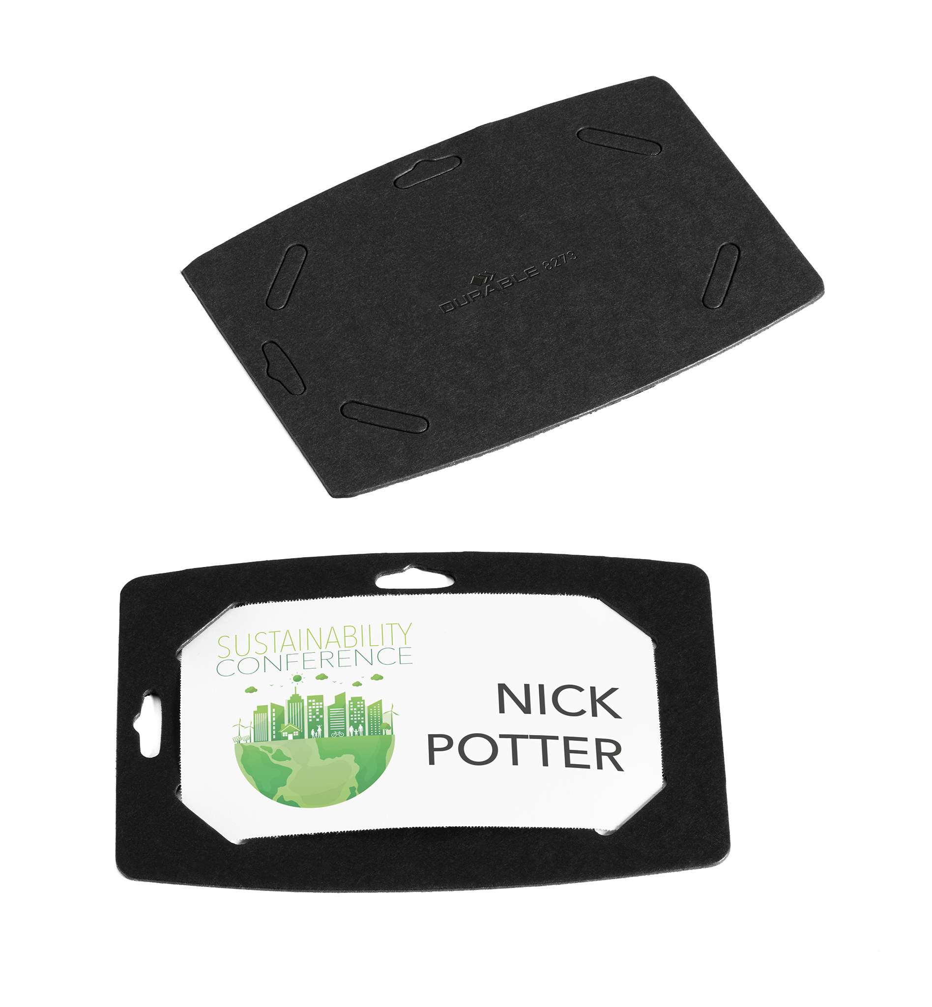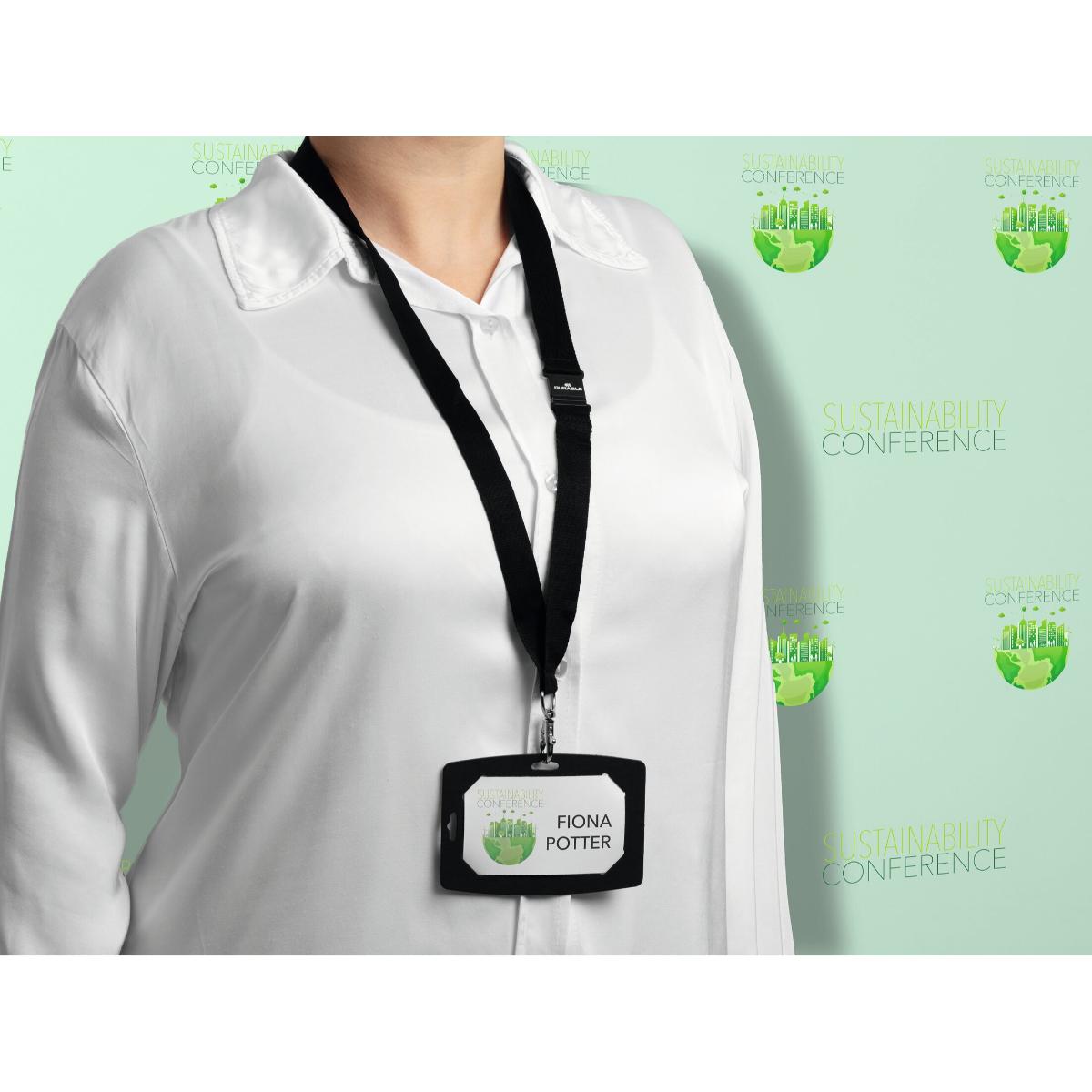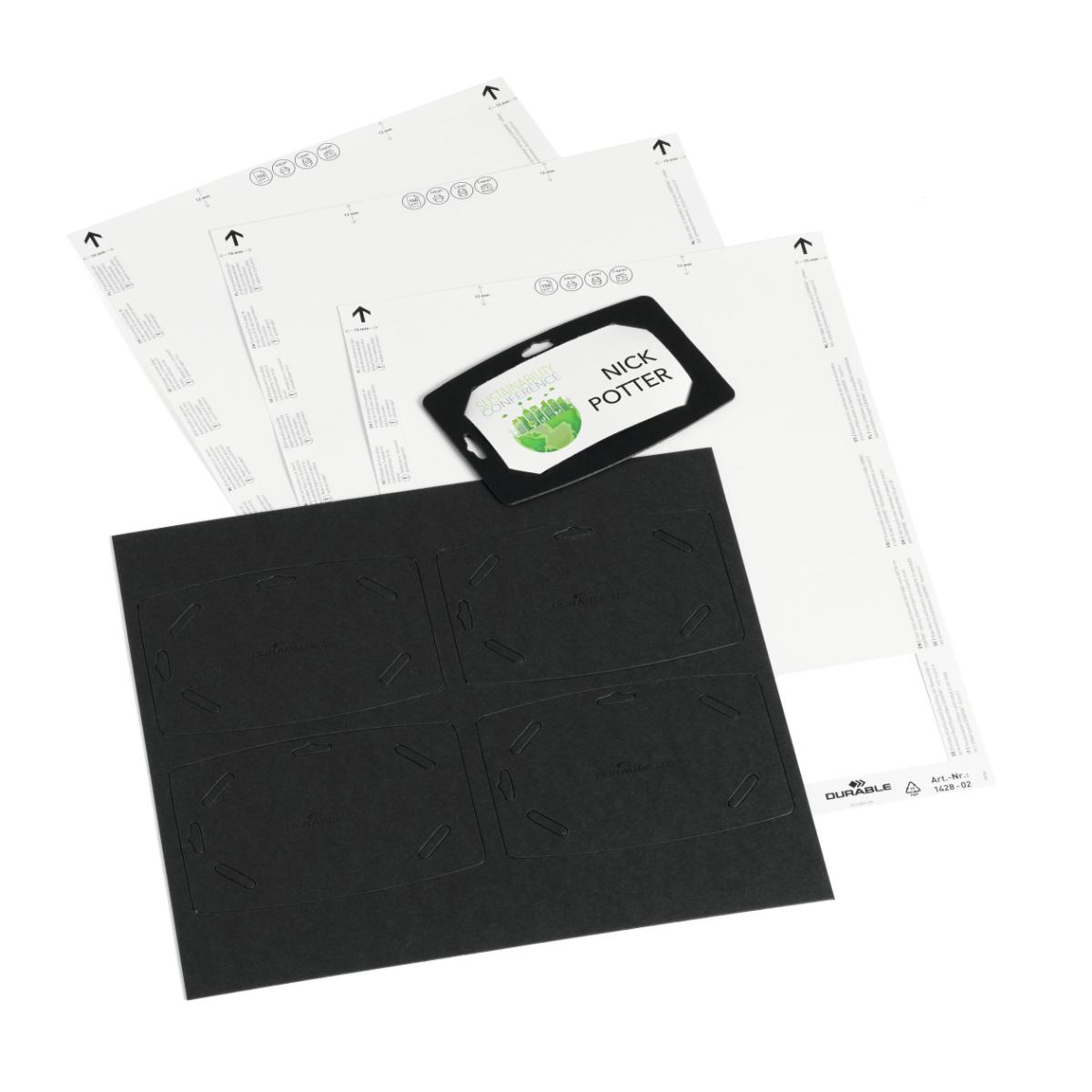 Navneskilte til konferencer og events bruges oftest kun én gang. DURABLEs navneskilte af 100% genbrugspapir bidrager til at reducere arrangementets miljøpåvirkning og sender et signal til deltagerne om, at arrangørerne tager hensyn til miljøet. Når konferencen er slut, sorteres navneskiltene som papiraffald. Dette sæt består af 20 sorte holdere af 315 g/m2 stiv pap. De kommer på et udskrivbart A4-ark med 4 forstansede navneskilte, der er lette at løsne fra arket. Der medfølger også 3 Badgemaker A4-ark med hvide etiketter til deltagernes navne, i alt 30 etiketter. Brug gratisprogrammet DURAPRINT®, som findes på www.duraprint.dk, til at skabe og udskrive flotte navneetiketter. Brug skiltet i stående eller liggende format sammen med et halssnor i et miljøvenligt materiale. Sættet leveres i en solid papkuvert. Pakken indeholder 20 stk. Mål på navneskiltet: 78 x 114 mm, 1 mm tyk Mål på navneetiketten: 54×90 mm Tilbehør:Ekstra Badgemaker® etiketter på A4-ark til udskrivning i printer, artikel nr. 142802 halssnor af bambus, art.nr. 824001 eller halssnor af rPET, art.nr. 8241 i flere farver.