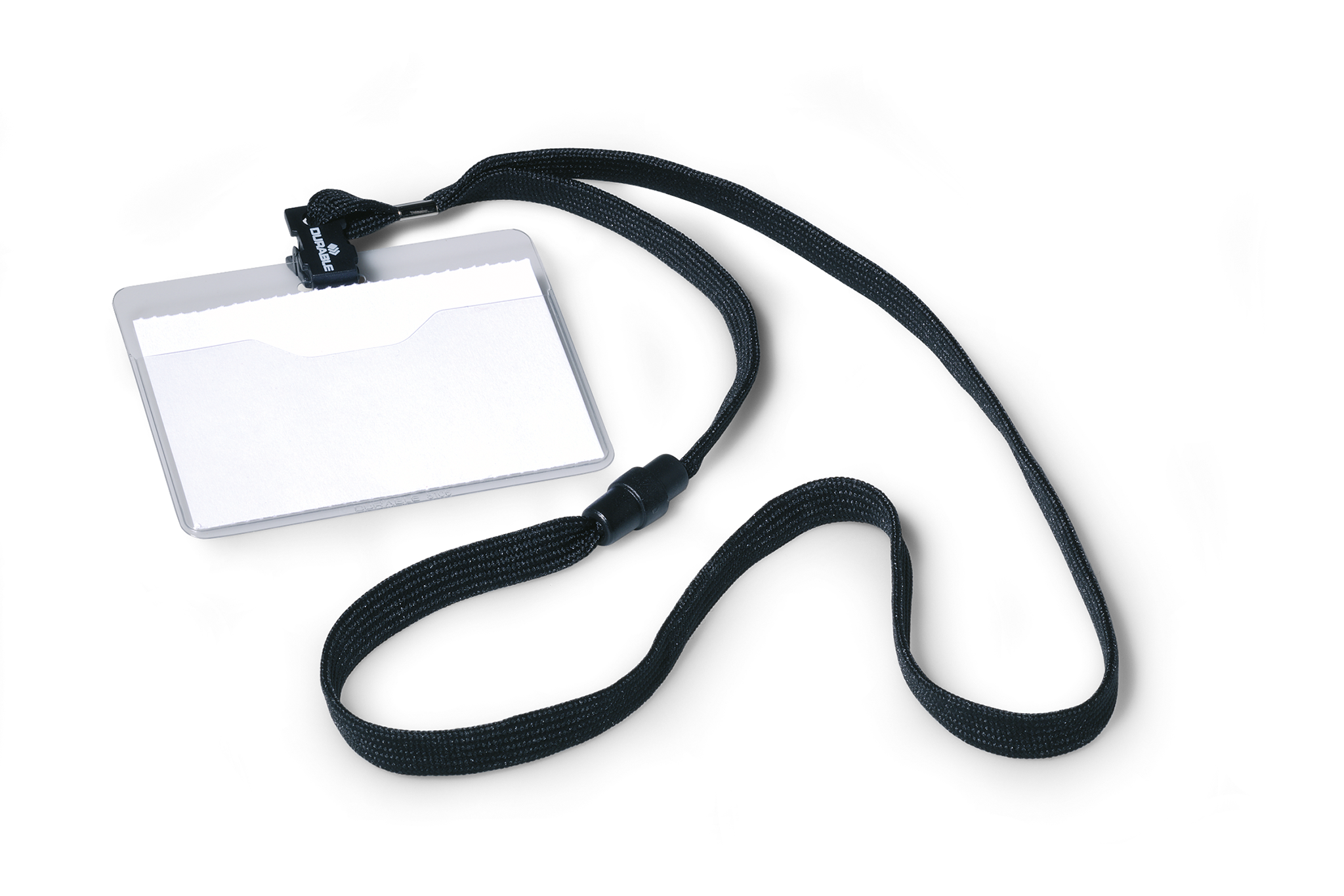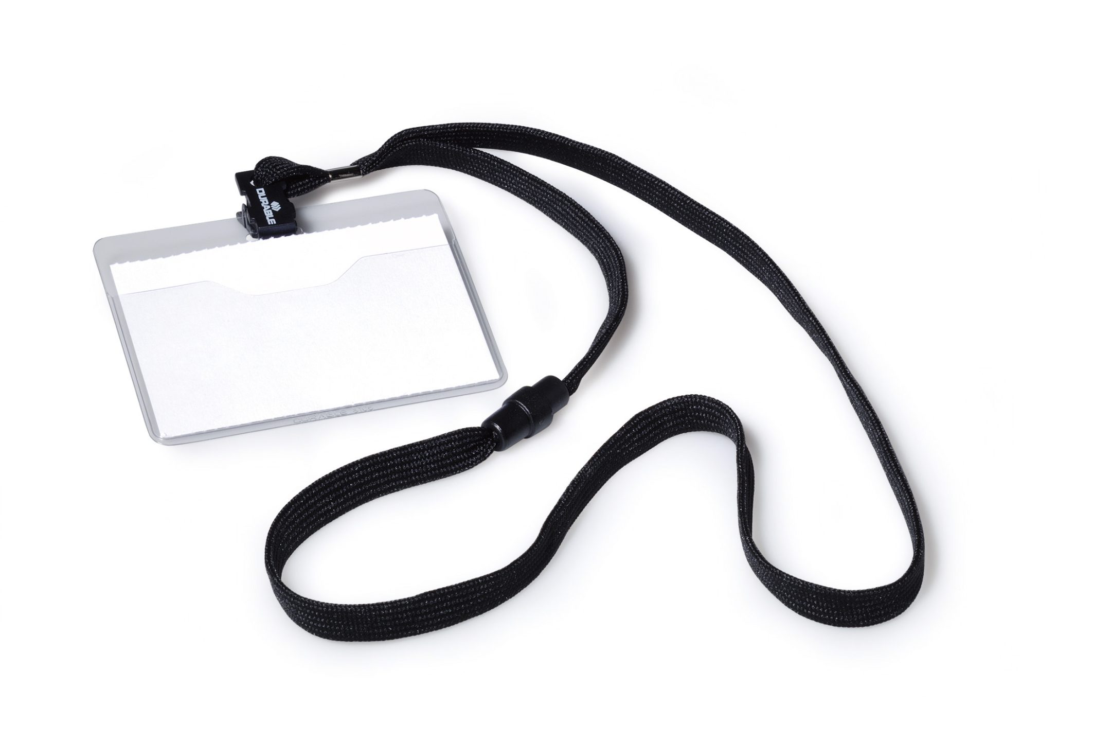 Navneskilt med halssnor 60×90 mmNavneskilt af robust plast med åben top og halssnor. Tværformat. 10 stk.
