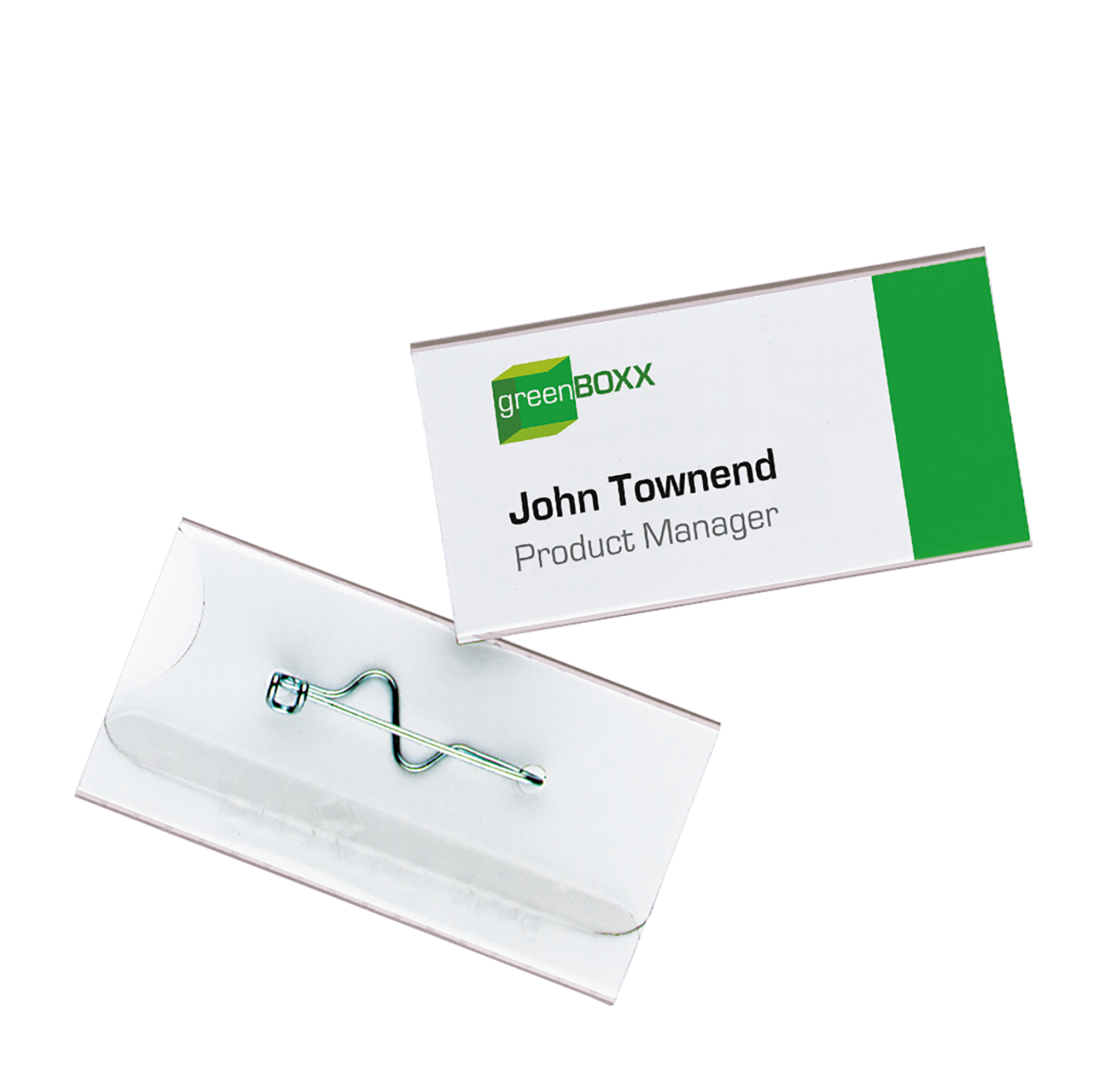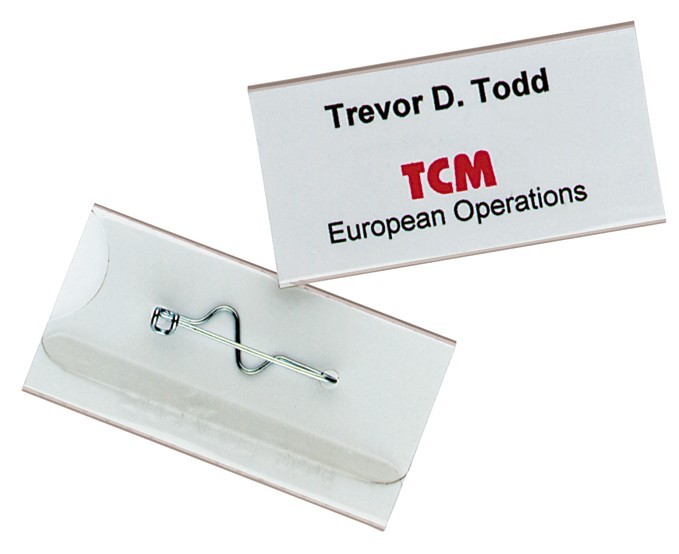 Navneskilt med buet sikkerhedsnål, der tillader navneskilt afholdt i position. Nålespidsen er skjult for at forhindre skader på tøj. Enkelt at udskifte navneetiketter ved hjælp af tommegreb. Indstik medfølger. Mål indstik: 30x60mm (HxB). Indstiksetiket på A4 ark til udskrivning i printer kan bestilles separat (varenr. 145102). Design selv en personlig designet kongresmærke med gratis skabelon på www.duraprint.dk