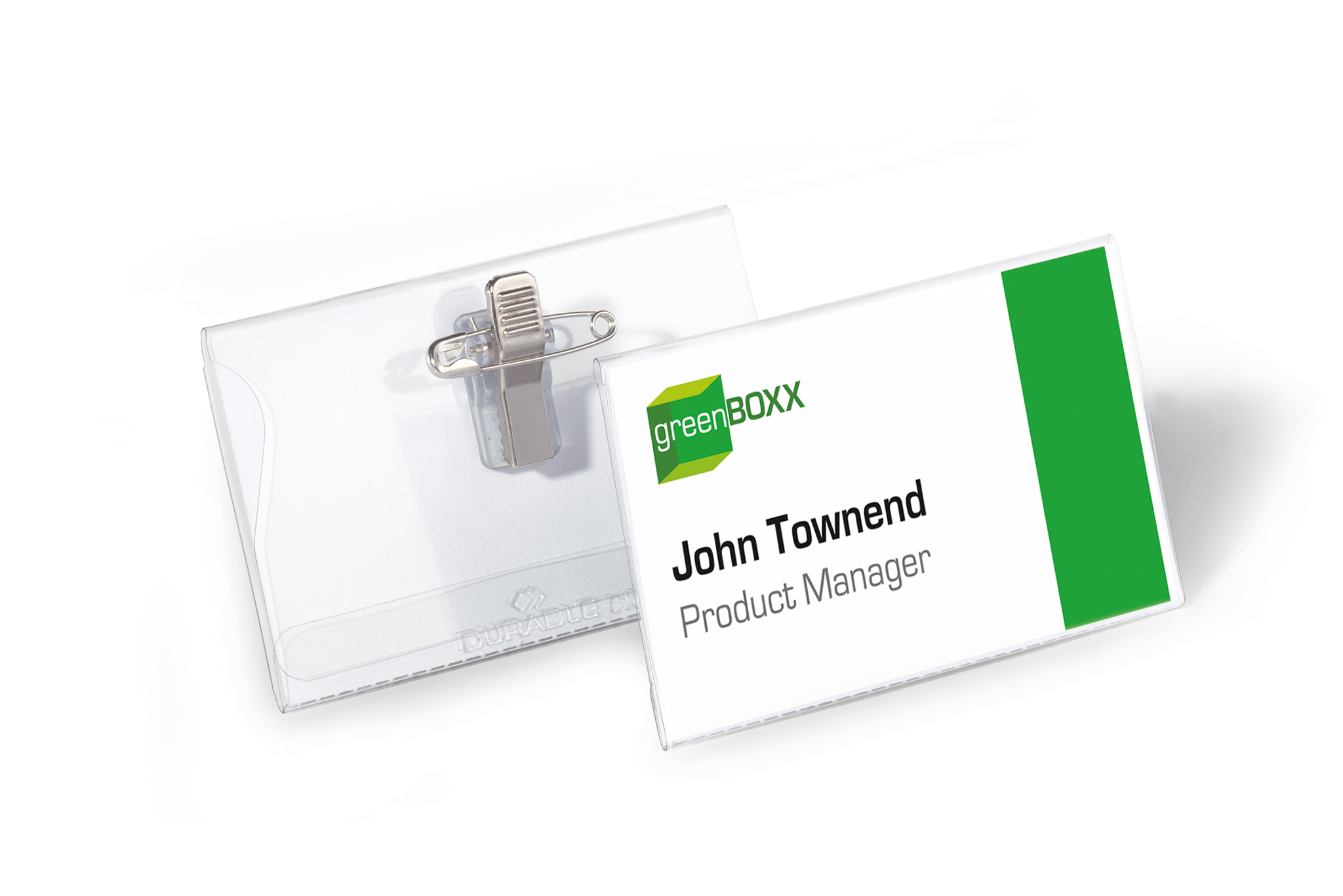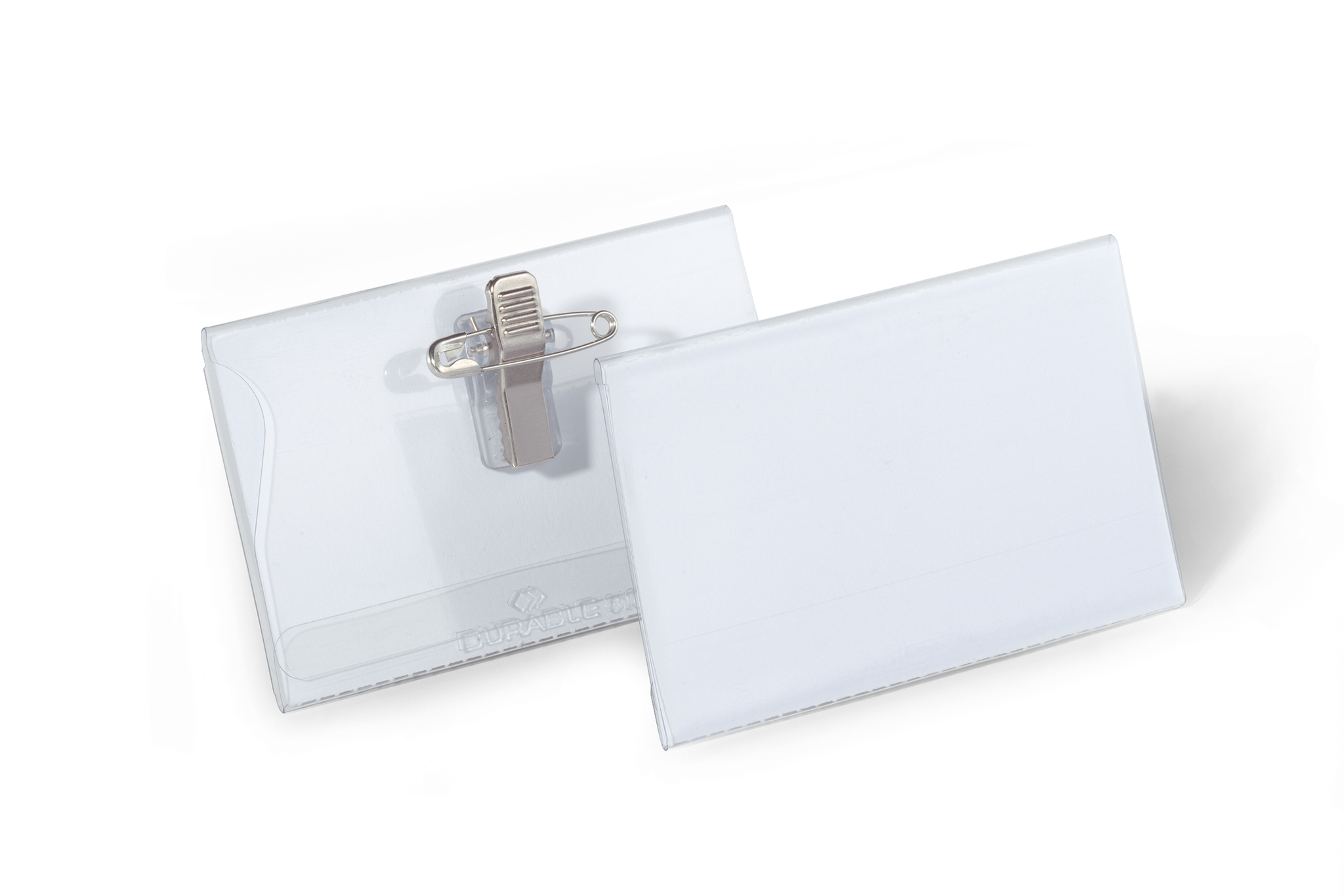 Navneskilt med kombiklemme 54x90mm (HxB). Kombineret sikkerhedsnål/klemme giver valgmulighed for at fastsætte på tøjet. Med tommegreb som gør det enkelt at udskifte indstiksetiketten. Indstik medfølger. Mål indstik: 54x90m (HxB). Indstiksetiket på A4 ark til udskrivning i printer kan bestilles separat (Durable art nr 145502). Design selv et personlig designet kongresmærke med gratis skabelon på www.duraprint.dk